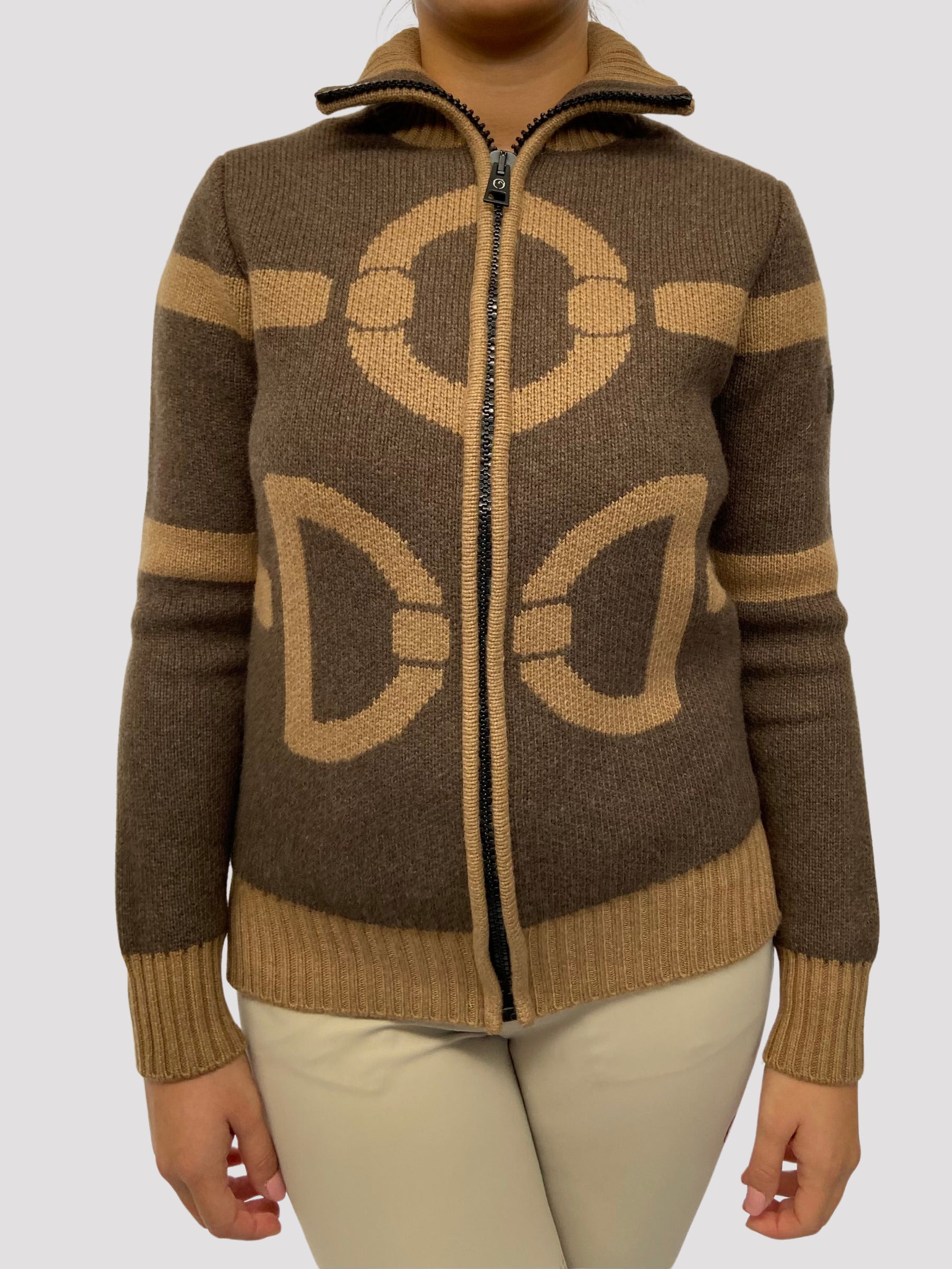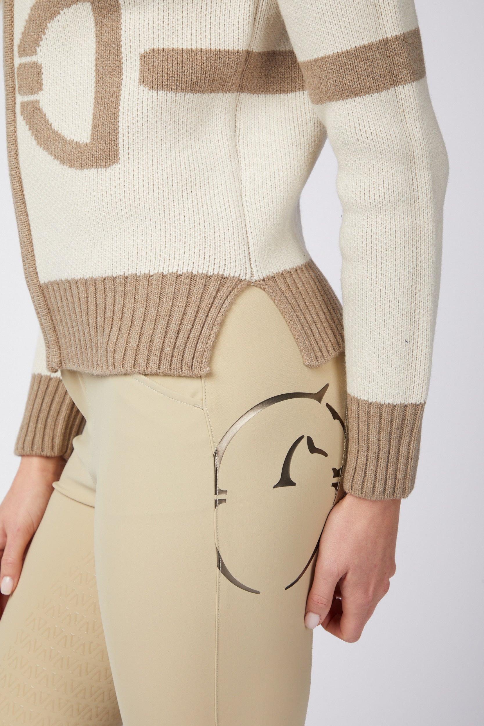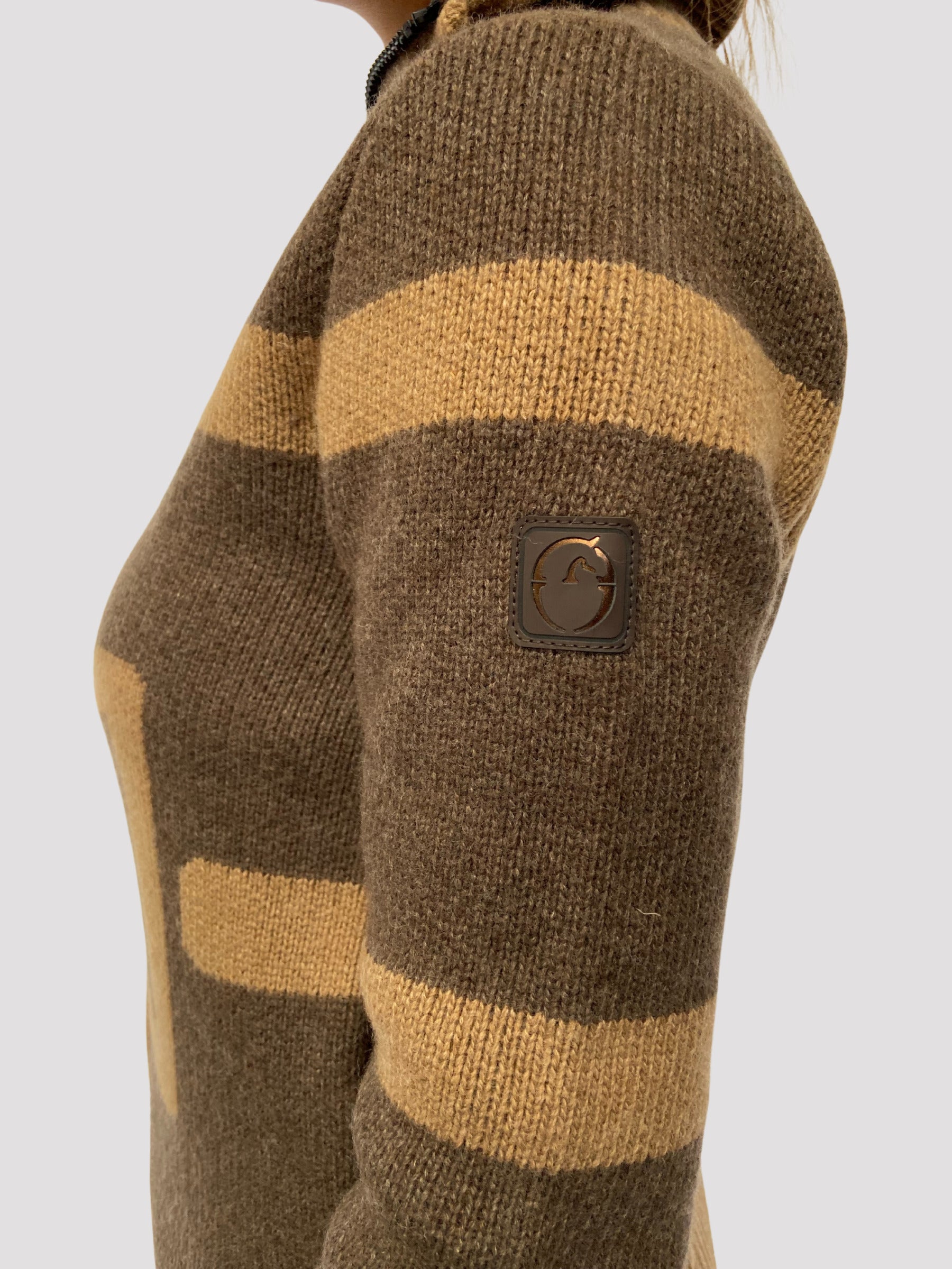 Maglione da donna con cerniera e dettaglio equestre.