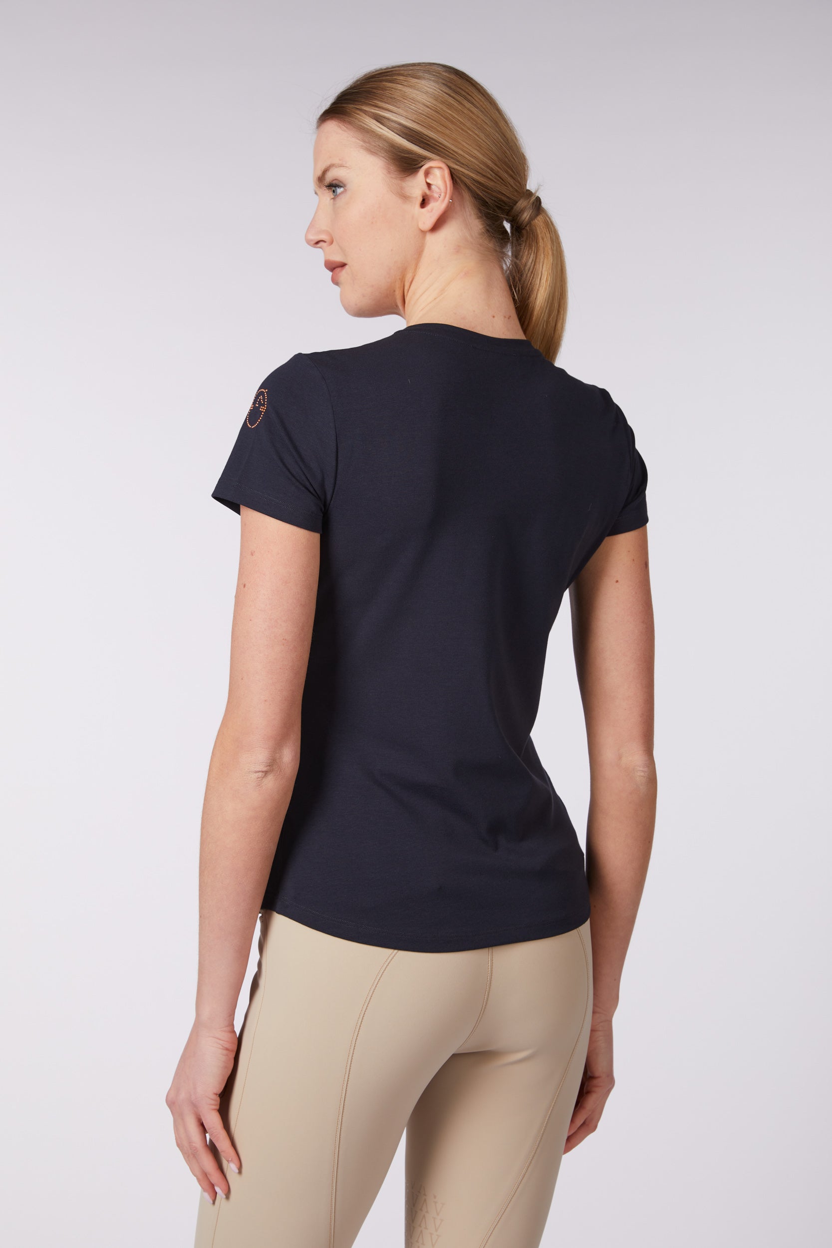 T-shirt da donna realizzata in cotone bielastico di qualità, traspirante e confortevole per l'allenamento quotidiano. Stampa frontale arricchita da numerose mini borchie per donare maggiore lucentezza e femminilità al capo.