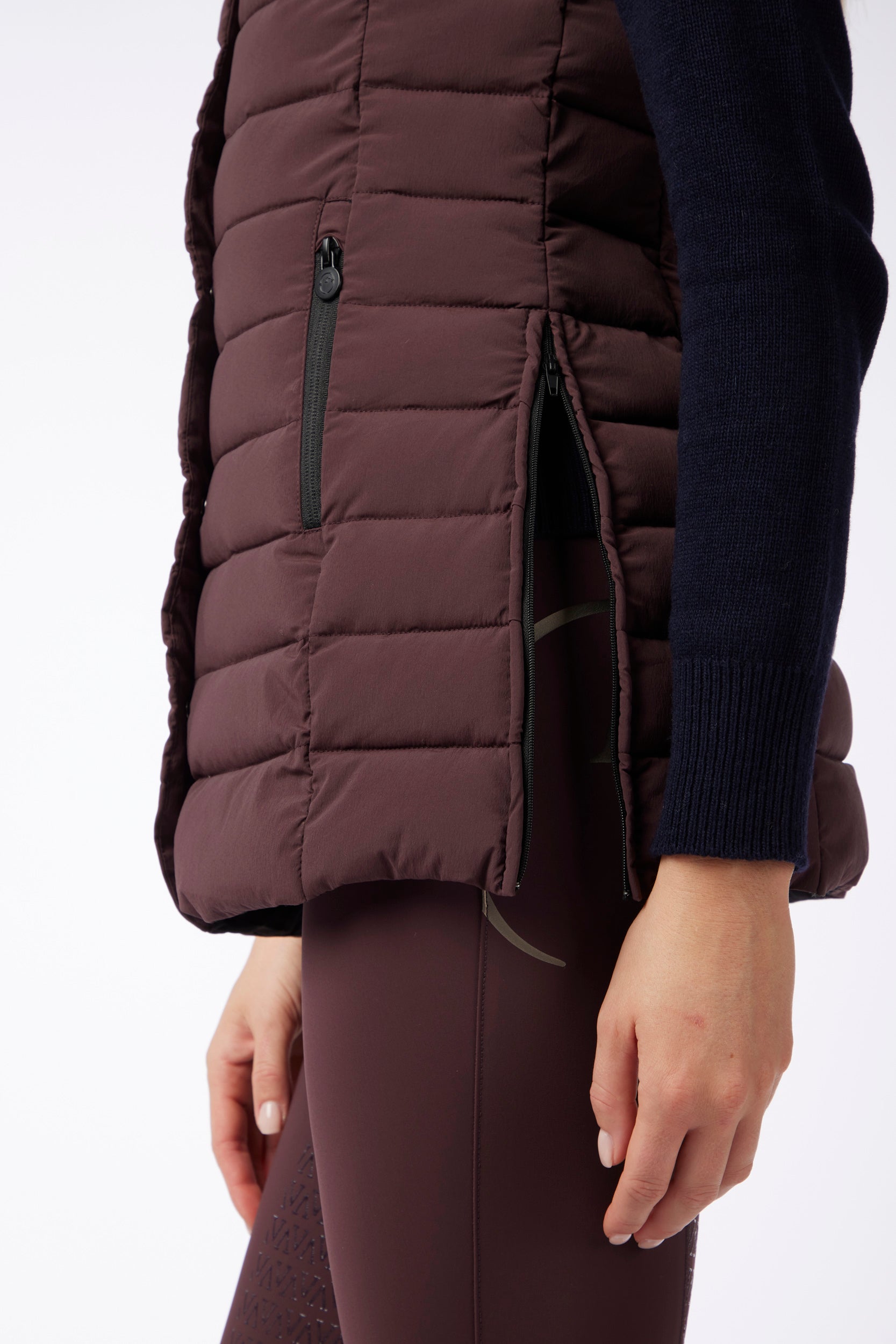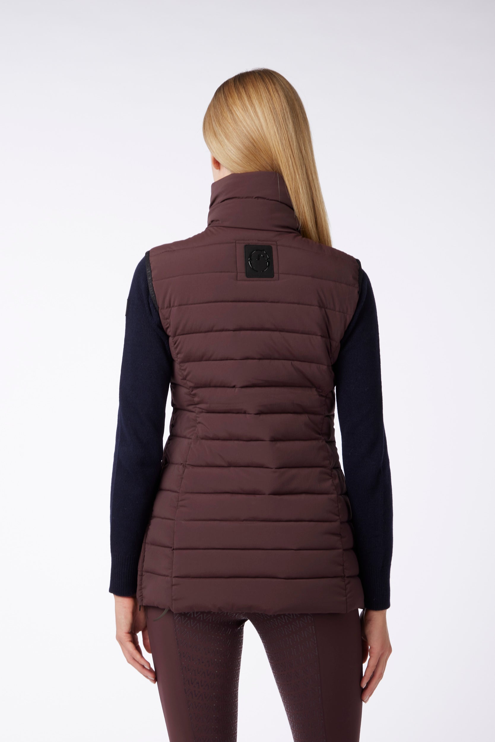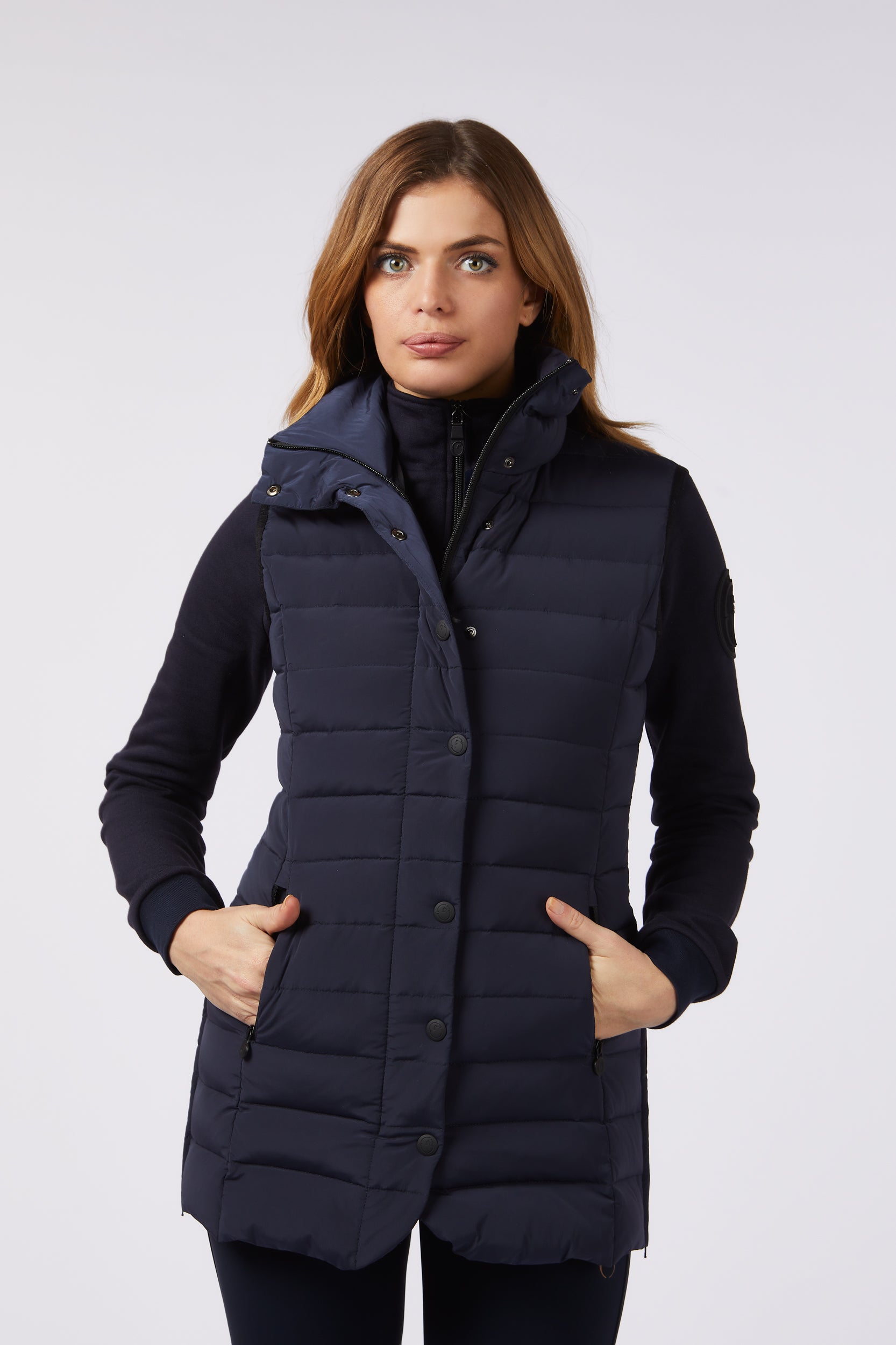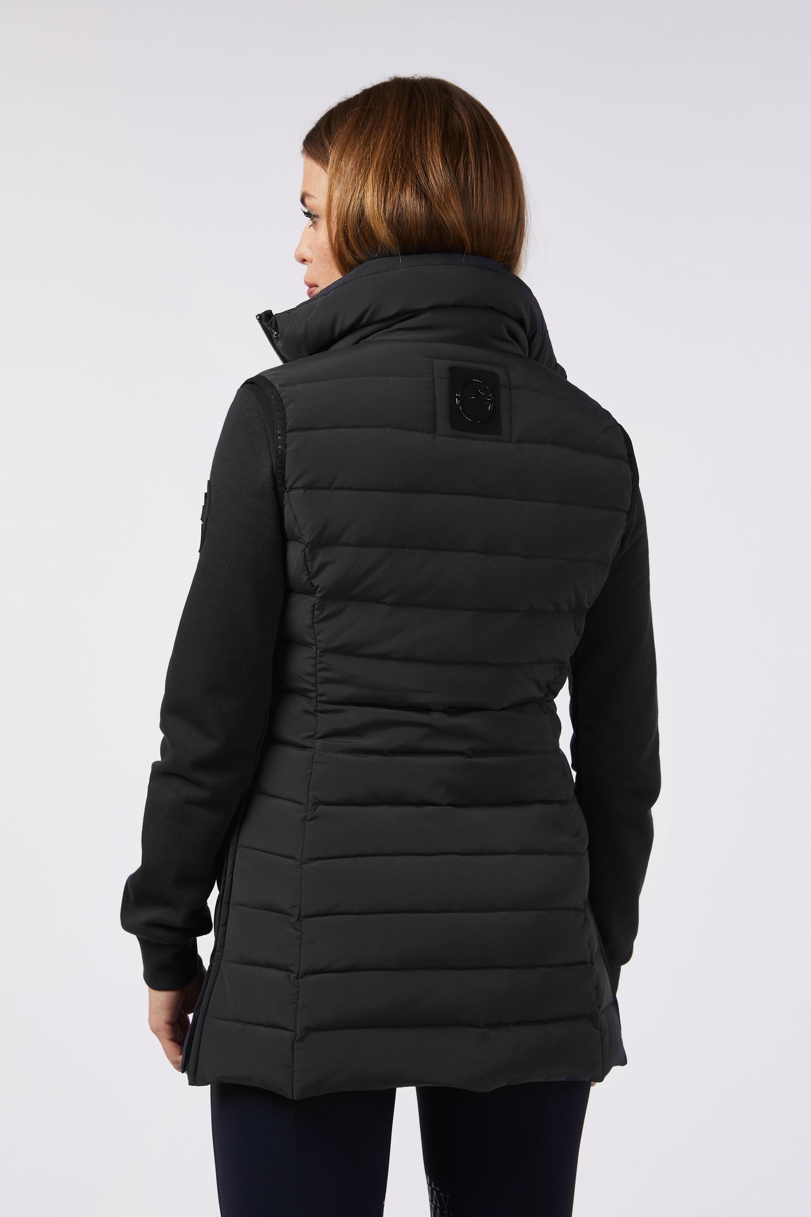 Gilet lungo da donna in tessuto idrorepellente e antivento, imbottito in piuma d'oca. Chiusura con bottoni metallici e zip. Nella parte centrale posteriore è cucita una toppa nera lucida. Le zip laterali consentono un maggiore comfort durante ogni tipo di movimento.