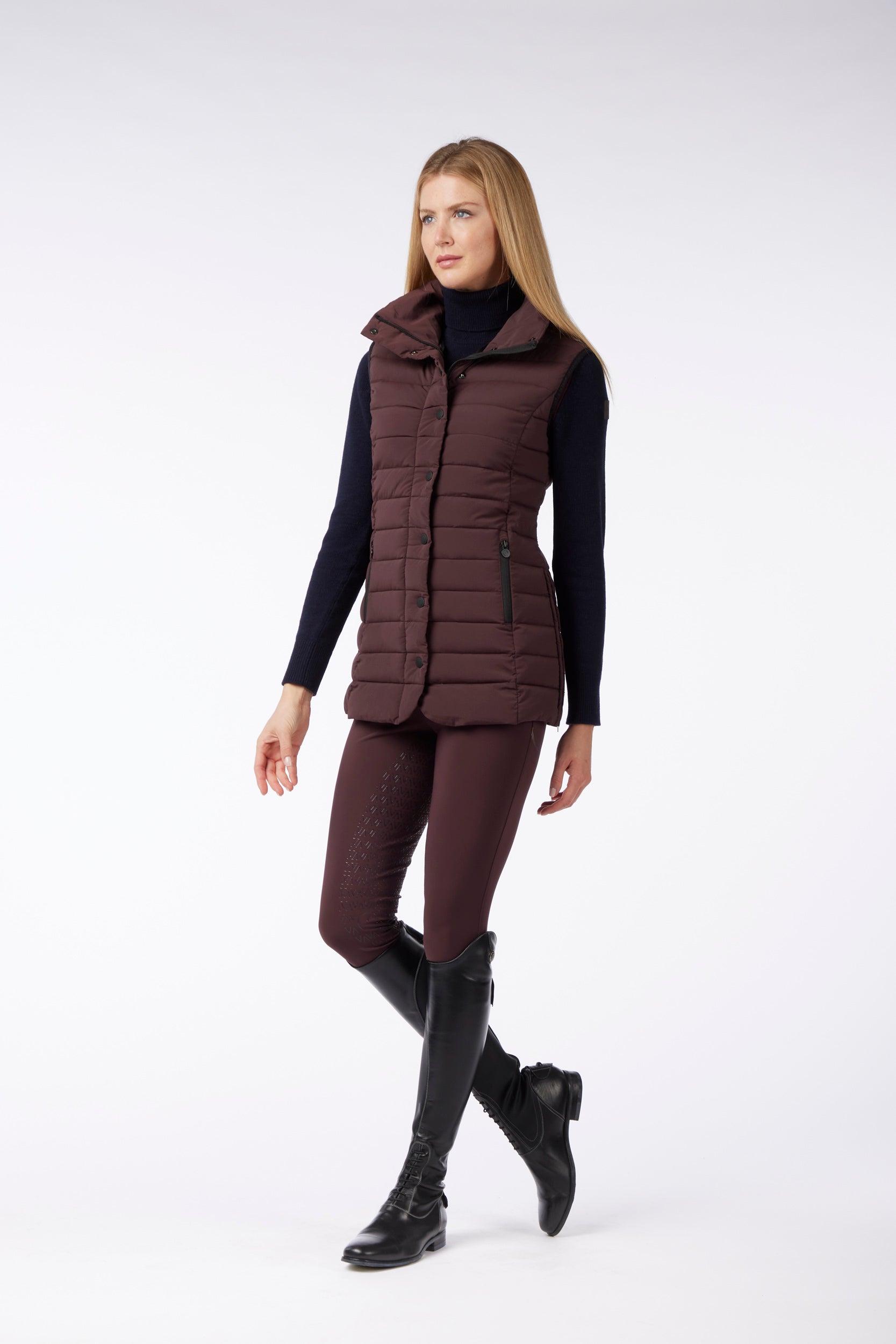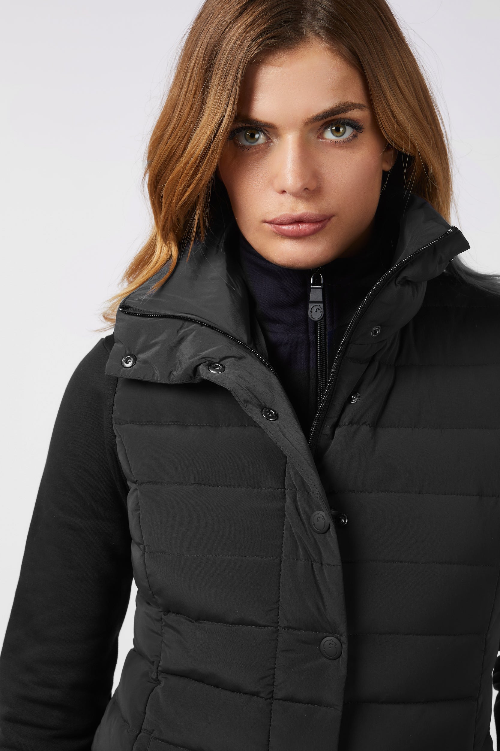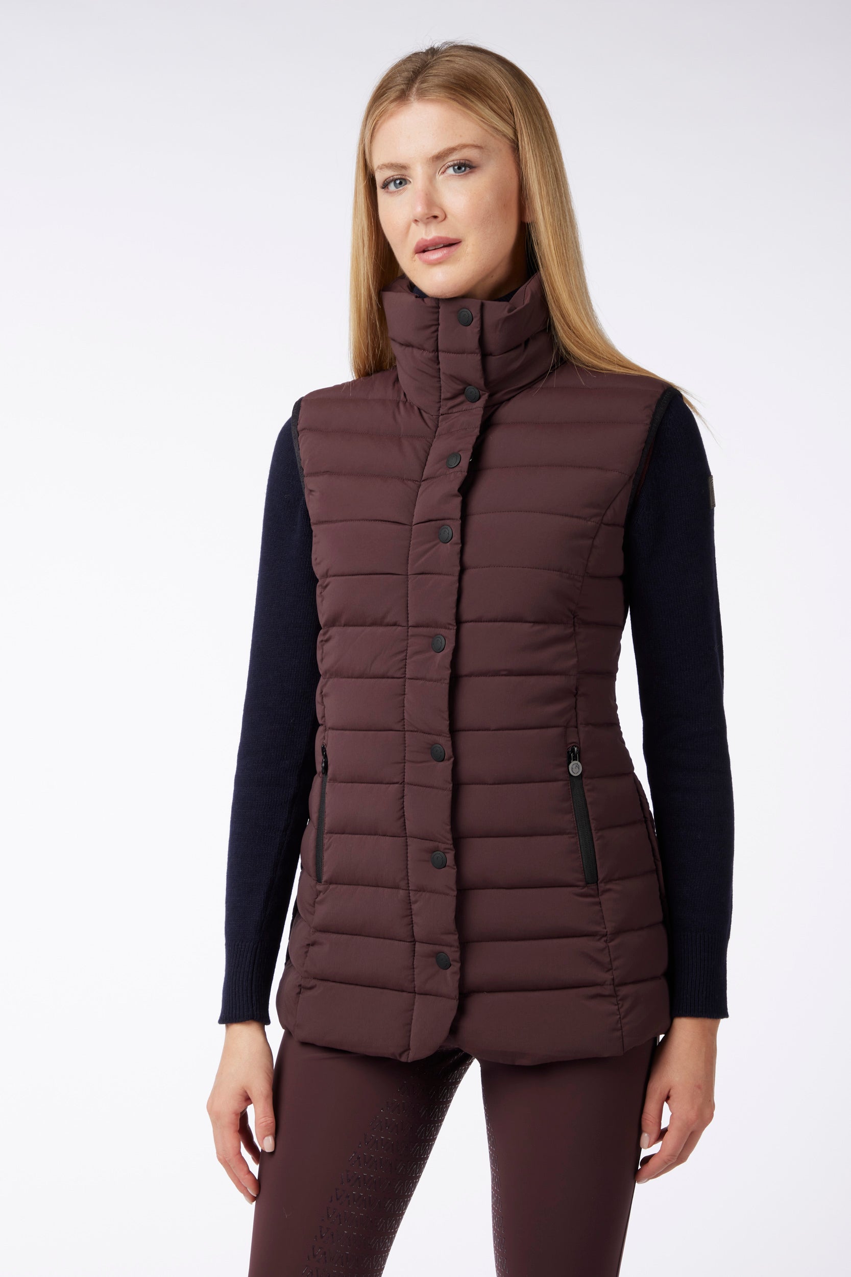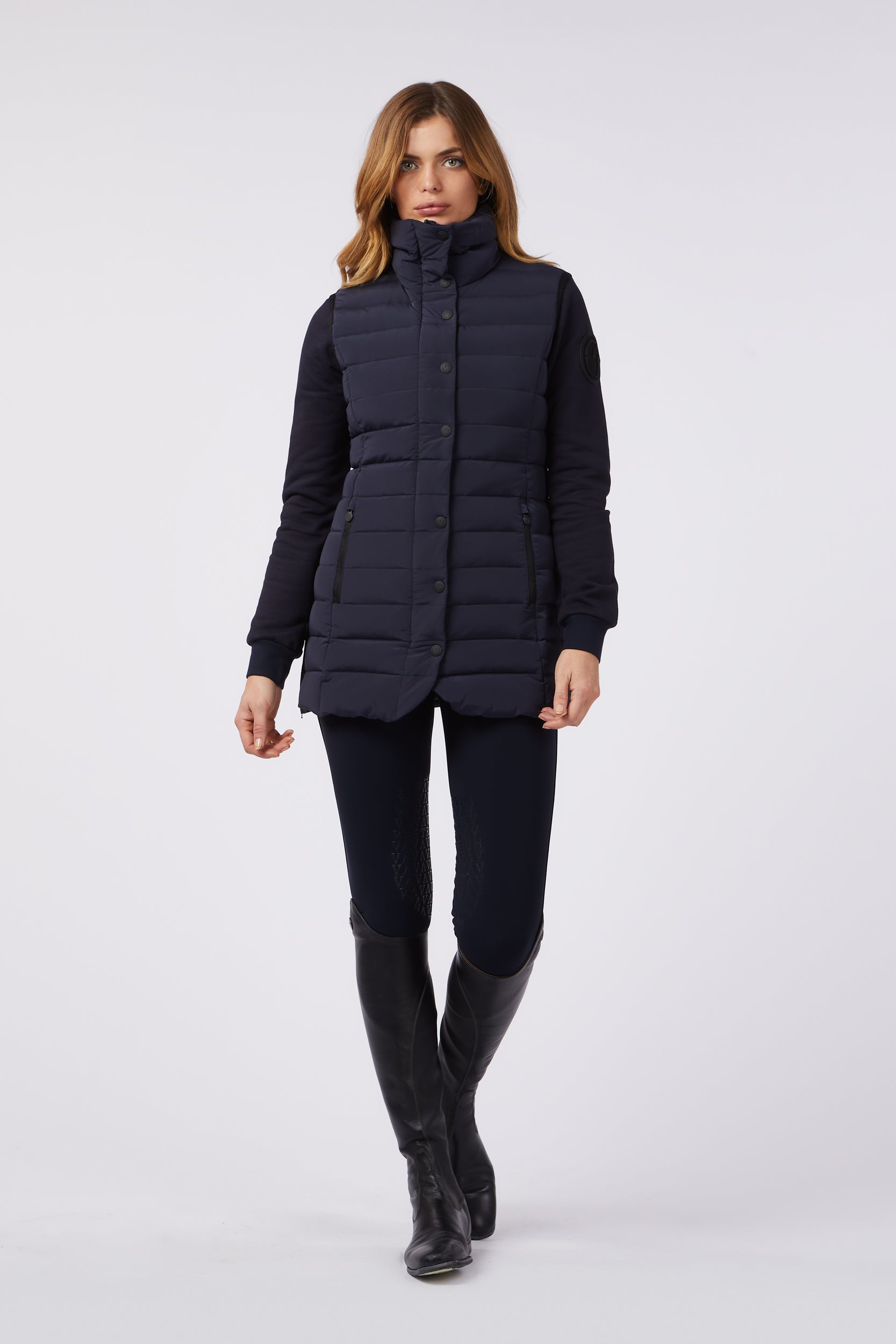 Gilet lungo da donna in tessuto idrorepellente e antivento, imbottito in piuma d'oca. Chiusura con bottoni metallici e zip. Nella parte centrale posteriore è cucita una toppa nera lucida. Le zip laterali consentono un maggiore comfort durante ogni tipo di movimento.