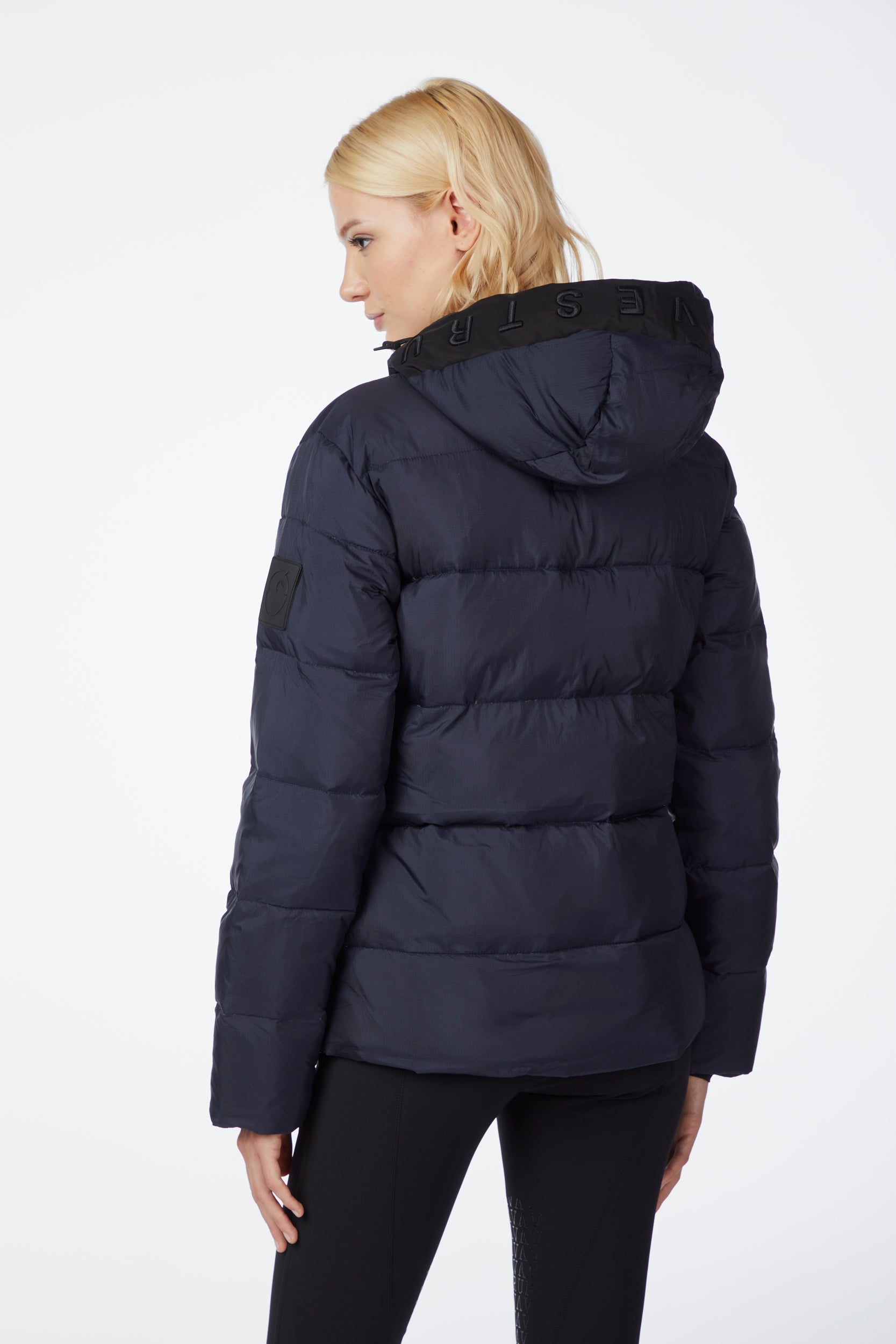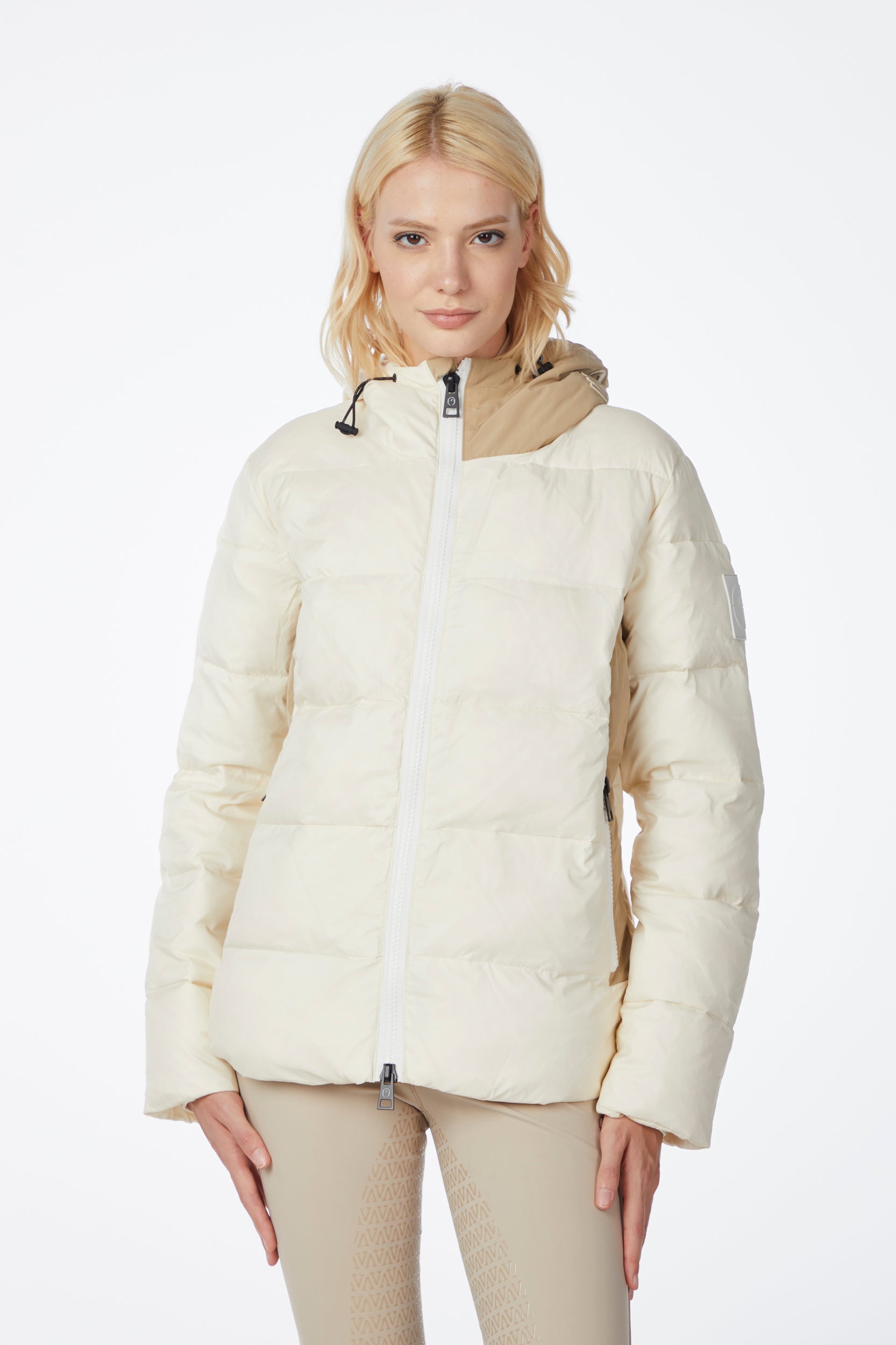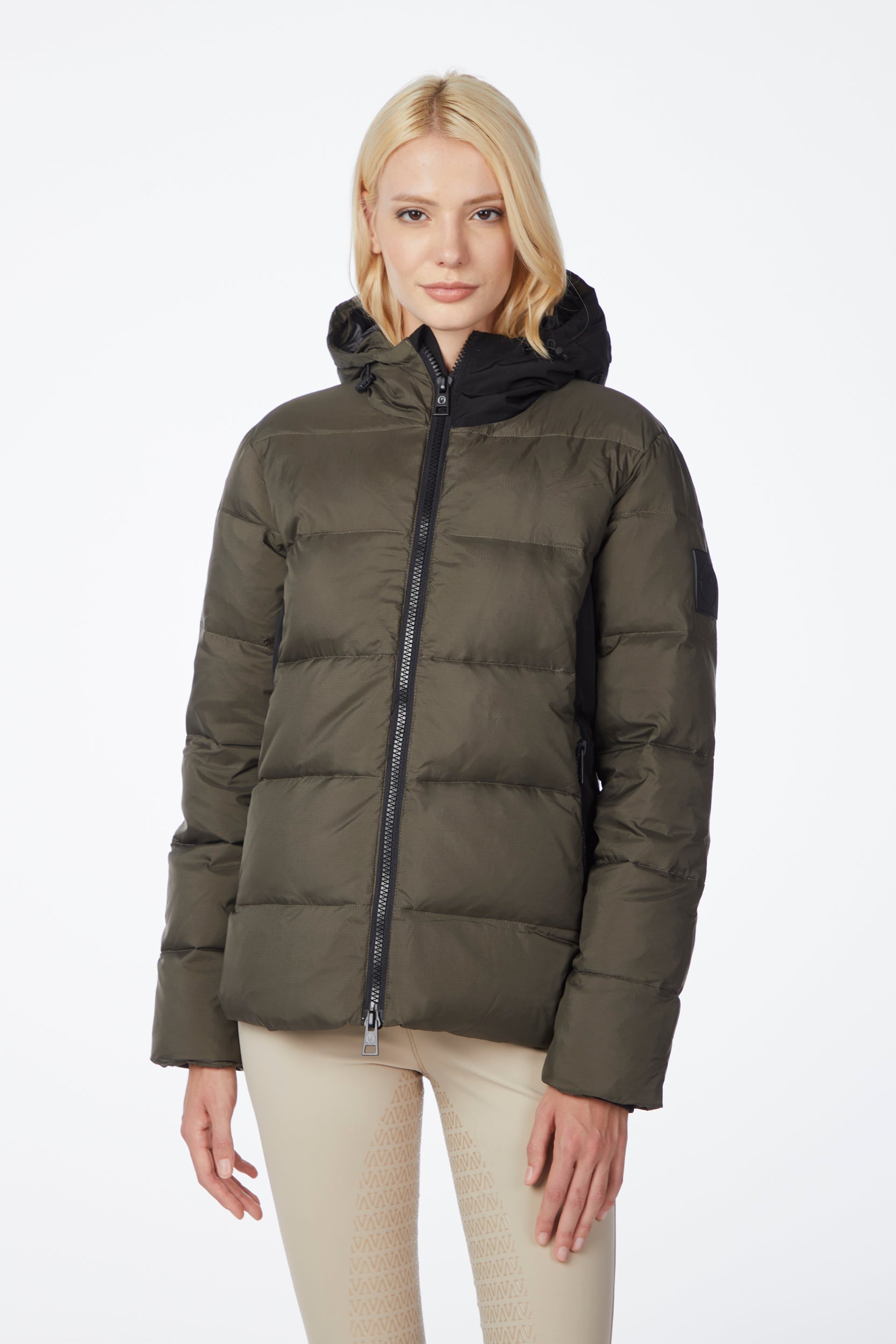Women's jacket made of water-repellent and windproof technical fabric, is designed to offer protection and comfort during the cold season. The side panels in memory fabric enhance the line of the garment, offering structure and softness at the same time. The contrast hood is embellished with a tone-on-tone lettering embroidery, while the inner lining features a contrasting lettering print. Feather padding.