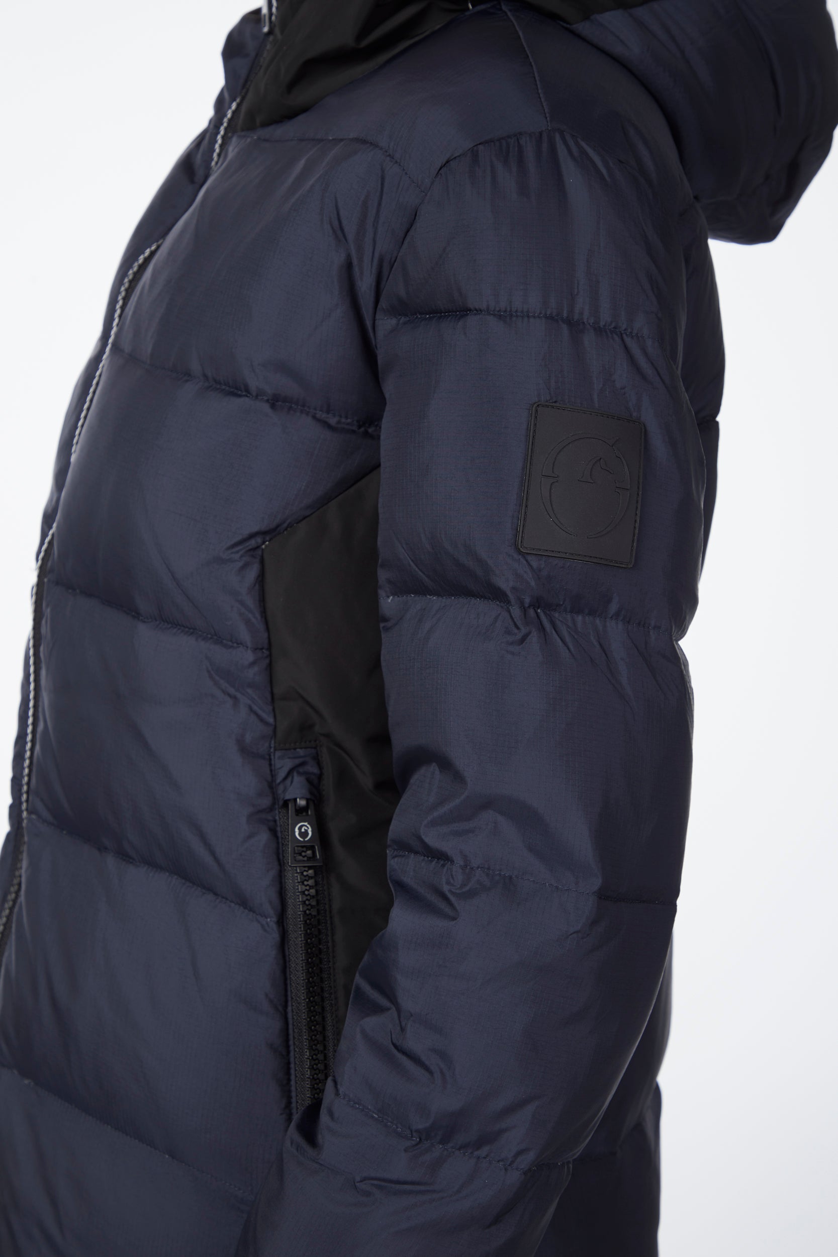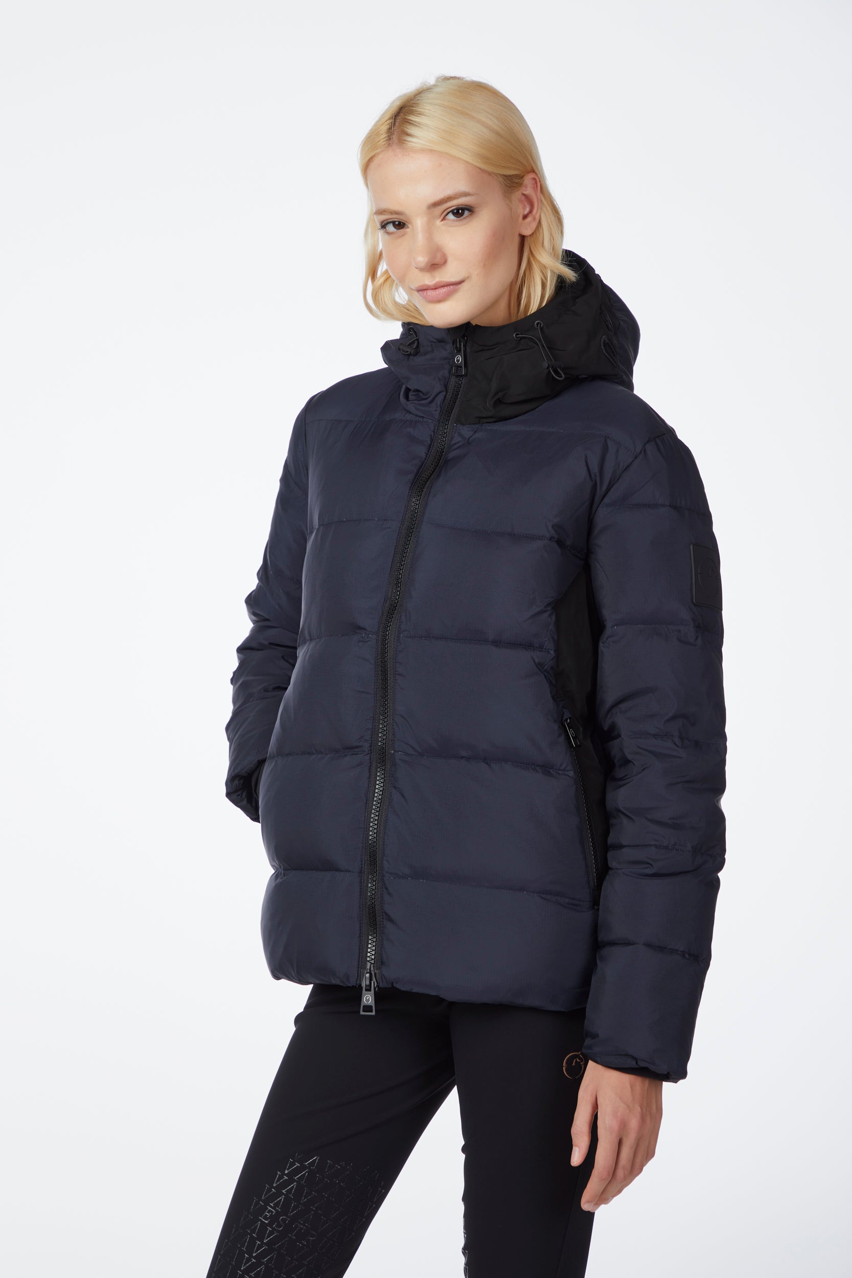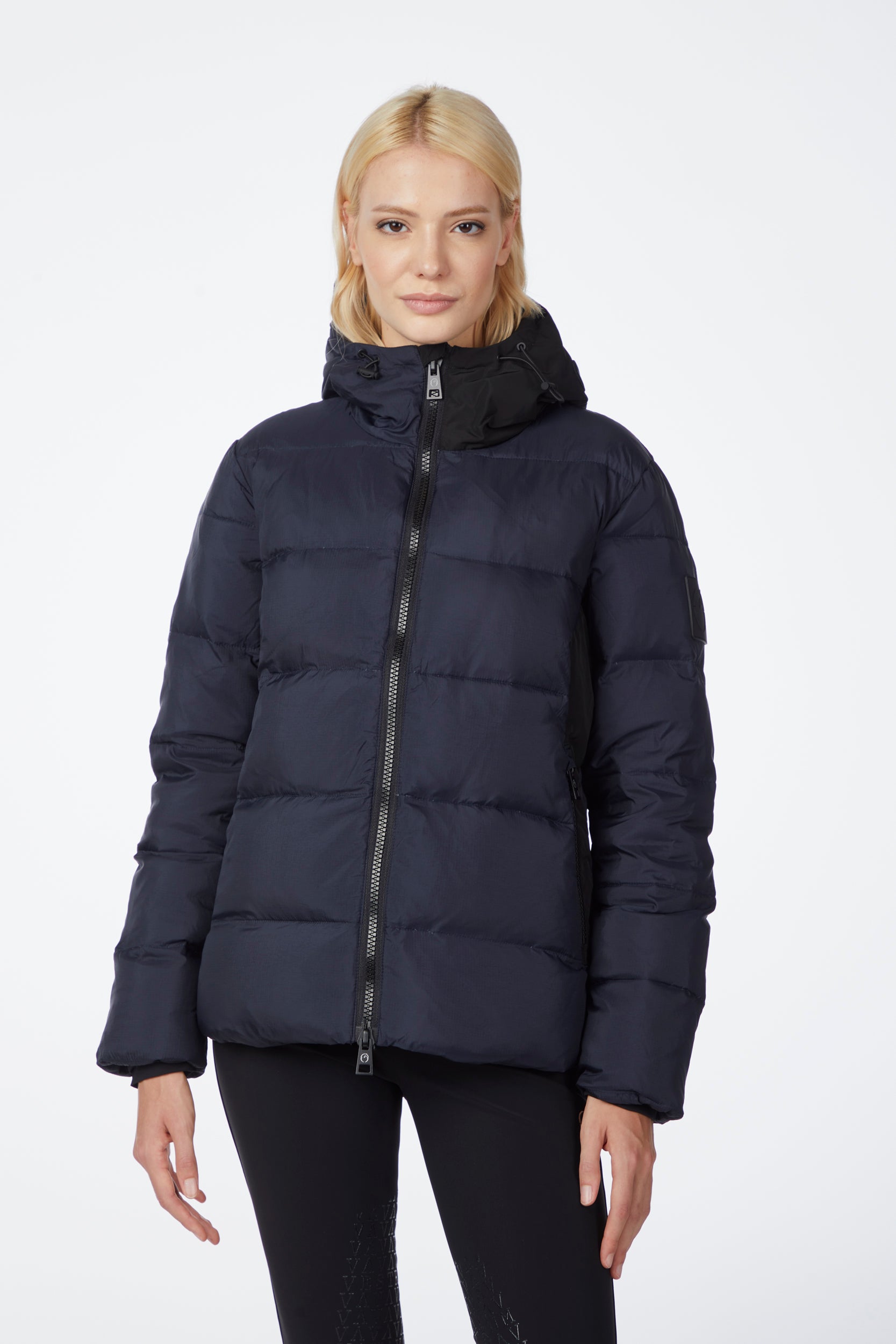 Women's jacket made of water-repellent and windproof technical fabric, is designed to offer protection and comfort during the cold season. The side panels in memory fabric enhance the line of the garment, offering structure and softness at the same time. The contrast hood is embellished with a tone-on-tone lettering embroidery, while the inner lining features a contrasting lettering print. Feather padding.