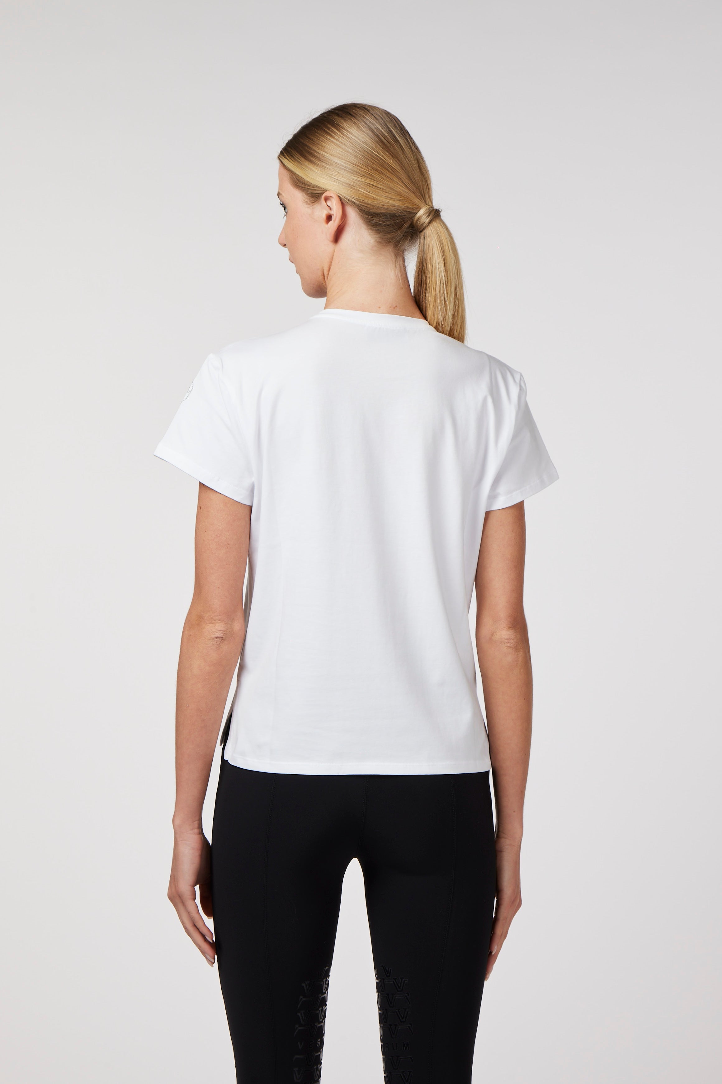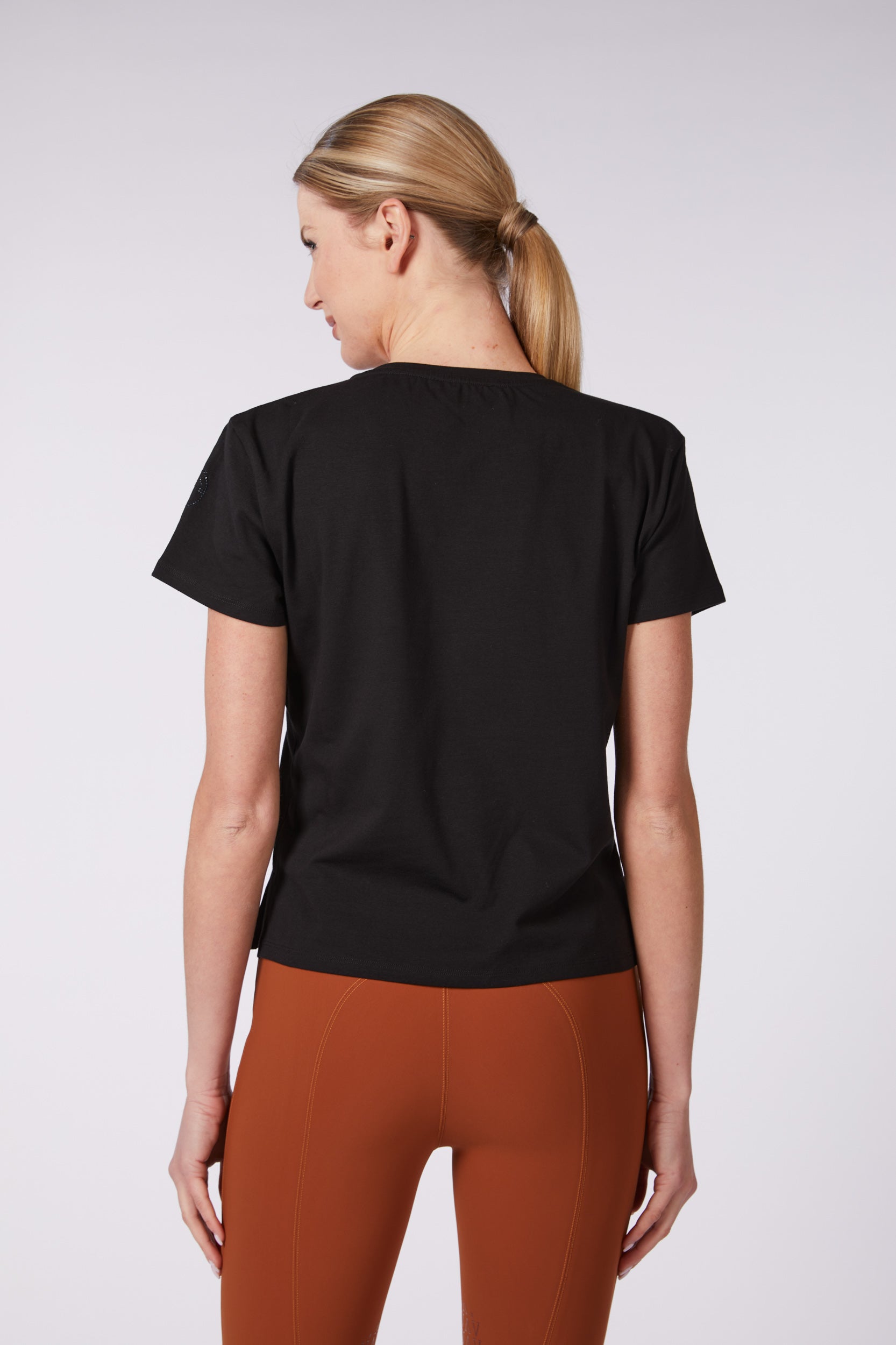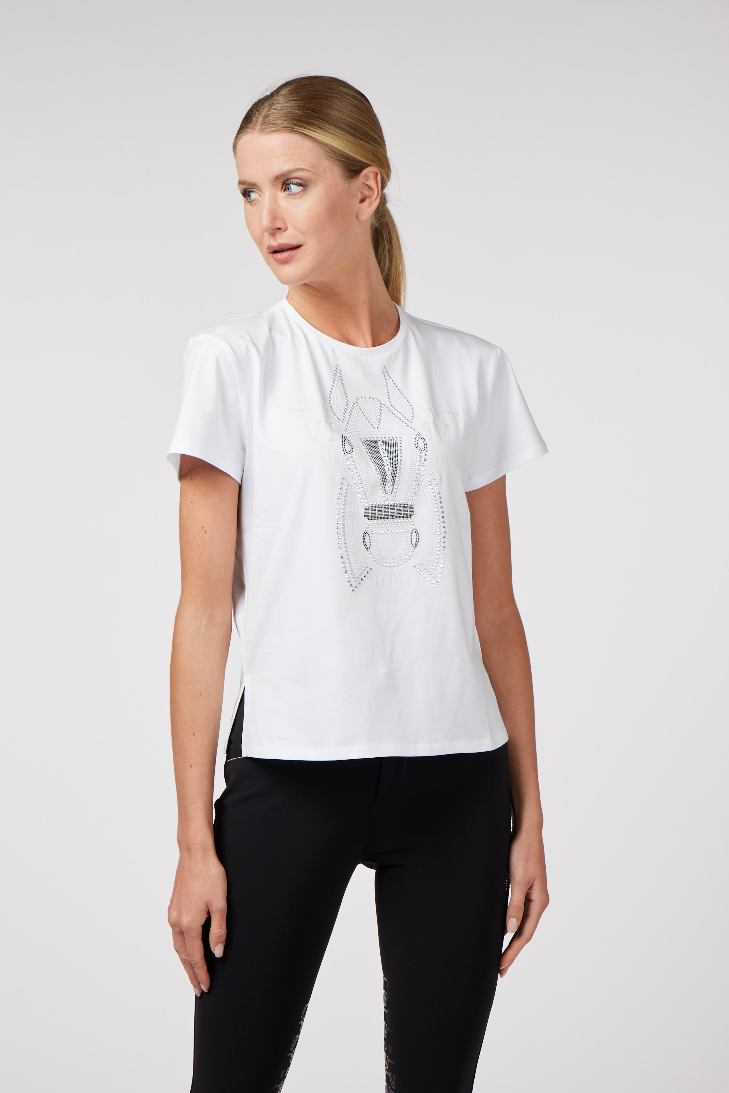 Women's T-shirt made from quality bi-elastic cotton, breathable and comfortable for daily workout. Front print with equestrian design, embellished with mini-studs to give more elegance and femininity to the garment.