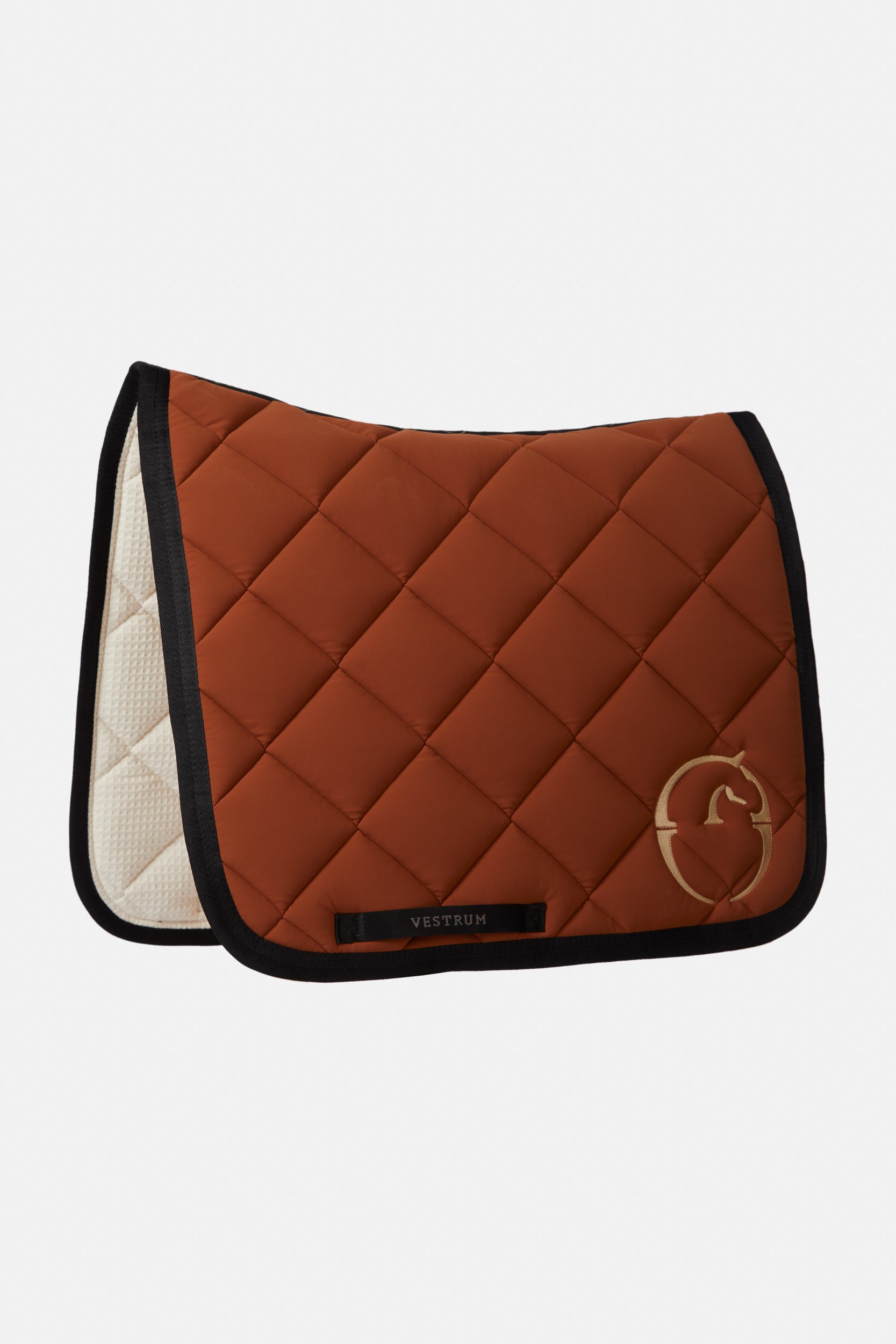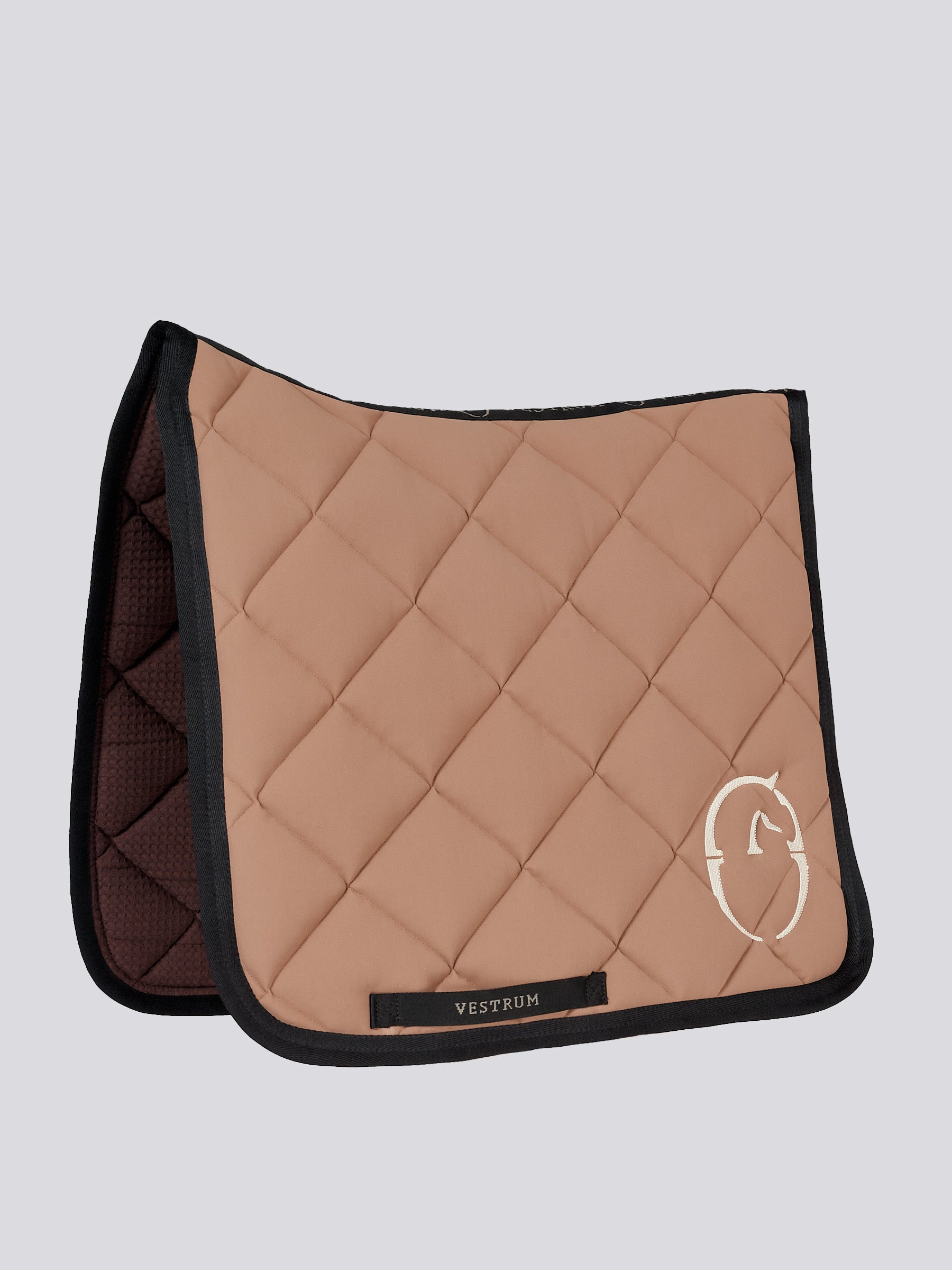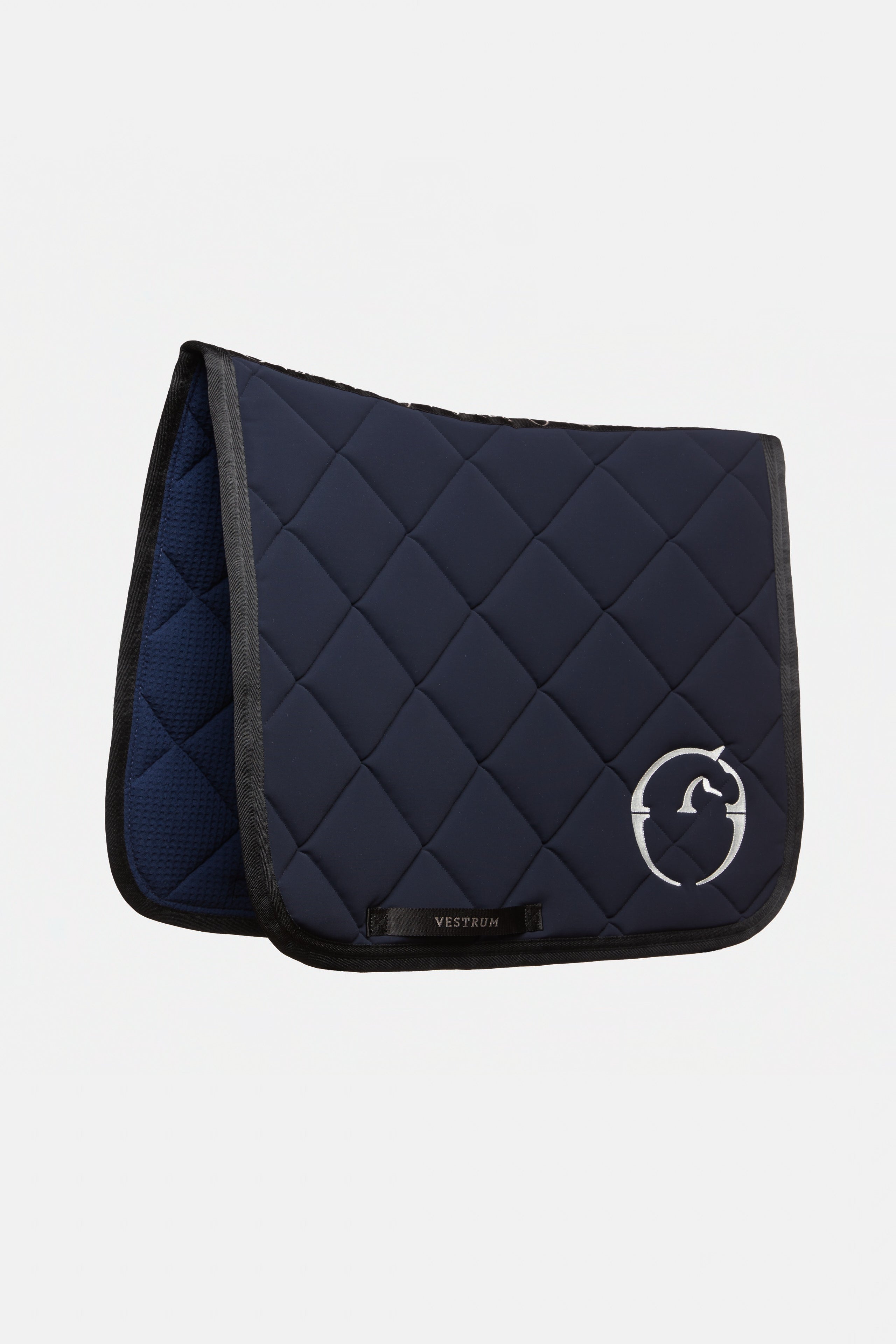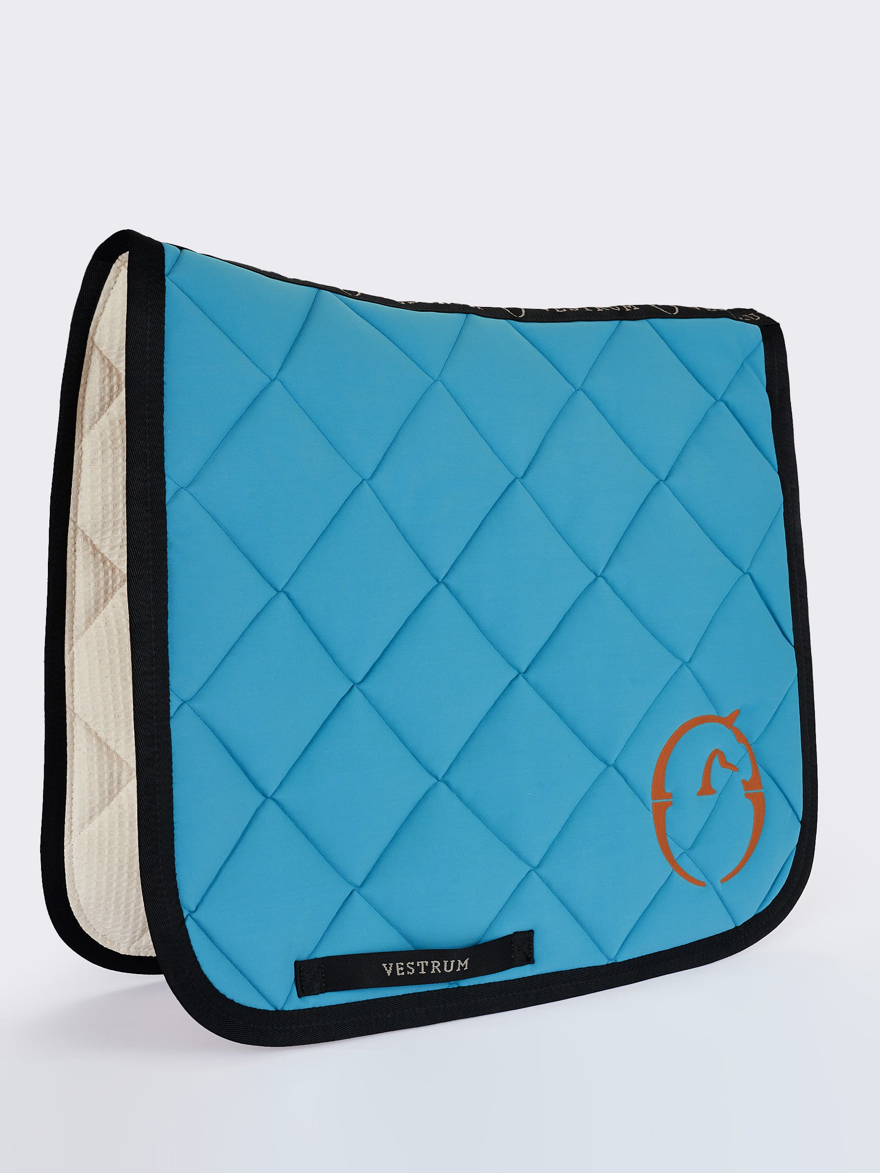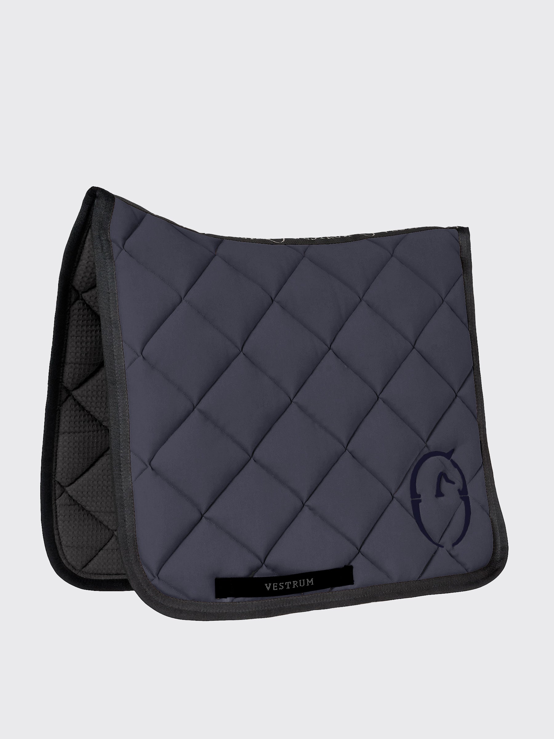 Dressage saddle pad in its most technical form and manufacture. Helsinki is made of padded and breathable high-tech bi-stretch fabrics, the edges are tone on tone or in contrast. The inside is made of 100% cotton with a sponge structure to ensure a gentle grip on the horse's back. Label with Vestrum writing on both sides and logo sewn on one side in shiny polyester.
