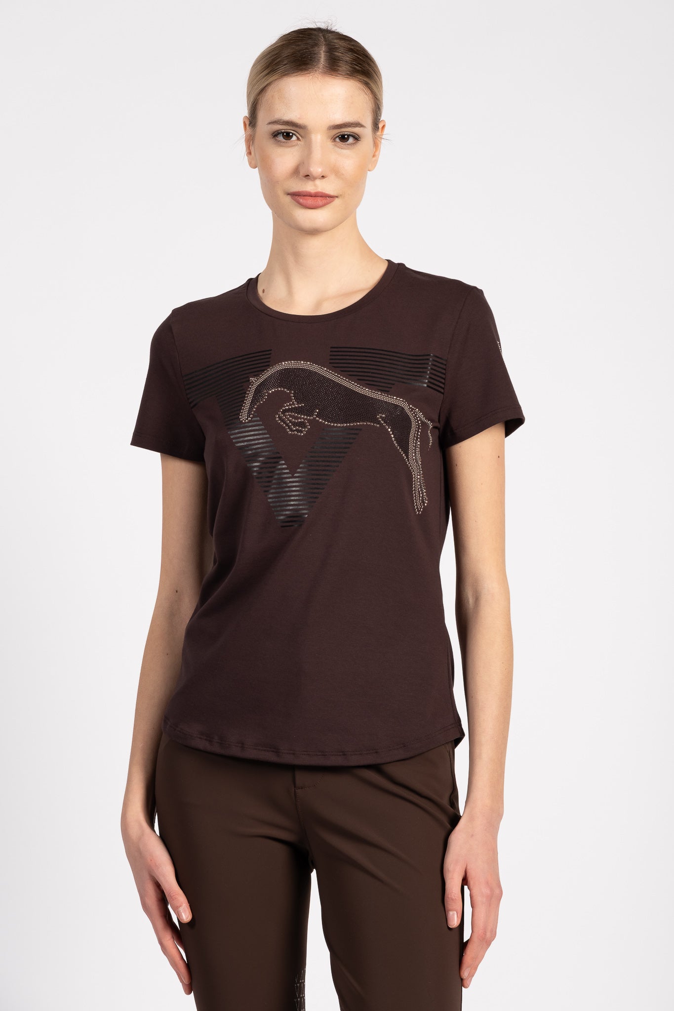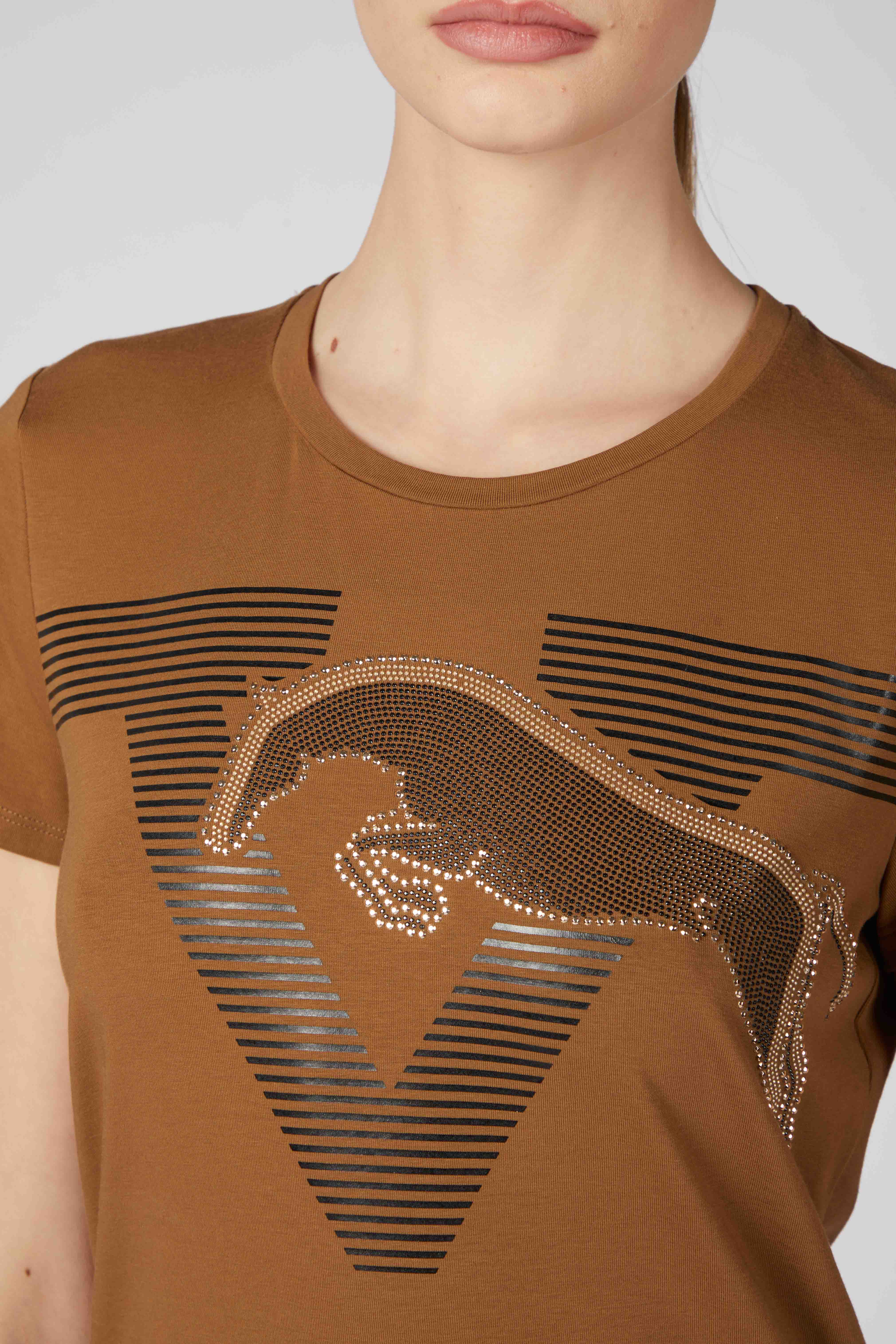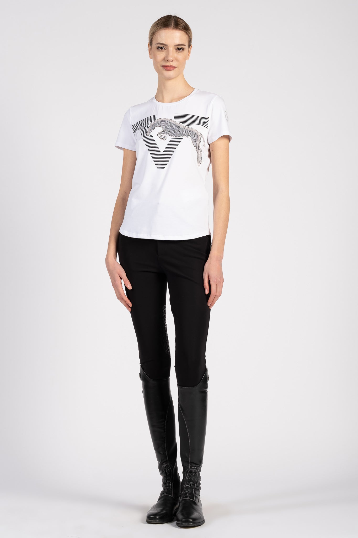 Interlaken women's T-shirt is made of cotton and features a shiny graphic on the front depicting a horse jumping over the "V" of Vestrum, entirely formed by two-tone studs that add character and movement to the garment. The Vestrum logo on the left sleeve, also made of micro studs, completes the design with a bright and distinctive detail. With a comfortable fit and clean lines, the Interlaken T-shirt is an original garment that brings an equestrian and feminine touch to days at the stables or in your free time.
