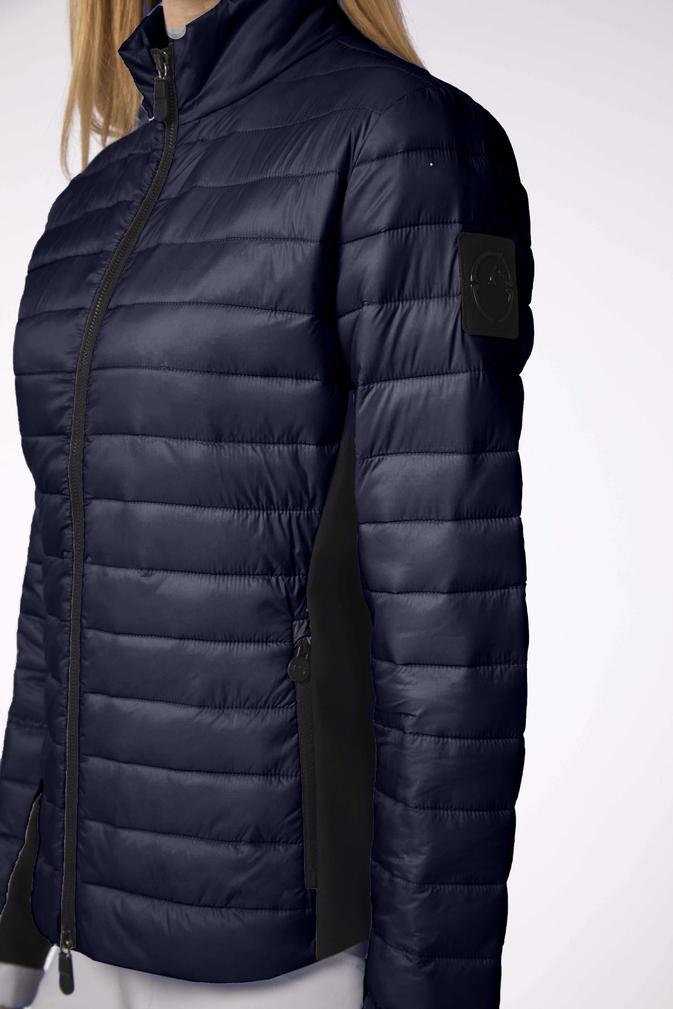 Women's jacket lined and padded in sectors with ecodown, a precious padding similar to goose down but completely sustainable. On the left sleeve a shiny black stitched patch and on the back a silicon print up to the middle with woven Vestrum lettering and logo.