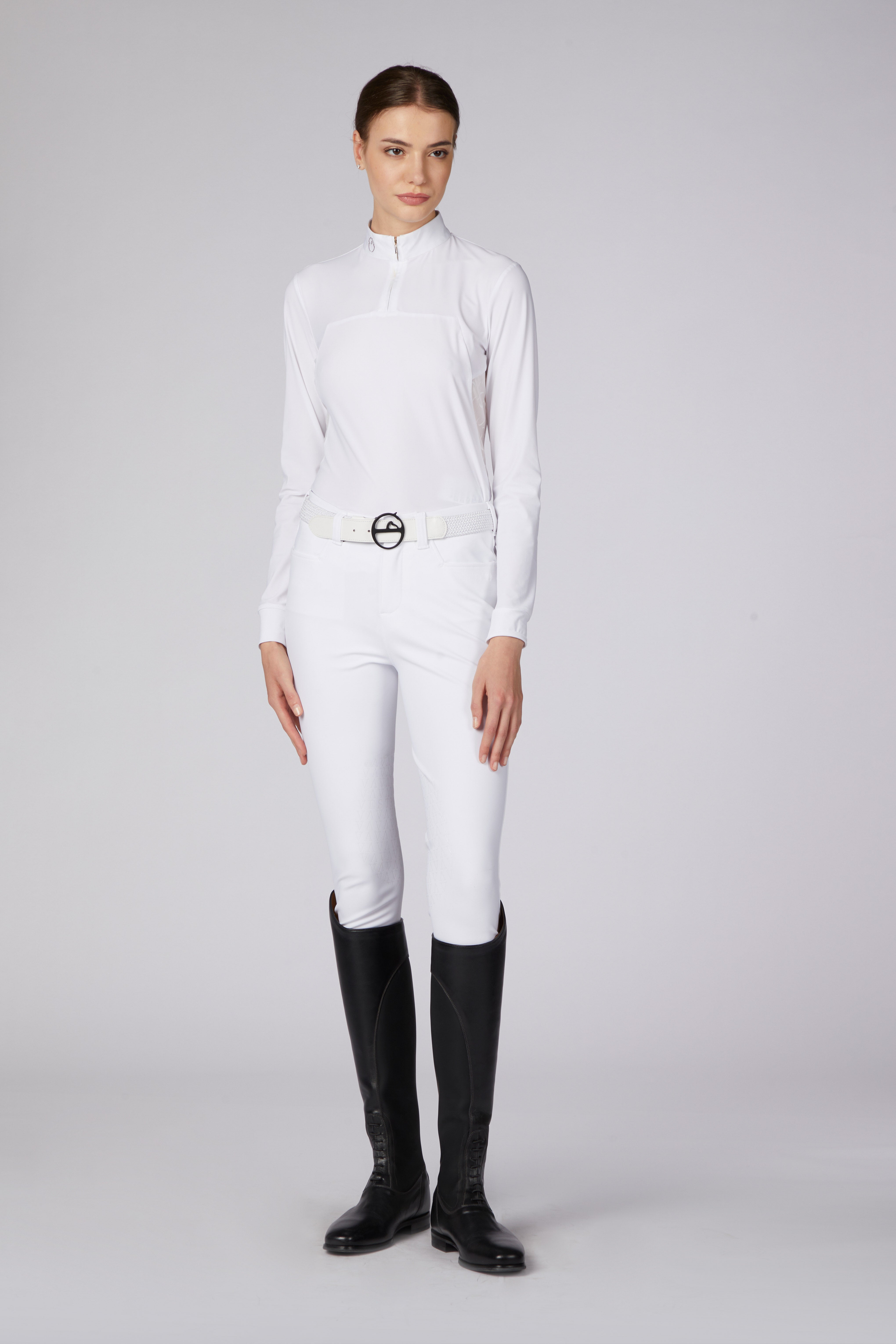Refined and essential, this Jeju show shirt offers a comfortable fit and maximum freedom of movement. Made with quality fabrics, it is characterized by a semi-transparent insert embroidered under the arms, to express their femininity even during horse competitions. The collar is decorated with the Vestrum logo.