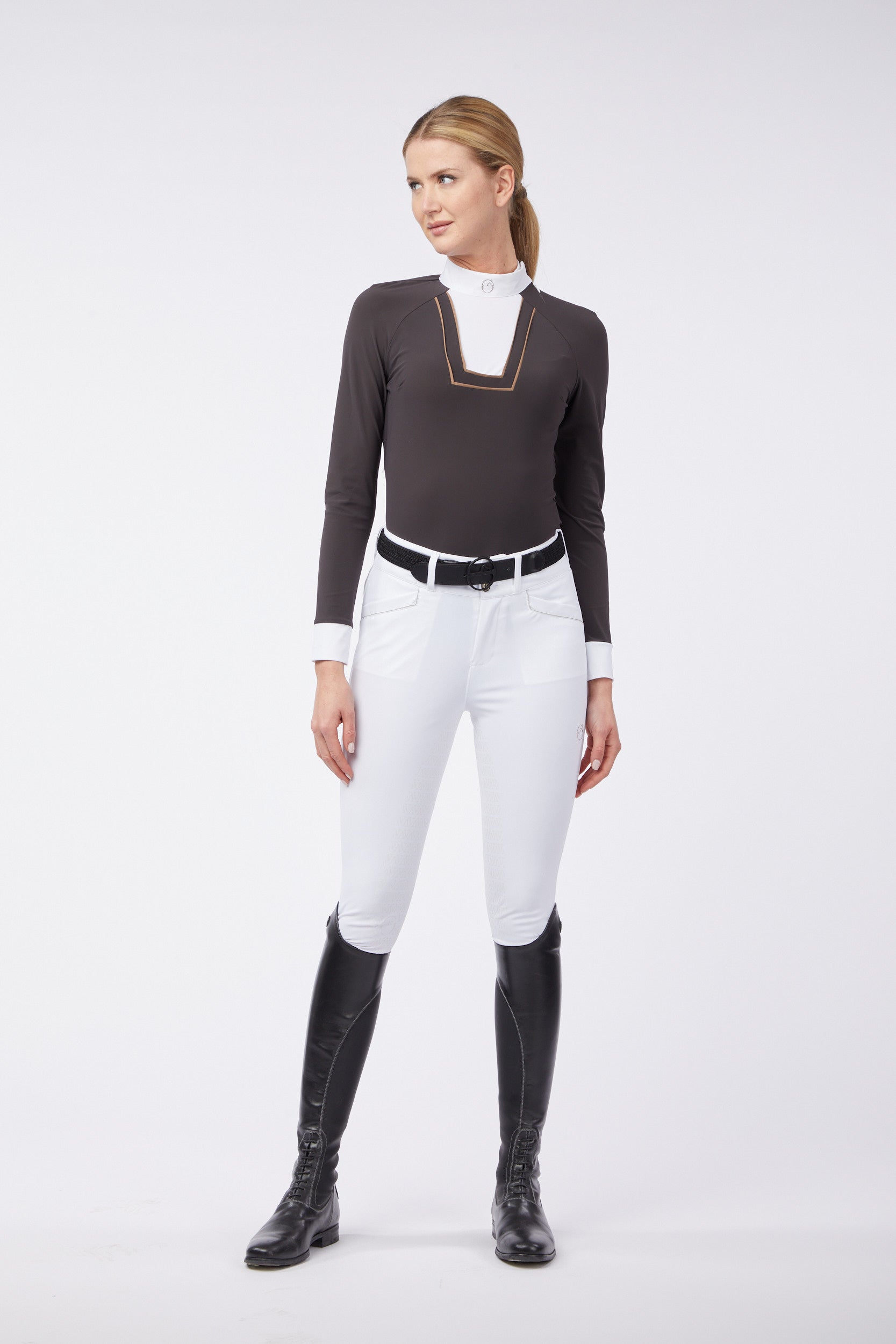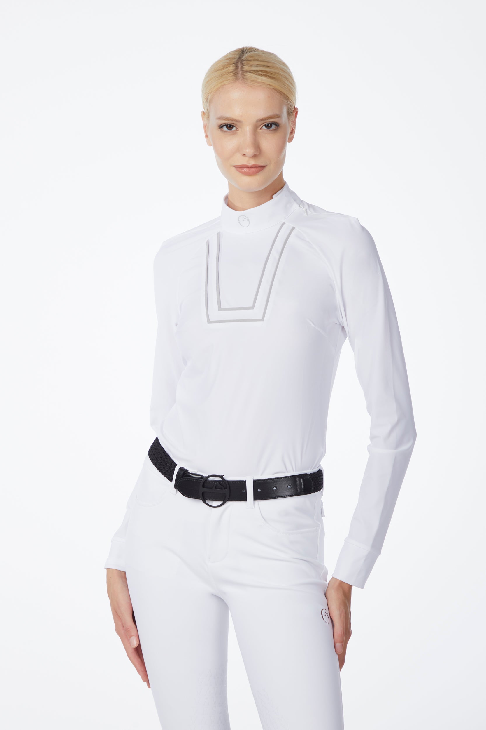The long-sleeved Jena women's show shirt is designed specifically for equestrian competitions. The fabric adheres to the body without preventing movement. The shirt has a front bib in poplin with pleated details and the high collar is decorated by a small logo in tone with the color of the garment.