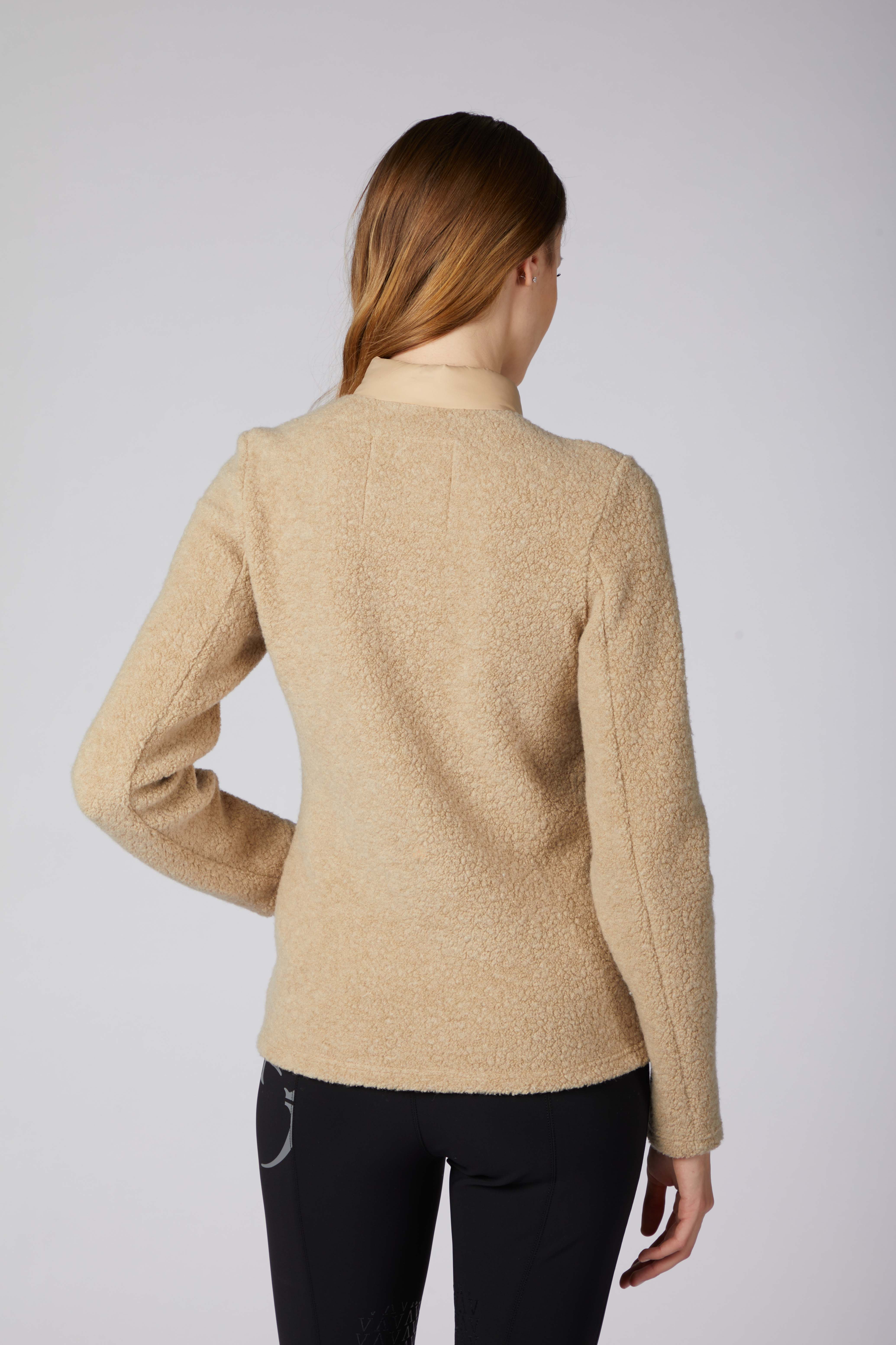 Women's jacket characterized by sleeves made of soft terry fabric, which guarantee comfort and a touch of originality. The garment has an oblique sector design, for a dynamic and contemporary effect. The tone-on-tone zip ensures an elegant closure, while the contrasting logo on the left sleeve adds a distinctive and refined detail.