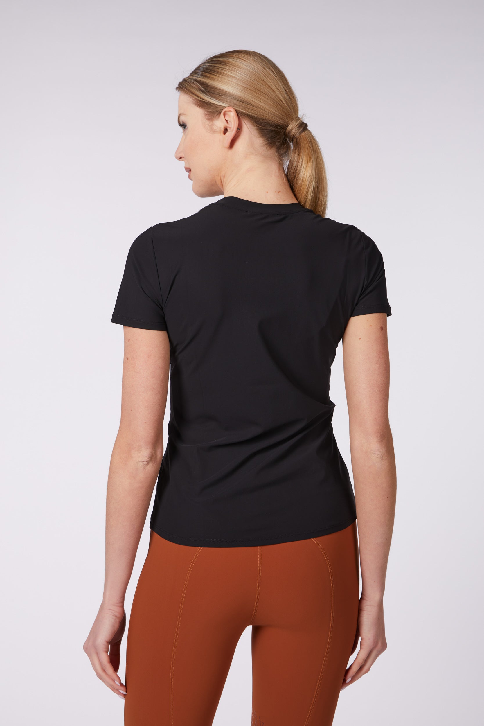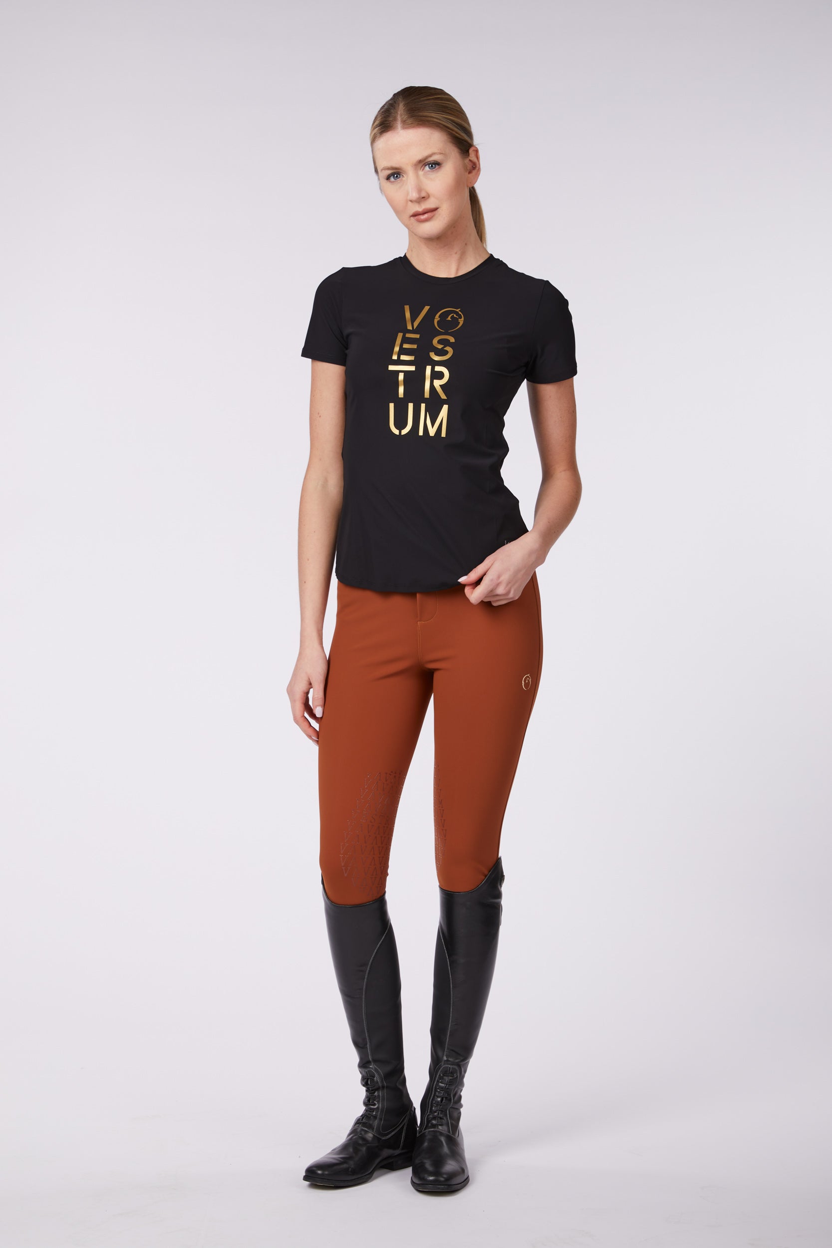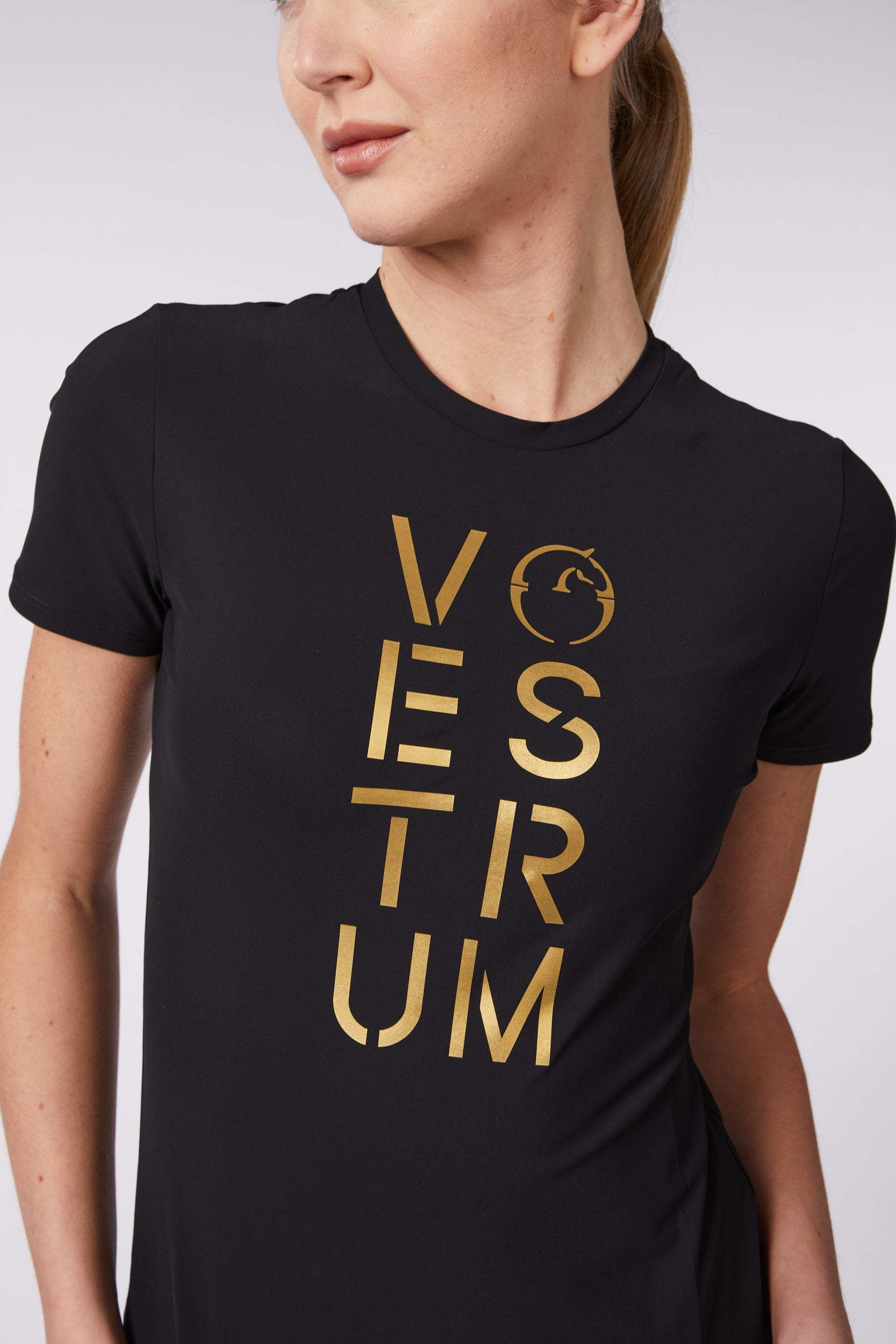 Equestrian training top made of extra-fine bi-stretch fabric that ensures proper breathability due to the technical characteristics of the fabric. T-shirt cut jersey with front lettering print.