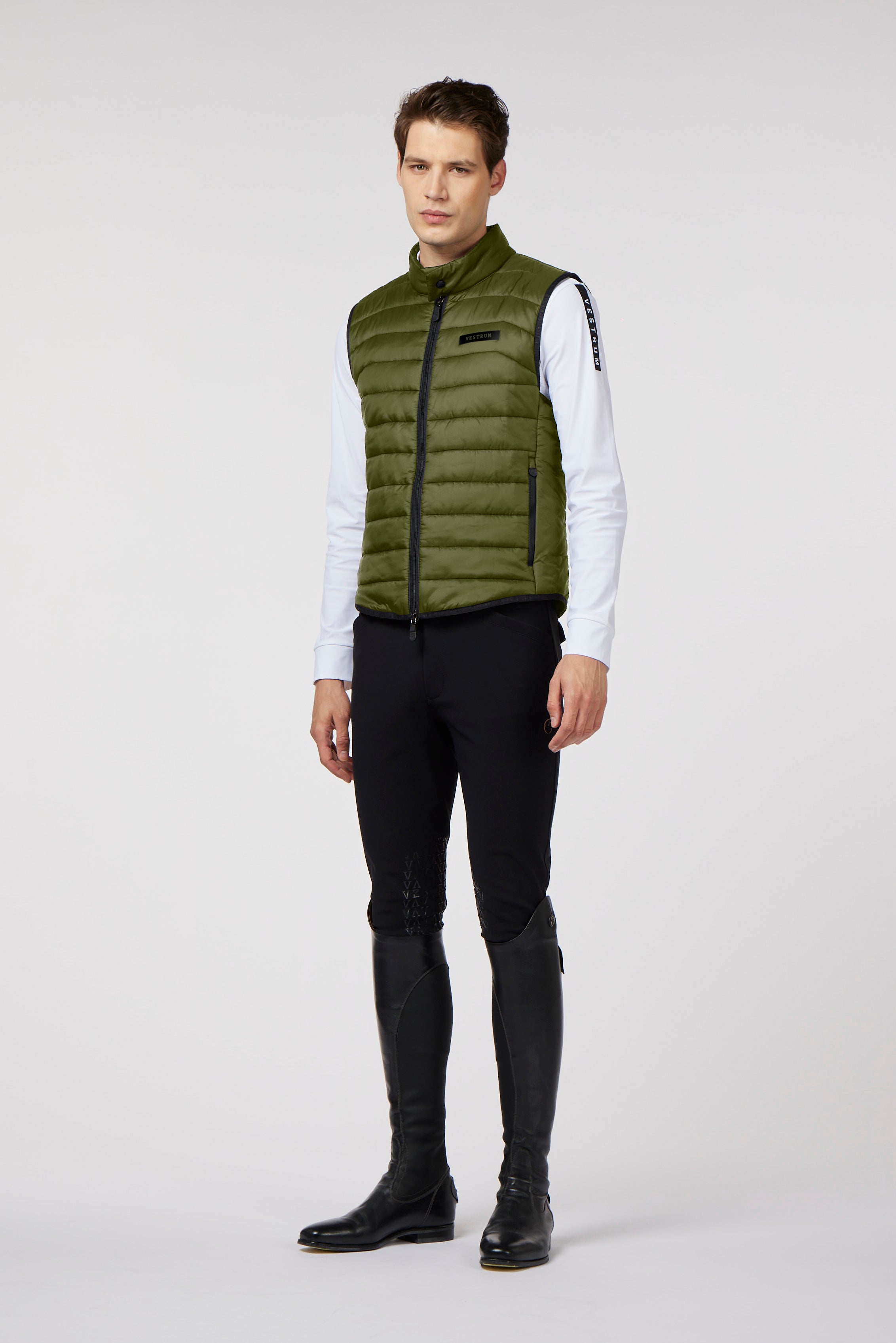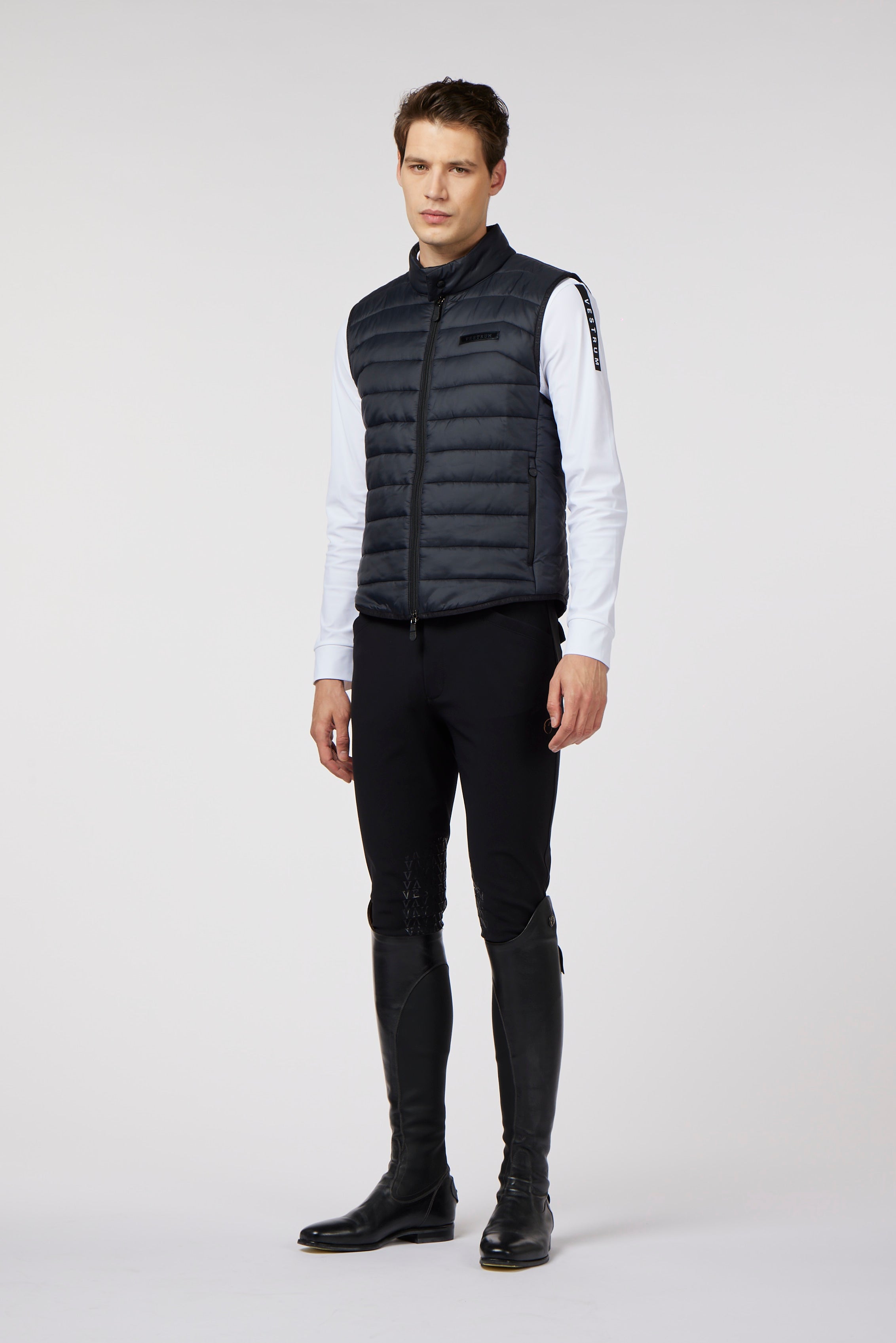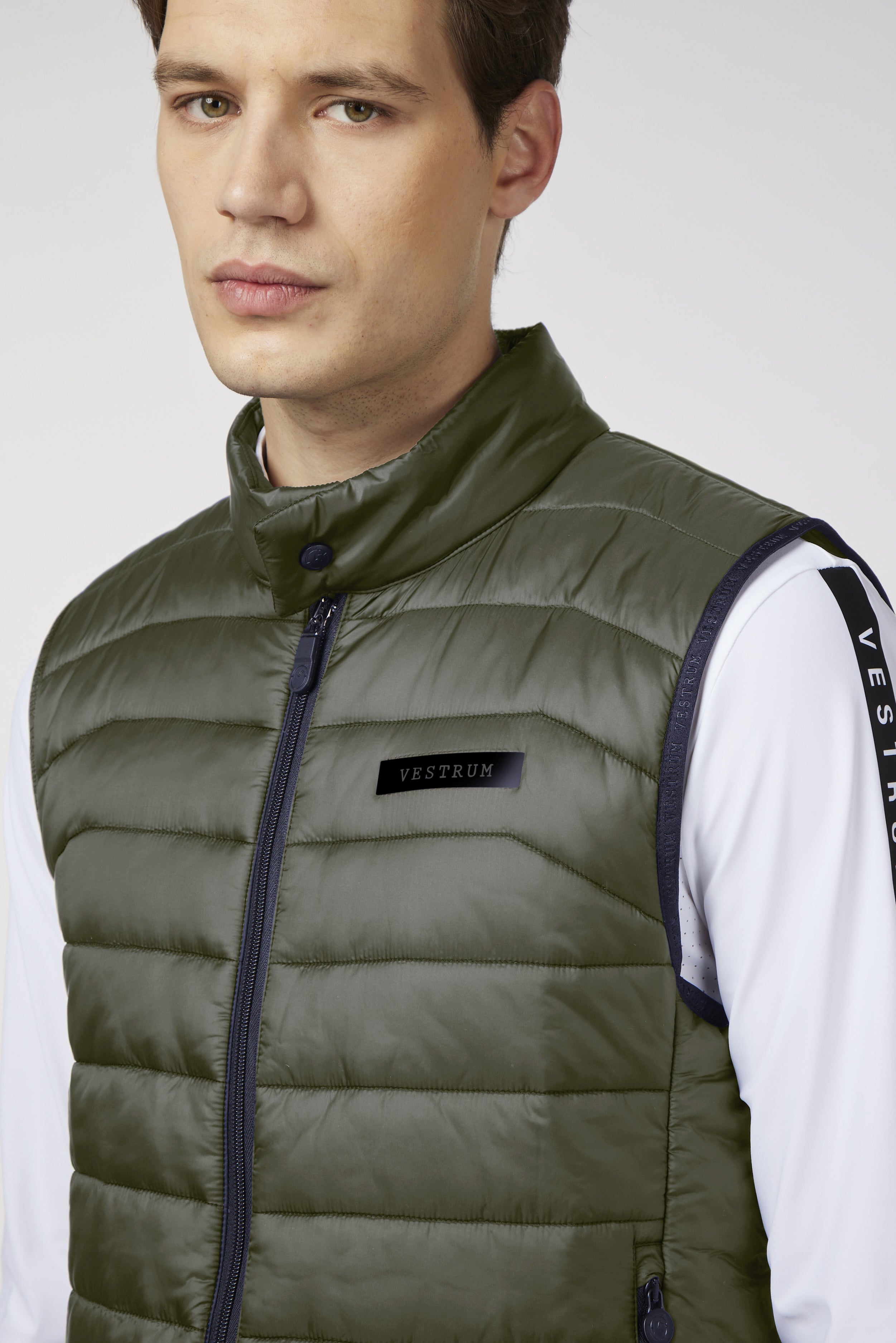 Levanto is a men's padded vest with a stand-by collar made of water-repellent and windproof fabric. The vest is embellished with perforated Vestrum lettering accompanied by a stitched label on the front left. On the back, the vest is embellished with a Vestrum logo print.