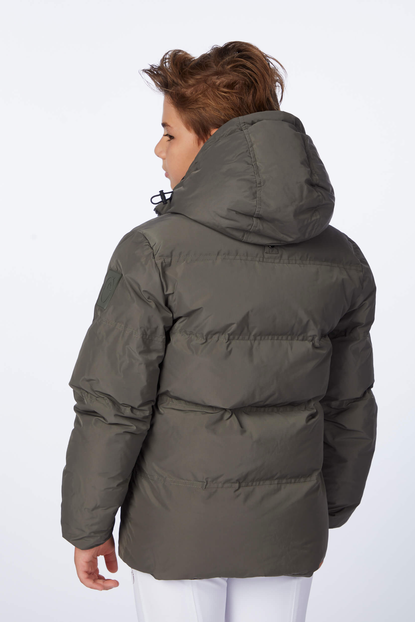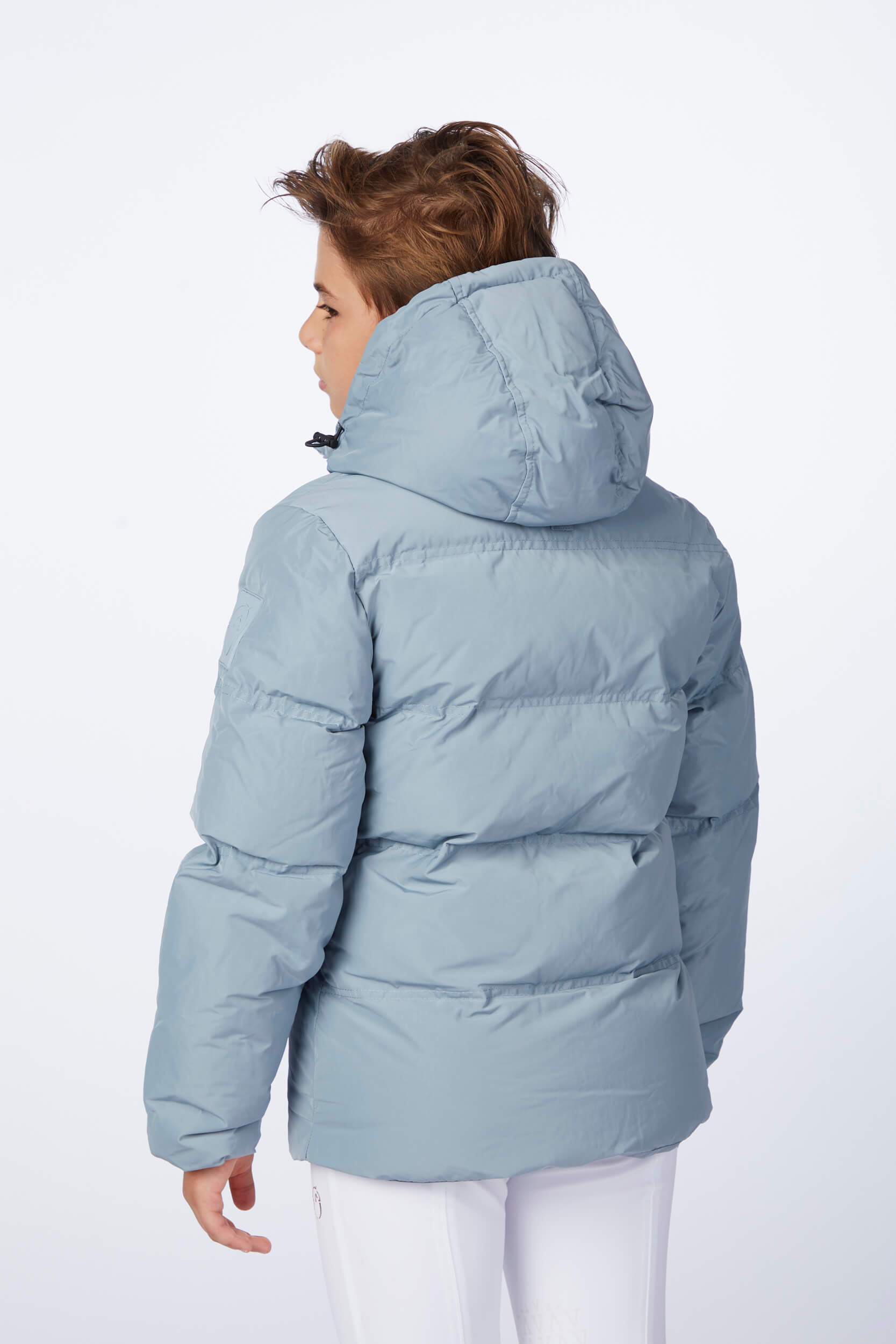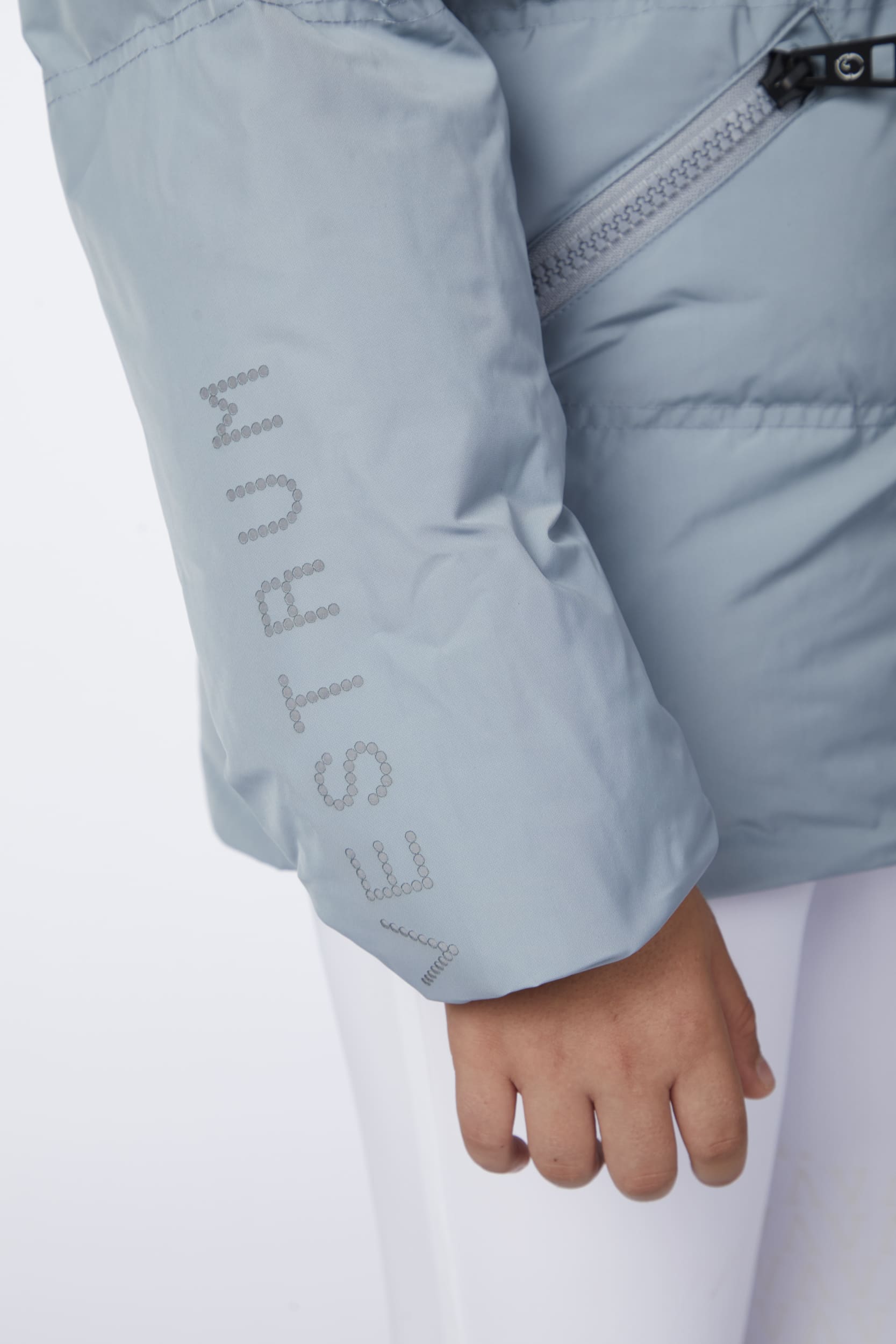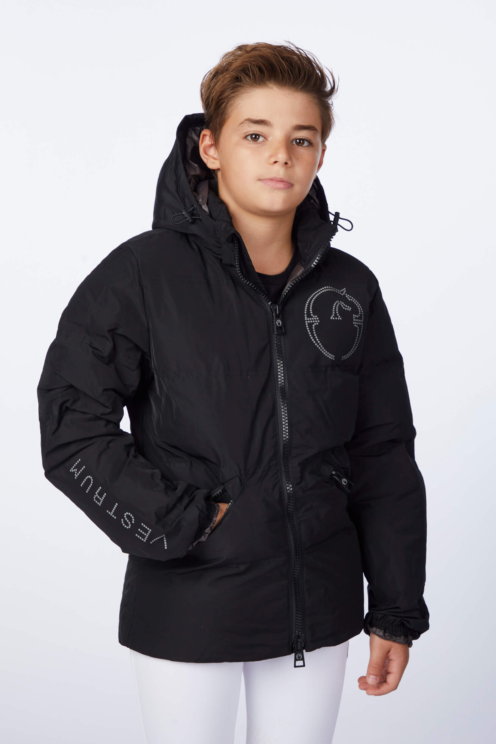 Children's jacket made of waterproof and windproof memory fabric, with contrasting lining. The jacket is embellished with the perforated Vestrum logo, which takes up the lettering on the right sleeve. On the left sleeve there is a tone patch. ecodown padding.