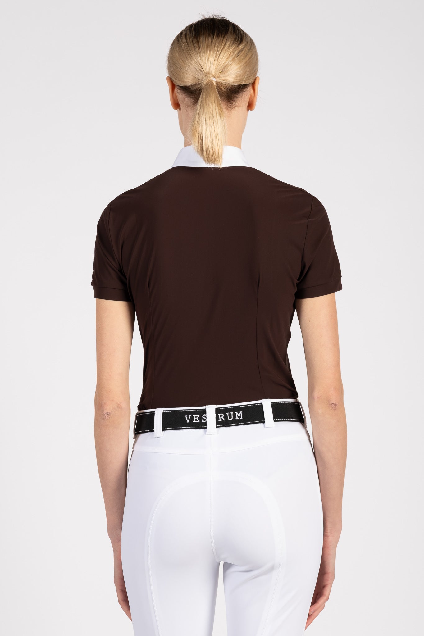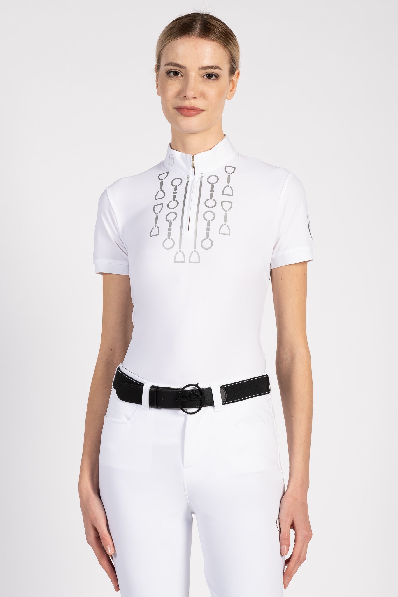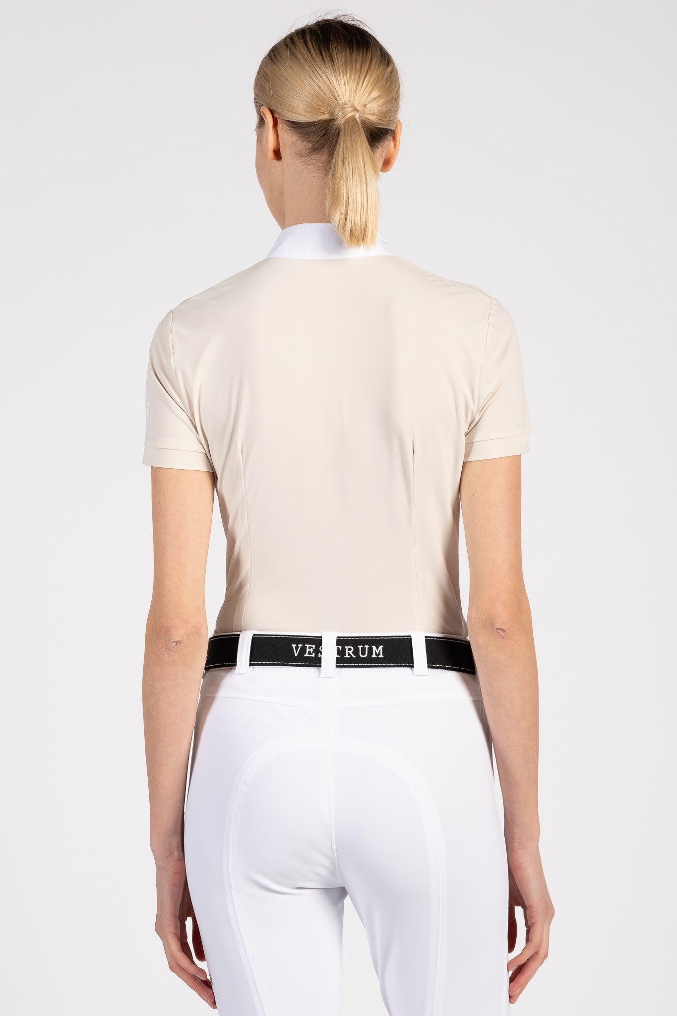 The Mersin women's short-sleeved shirt is made from bi-elastic, breathable fabric, designed to offer comfort and freedom of movement in the saddle. The mandarin collar with half-zip gives it a clean, contemporary look that is practical to wear. The equestrian motif on the bib and the Vestrum logo add character and sophistication to the design. Ideal for spring/summer competitions, this women's riding shirt combines functionality and elegance, accompanying every ride with confidence and precision.