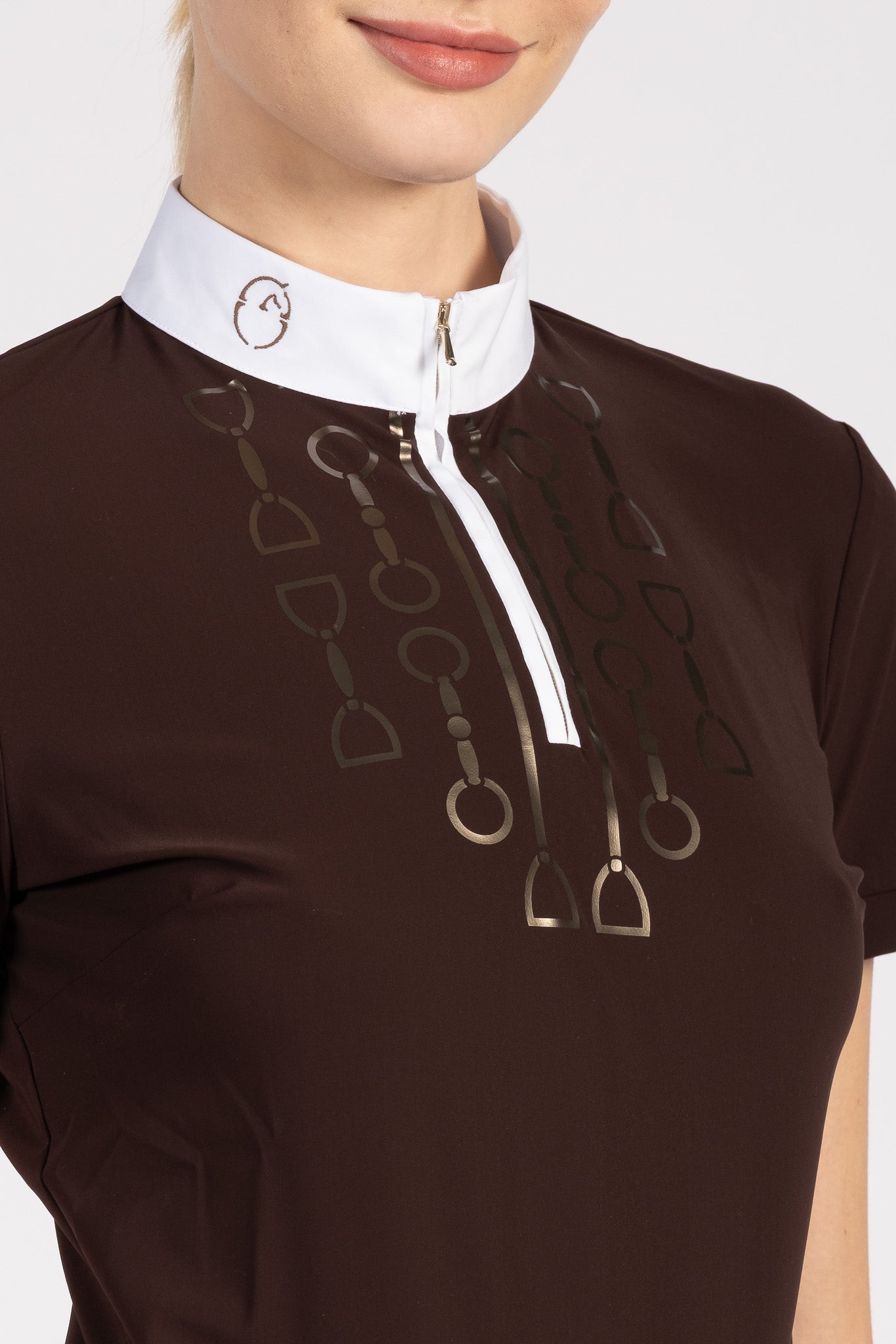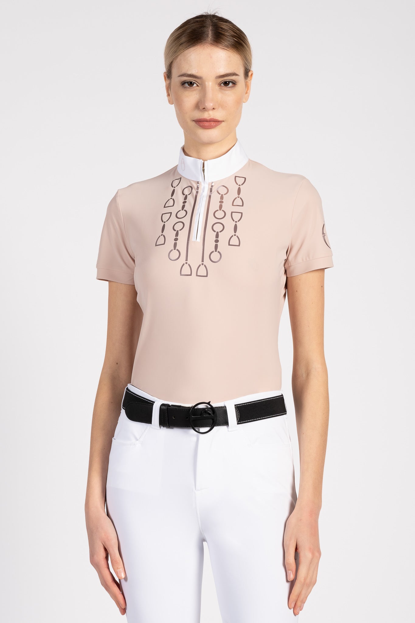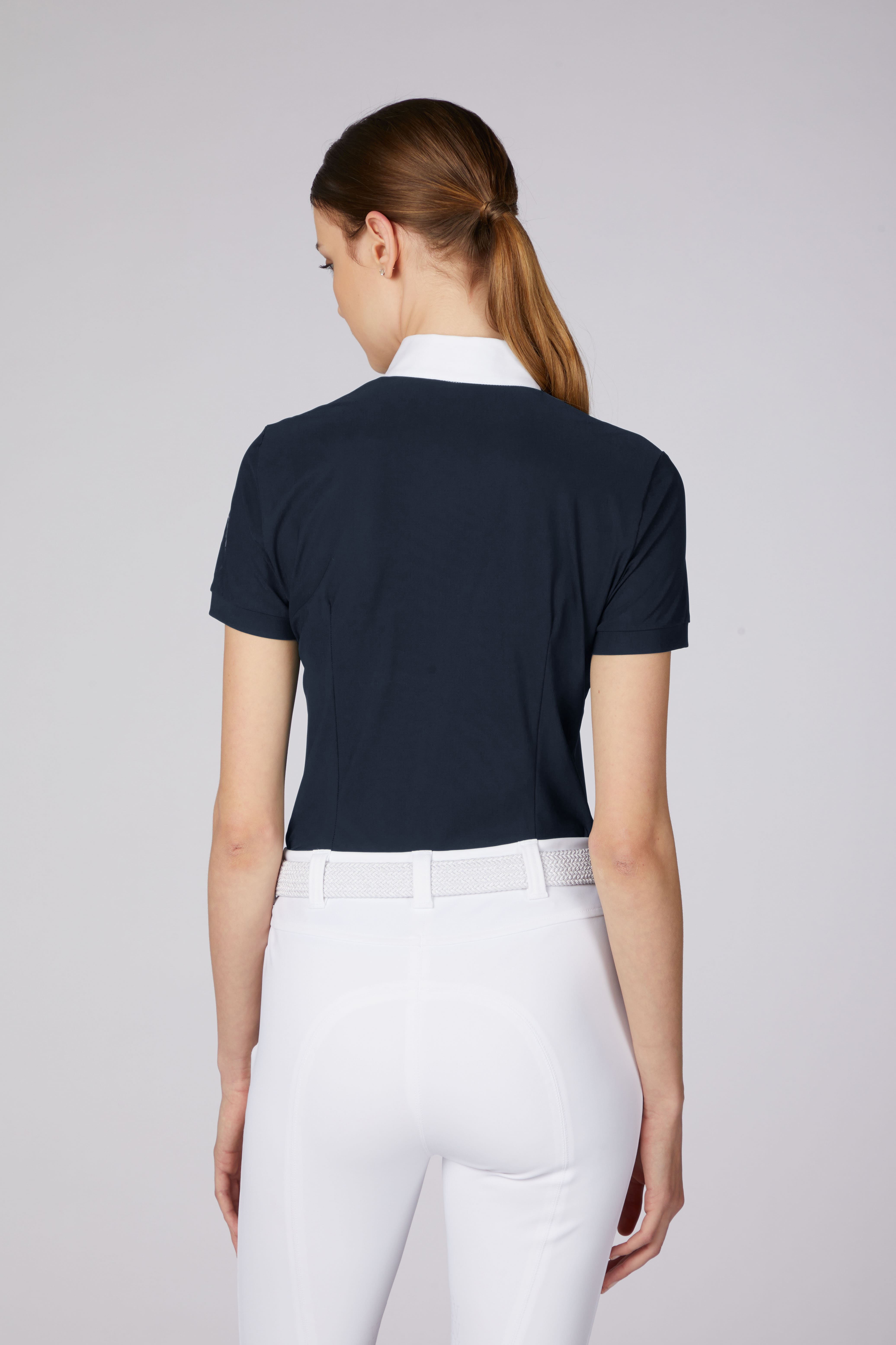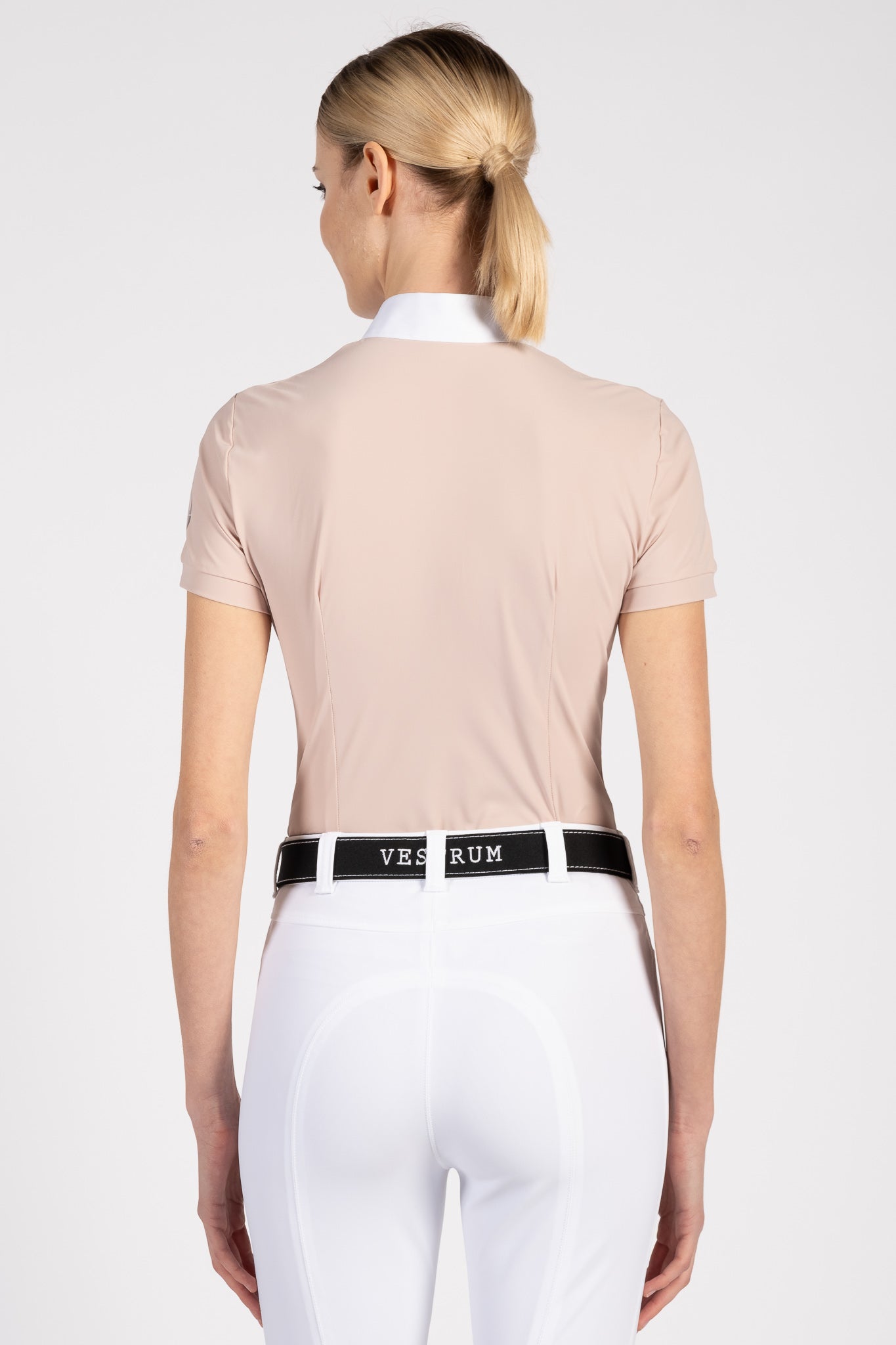 The Mersin women's short-sleeved shirt is made from bi-elastic, breathable fabric, designed to offer comfort and freedom of movement in the saddle. The mandarin collar with half-zip gives it a clean, contemporary look that is practical to wear. The equestrian motif on the bib and the Vestrum logo add character and sophistication to the design. Ideal for spring/summer competitions, this women's riding shirt combines functionality and elegance, accompanying every ride with confidence and precision.