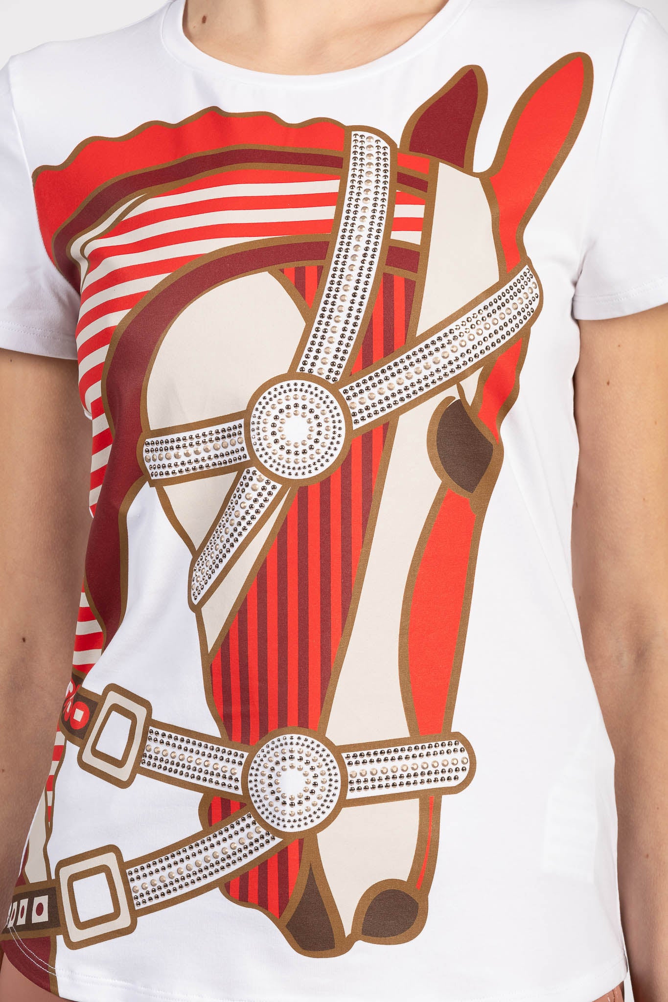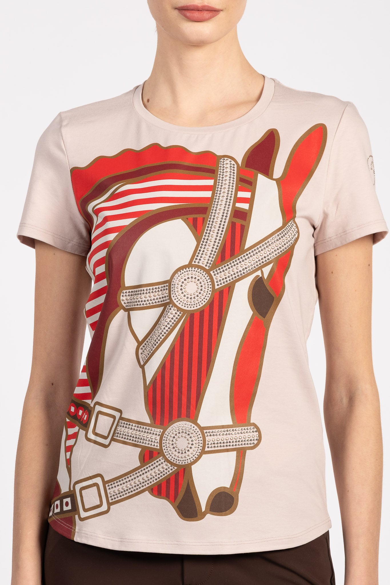 Miami women's T-shirt is made from soft, lightweight cotton, ideal for ensuring comfort throughout the day. The digital print on the front depicts a horse's head, embellished with glitter applied to the bridle, creating a distinctive, luminous effect. The Vestrum logo on the left sleeve, also embellished with sparkling micro details, completes the design with a discreet but recognizable touch. This women's T-shirt inspired by the equestrian world combines style and personality, perfect for riding, training, or leisure, bringing the elegance of horse riding to even the most informal occasions.