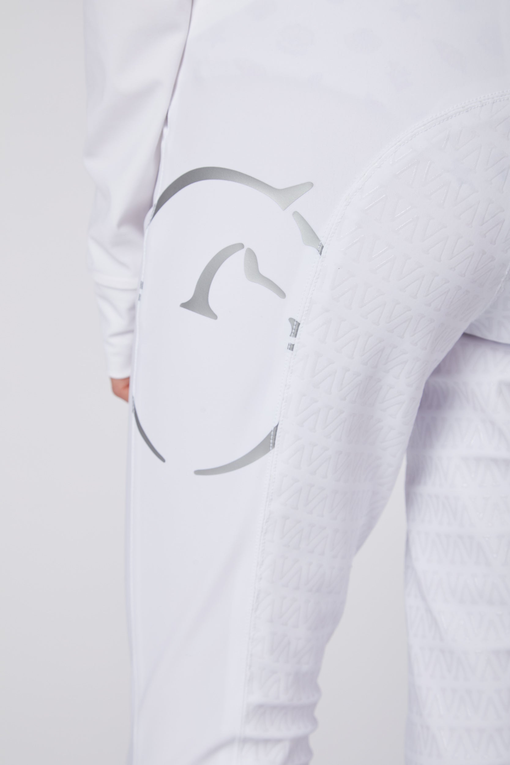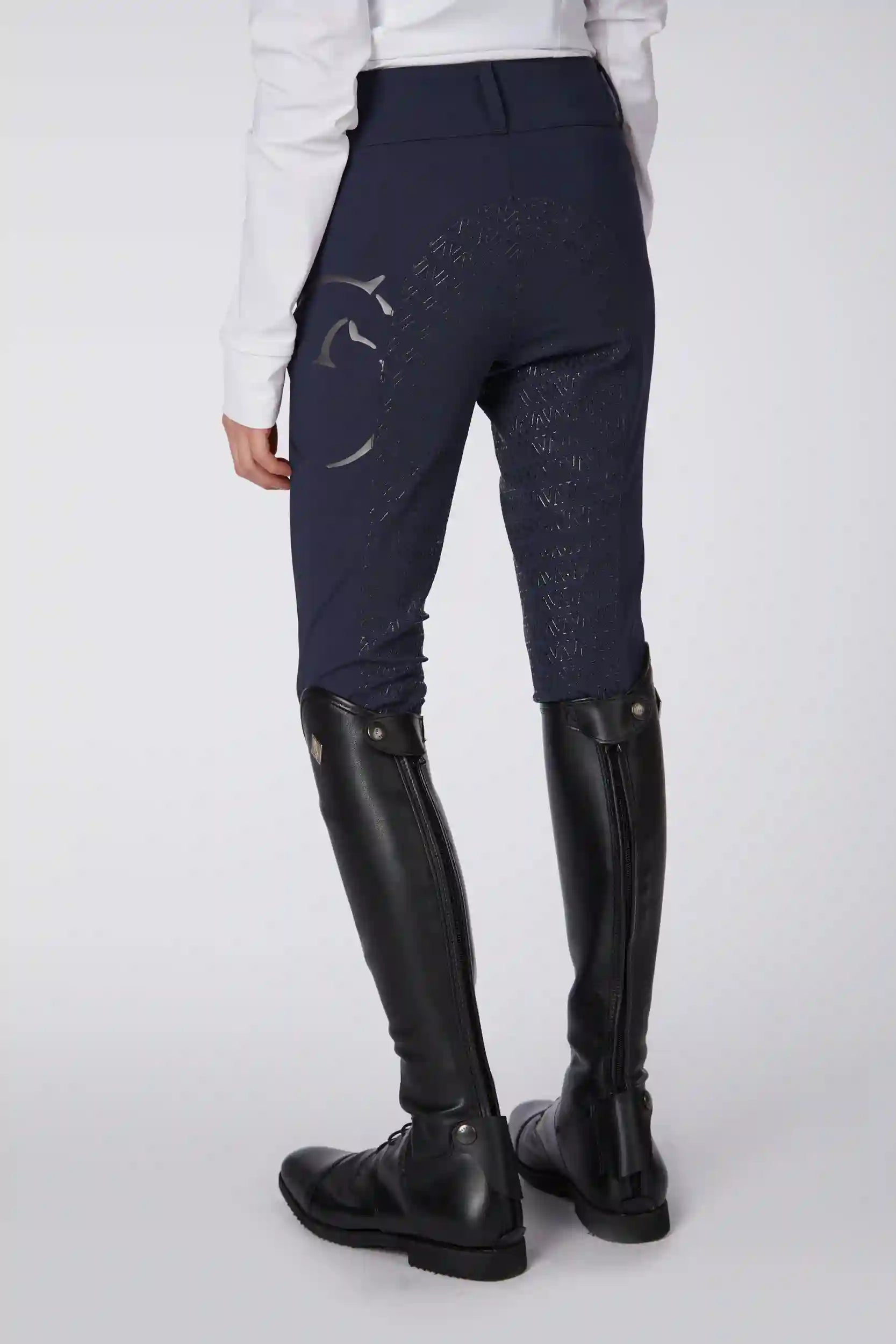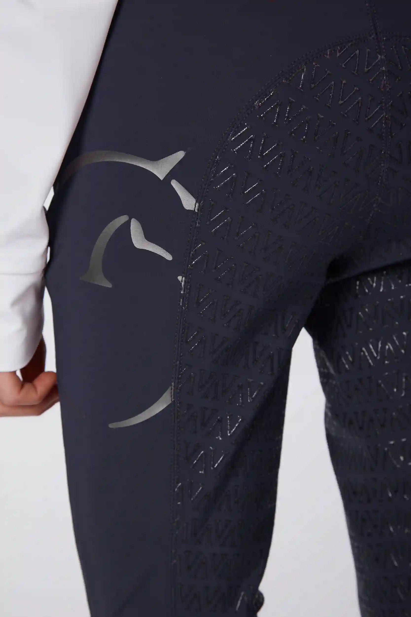 Girl's high-waisted knee grip breeches made of TK fabric, a lightweight bi-elastic material designed to offer excellent performance and support athletes' performance at all times. TK fabric ensures greater comfort in movement. The breeches feature a Vestrum print on the side.