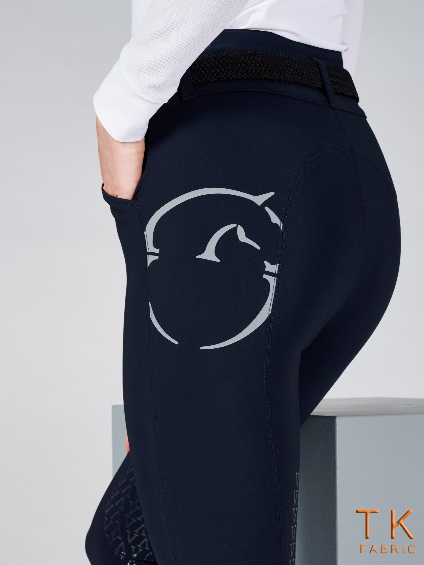 Women's knee grip riding breeches with big logo on the backside, in TK fabric.