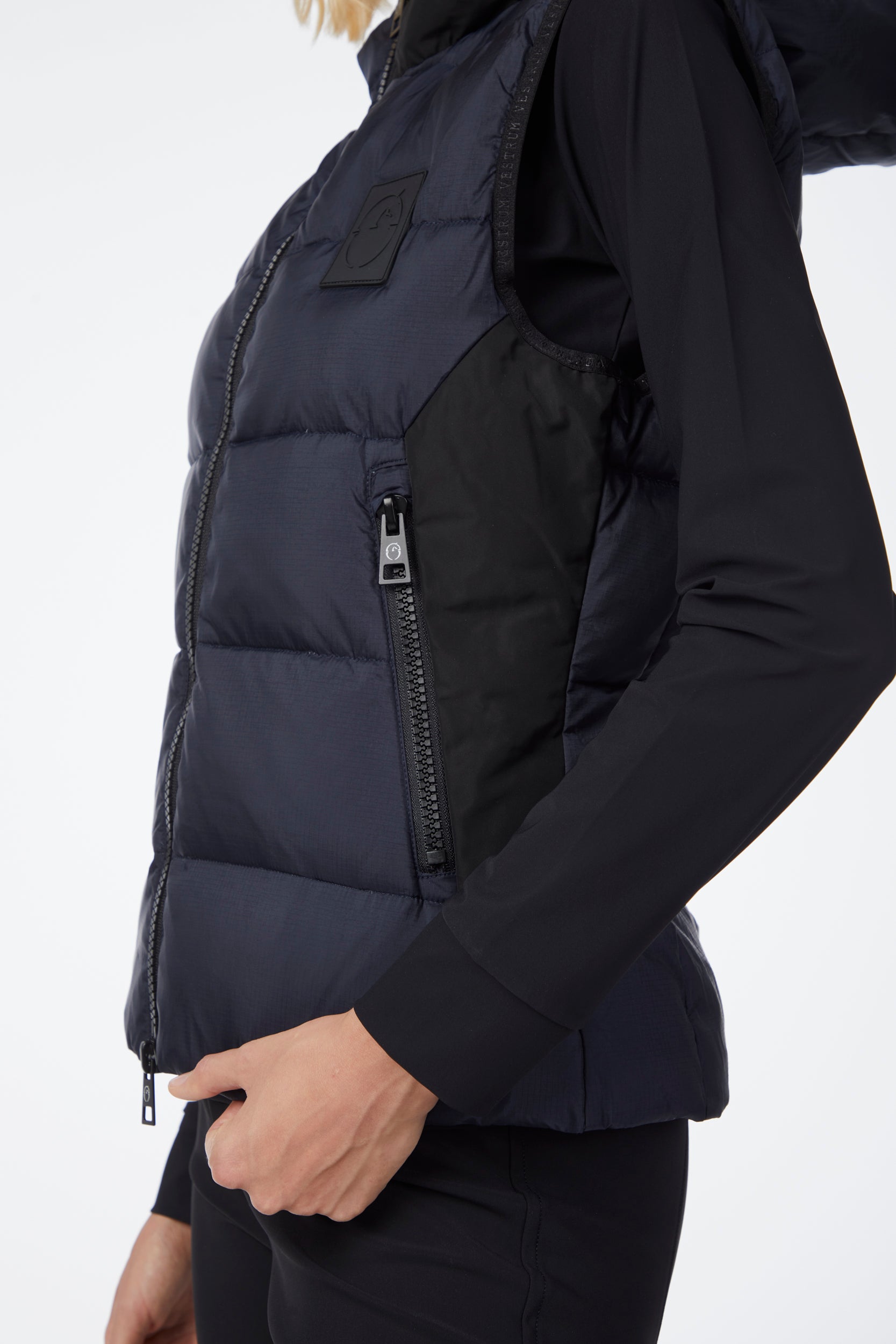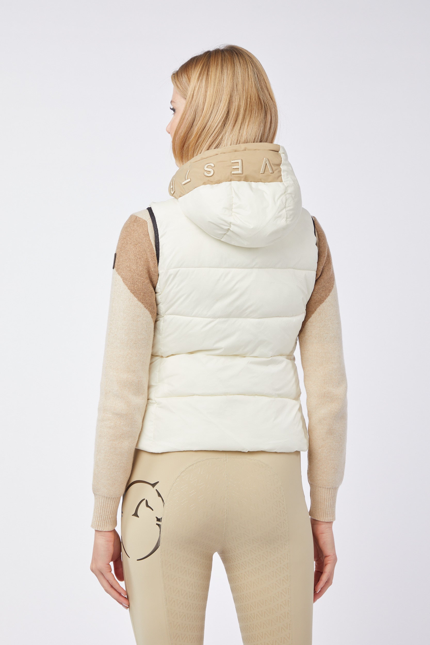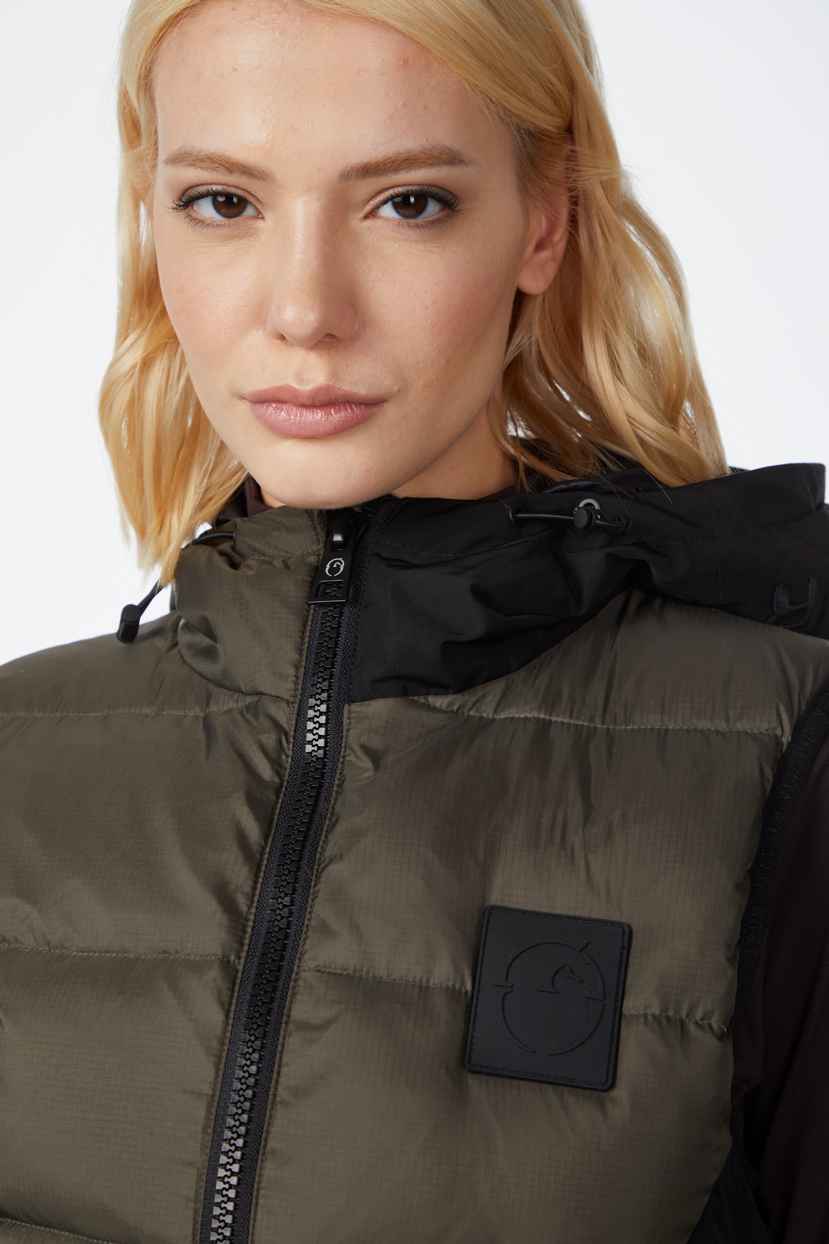 The Nagoya women's vest is made of water-repellent and windproof technical fabric, designed to offer protection and comfort. The side panels in memory fabric enhance the line of the garment, offering structure and softness at the same time. The contrast hood is embellished with a tone-on-tone lettering embroidery, while the inner lining features a contrasting lettering print. Feather padding.