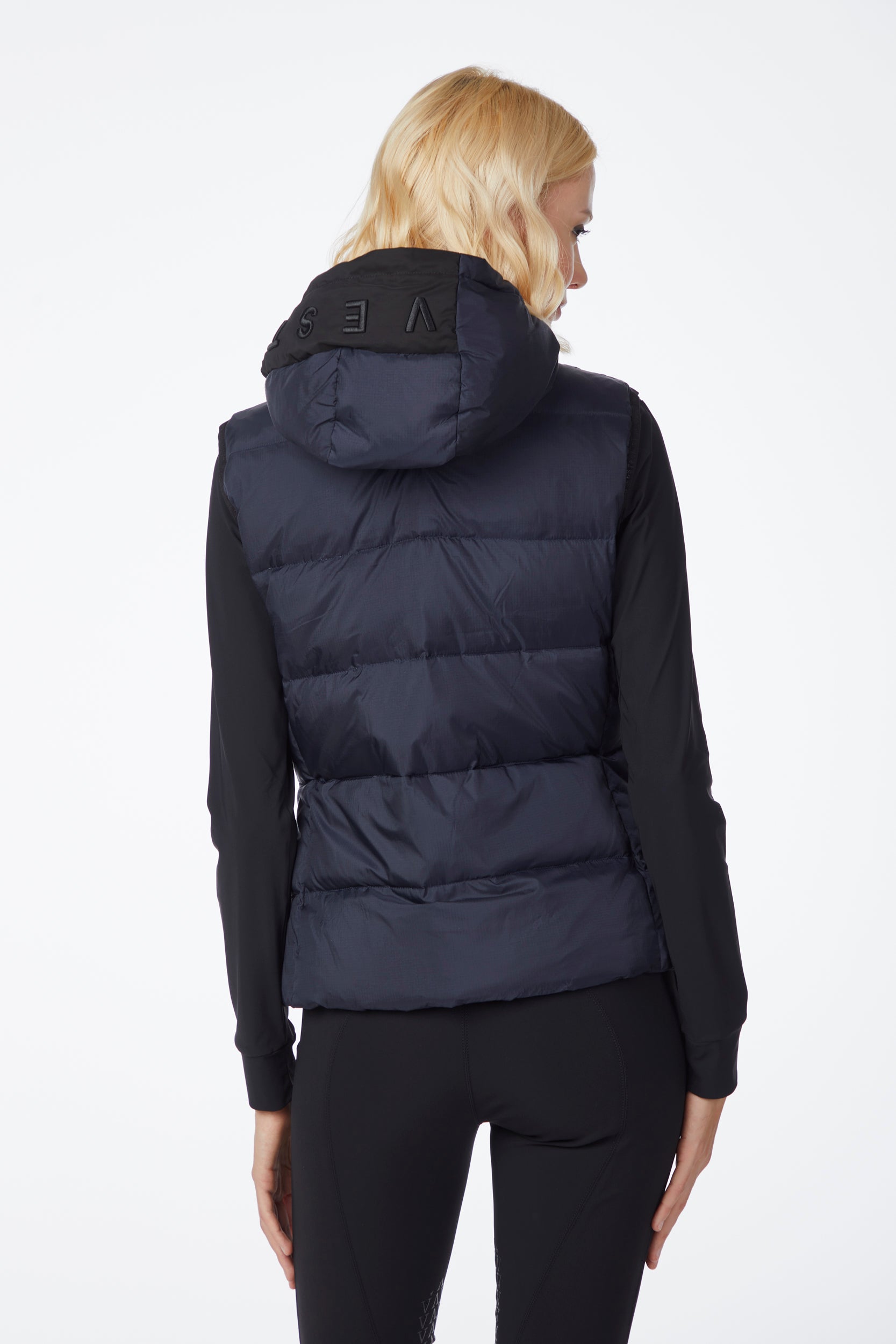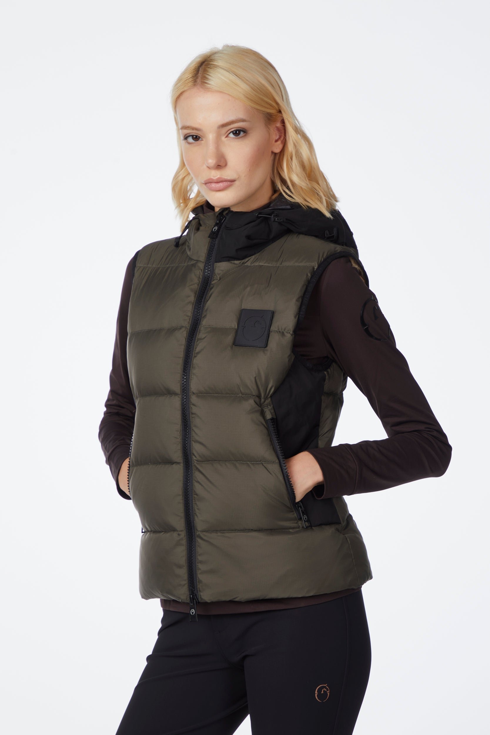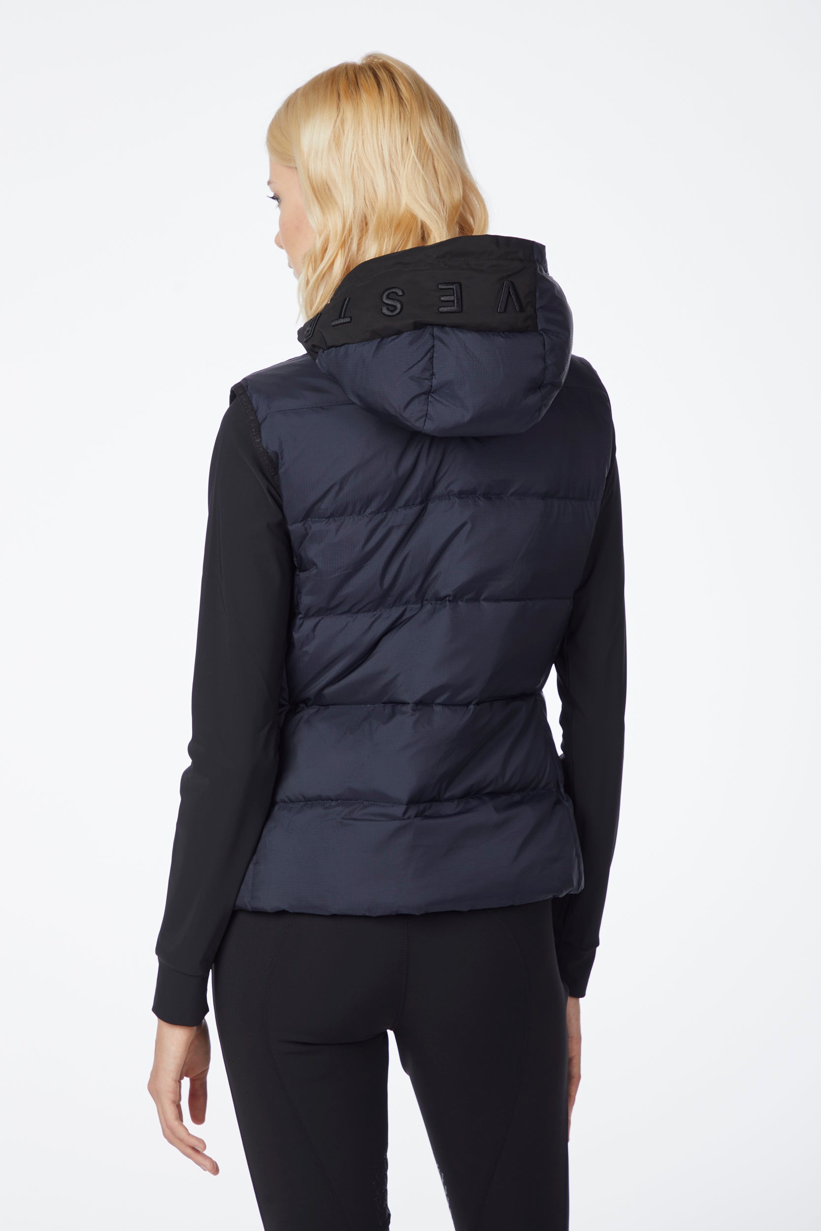 The Nagoya women's vest is made of water-repellent and windproof technical fabric, designed to offer protection and comfort. The side panels in memory fabric enhance the line of the garment, offering structure and softness at the same time. The contrast hood is embellished with a tone-on-tone lettering embroidery, while the inner lining features a contrasting lettering print. Feather padding.