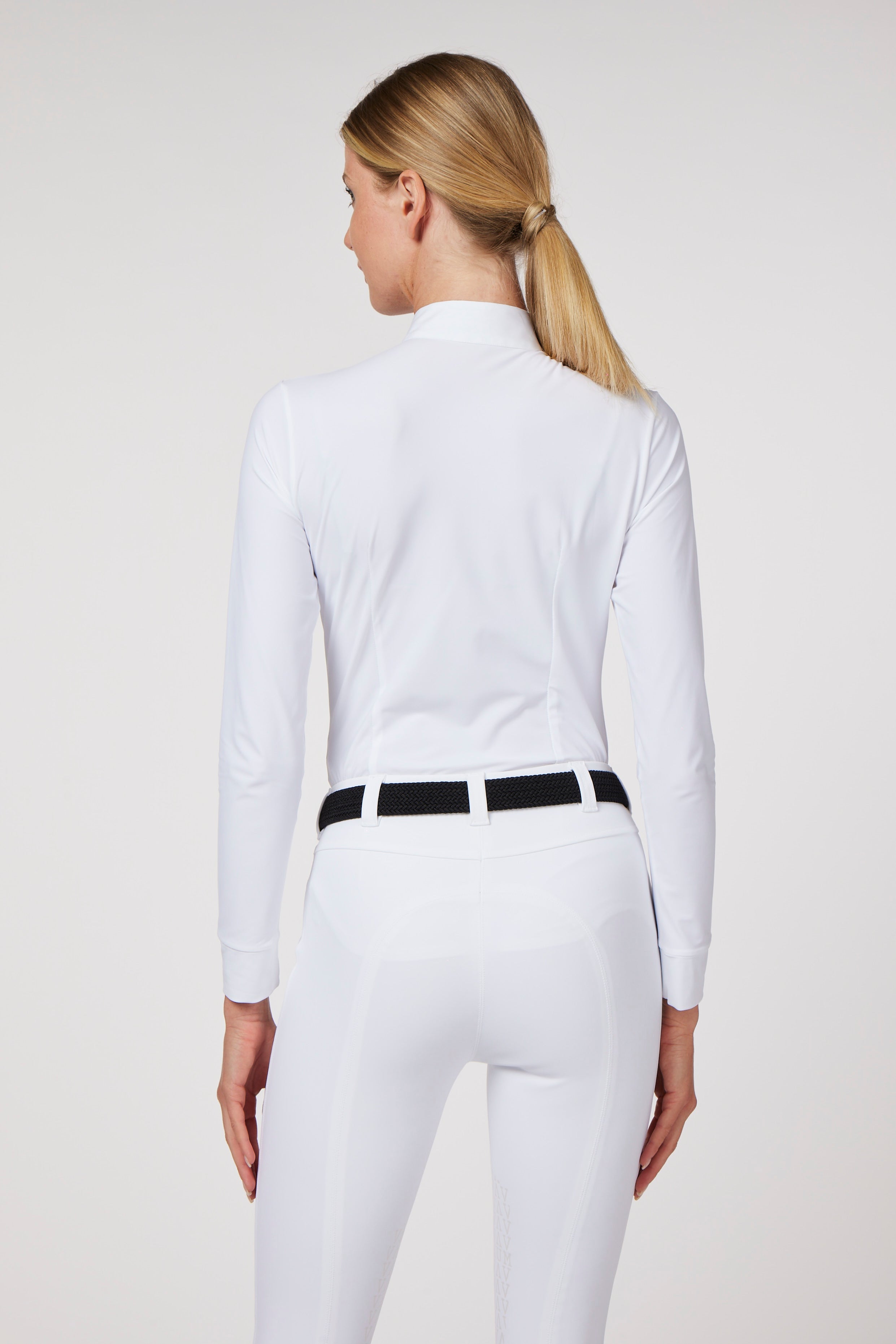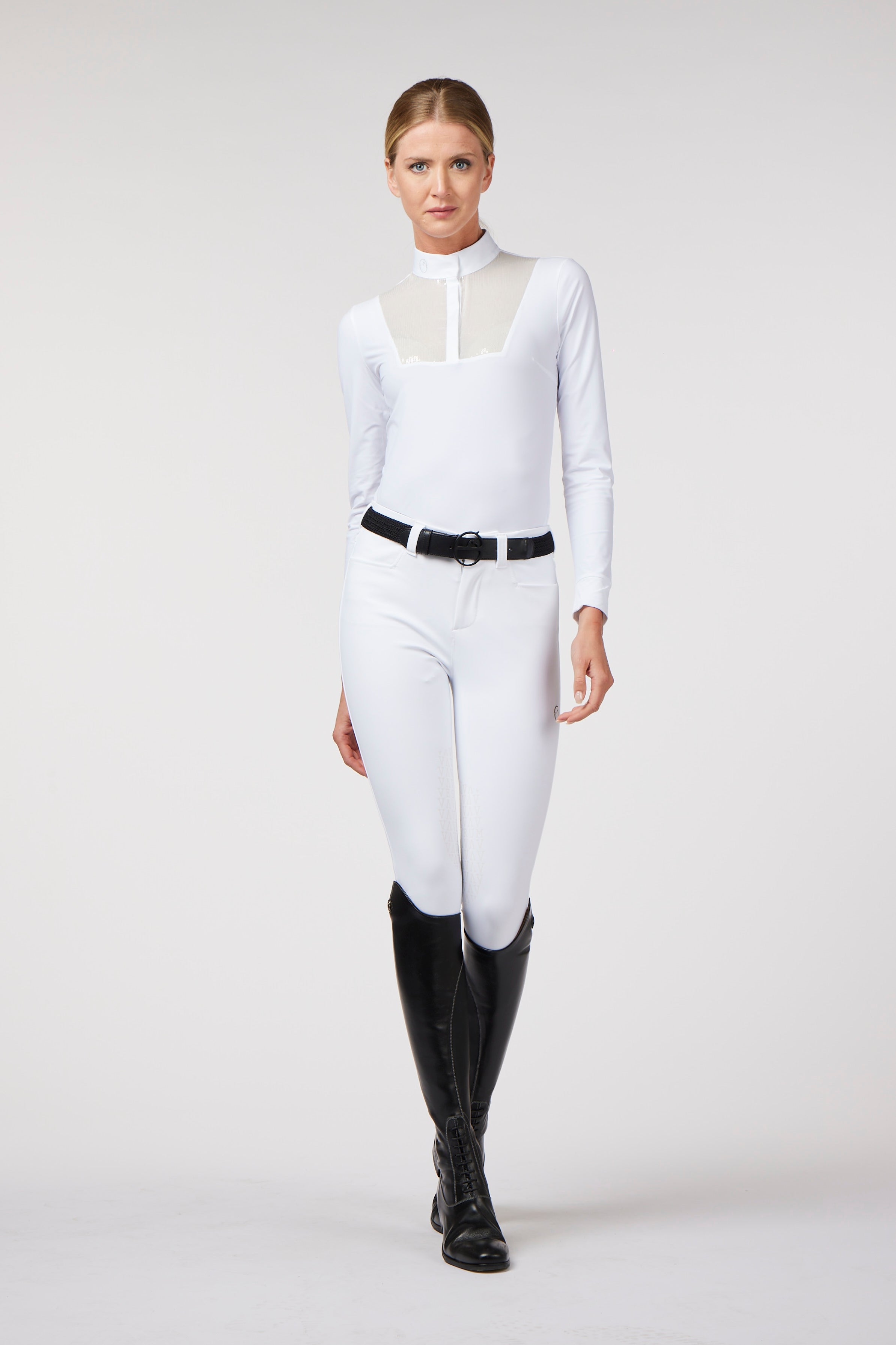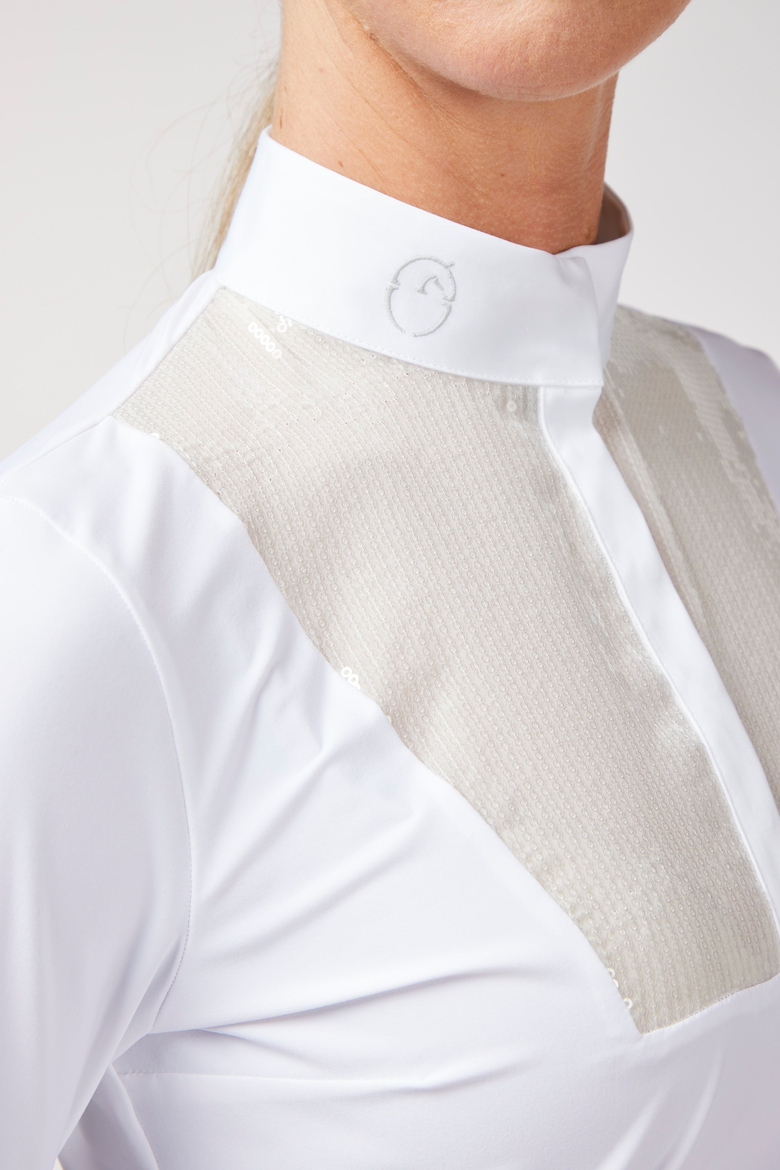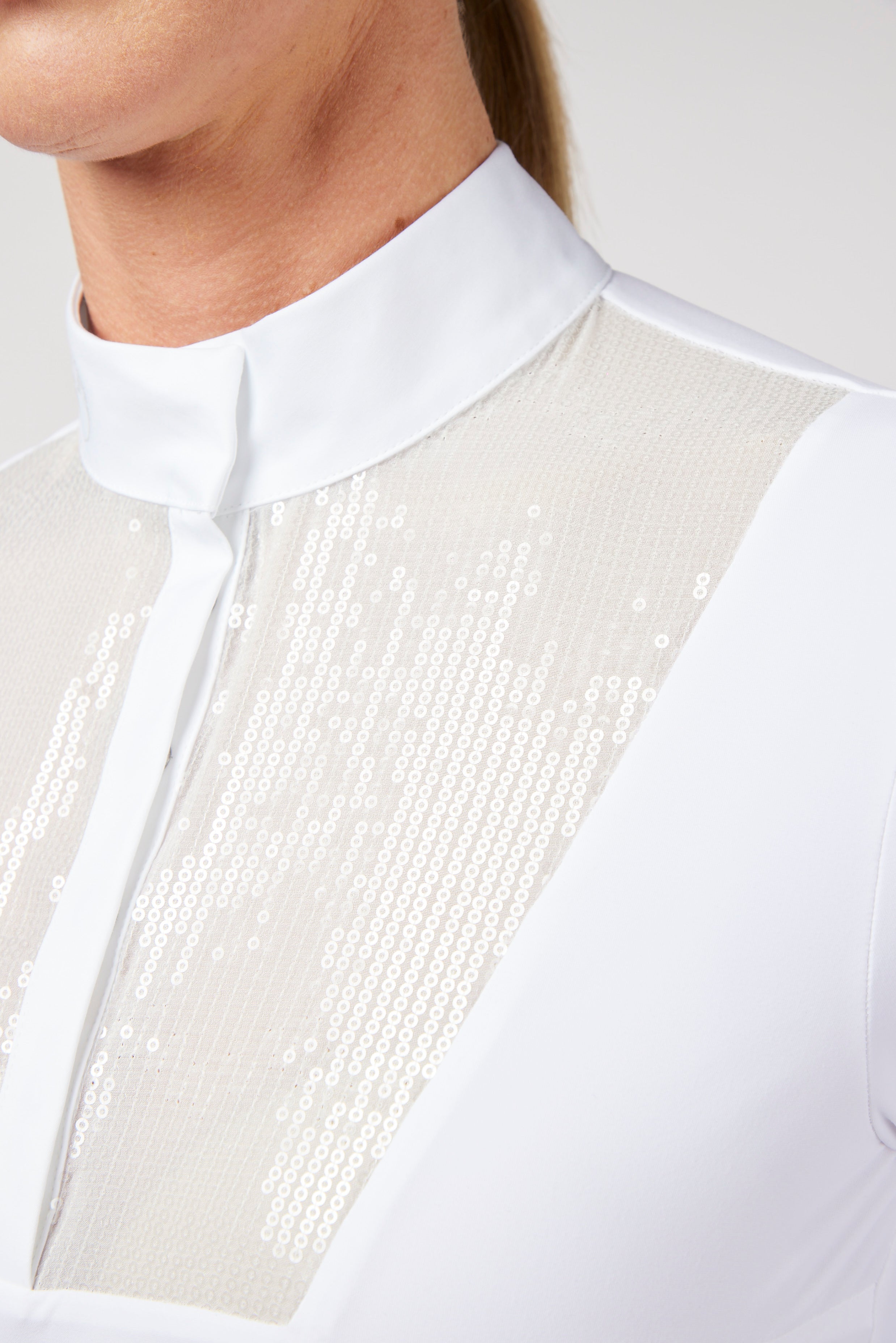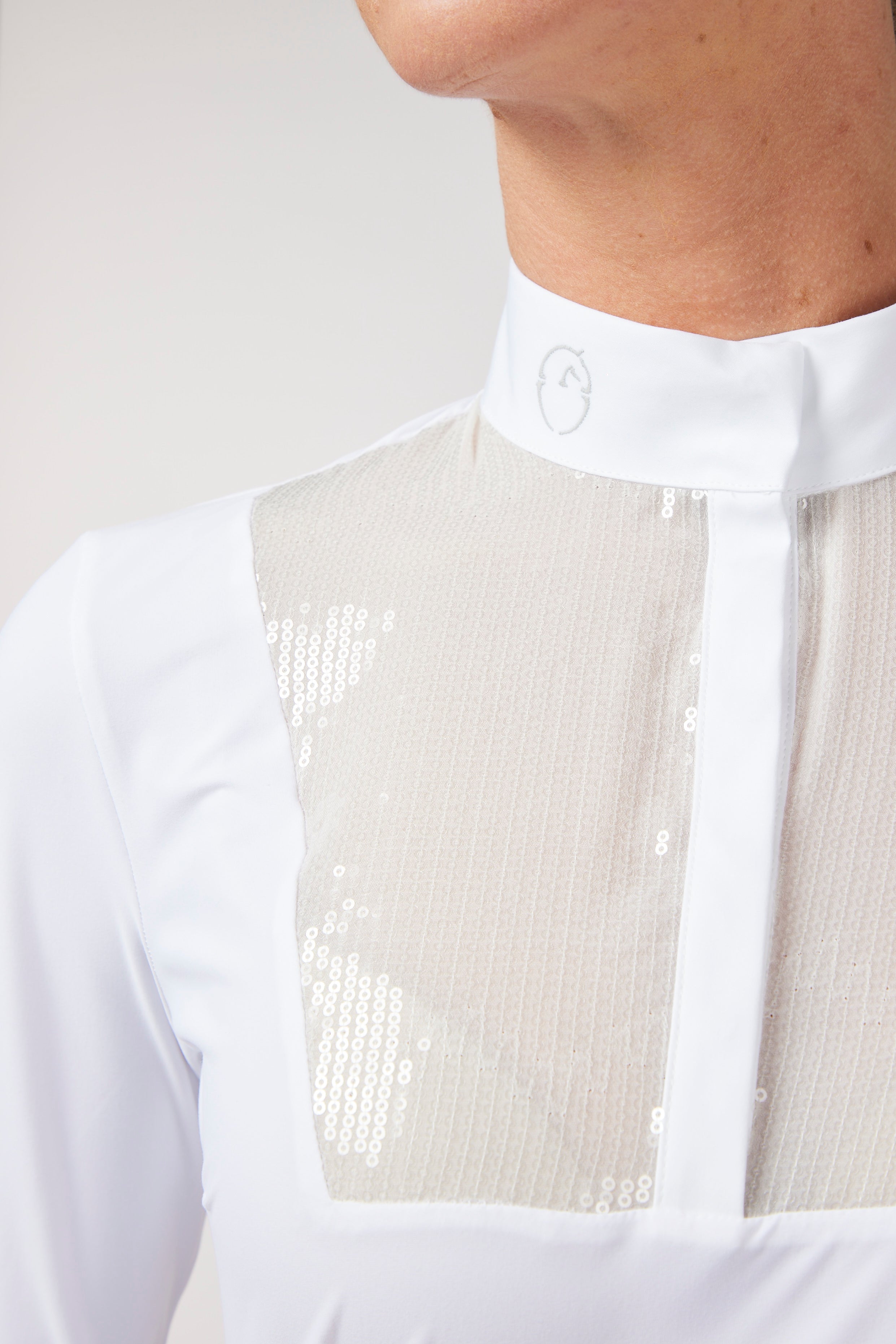 Women's lightweight and breathable technical fabric show shirt with front bib made with white sequins to make the shirt more elegant and feminine. Snap button closure and logo printed collar.
