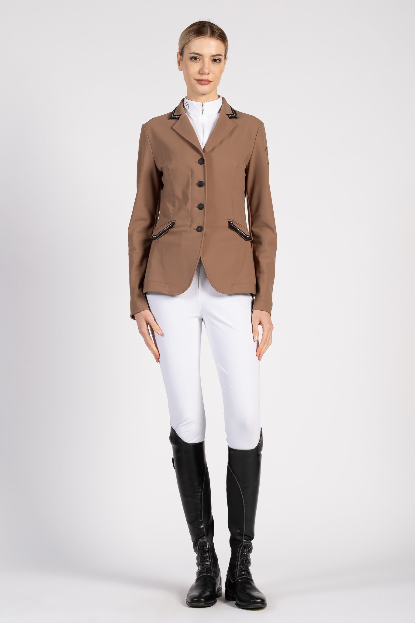 The exclusive Nizza women's competition jacket is embellished with hot-applied mini studs in two colors on the collar and side pockets and mini mono-color studs on the Vestrum logo in the sleeve. The bielastic fabric makes it perfect for competitions. It guarantee freedom of movement for all types of build, even curvy ones. Double front closure with hidden zip and 4 buttons personalized with Vestrum logo.