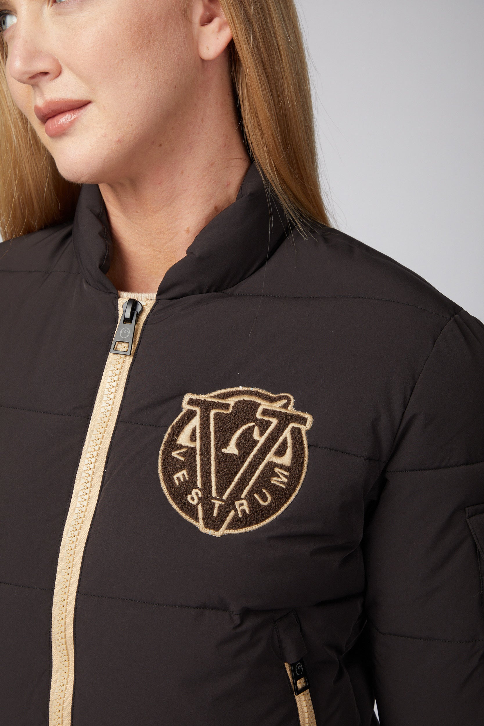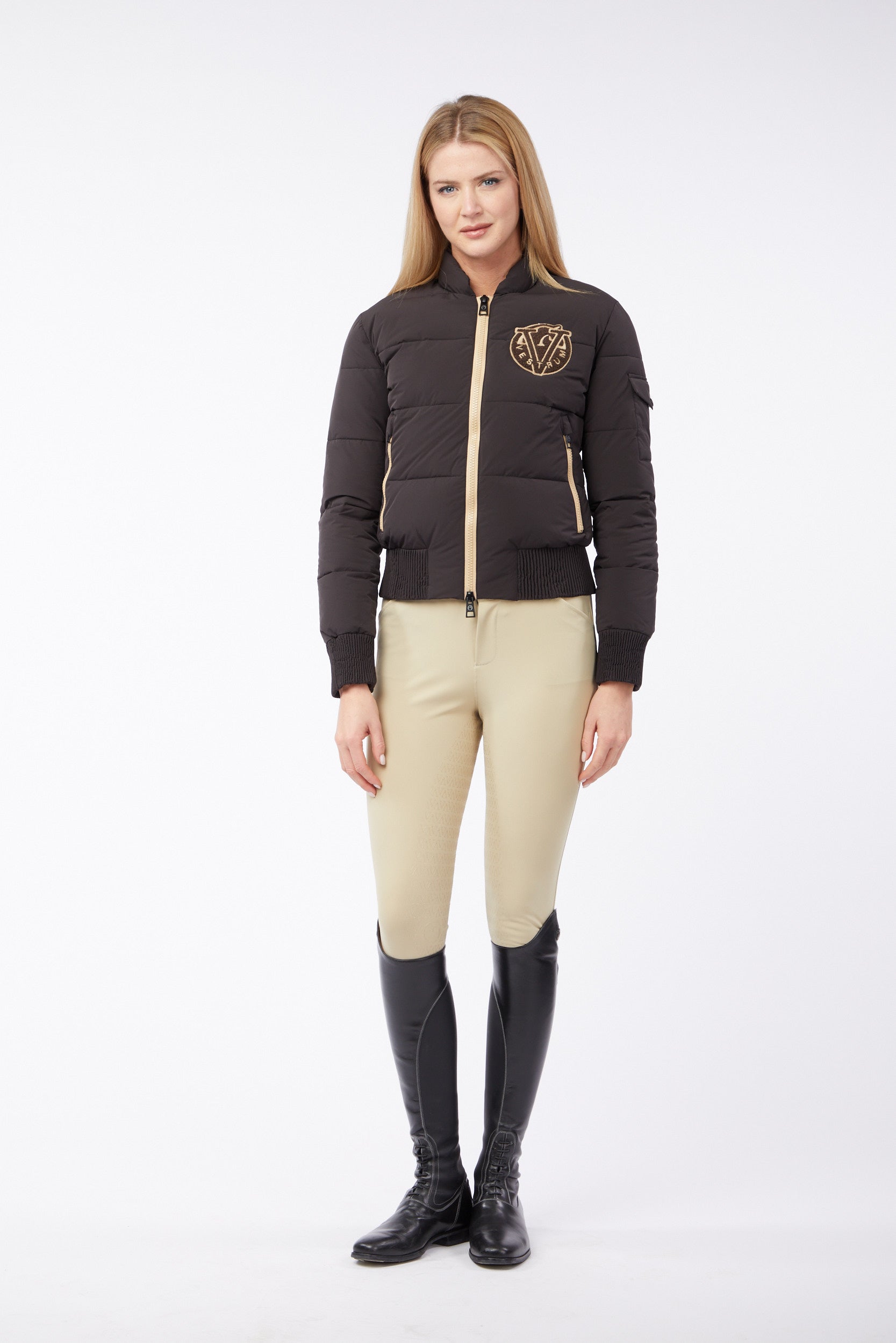 Jacket for women in bomber style, characterized by bottom and ribbed knit cuffs for a comfortable fit. The front features a terry patch with Vestrum embroidery, a distinctive element that enhances the sporty look of the garment. Perfect for training and daily use. Ecodown padding.