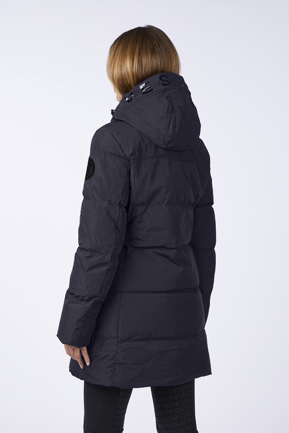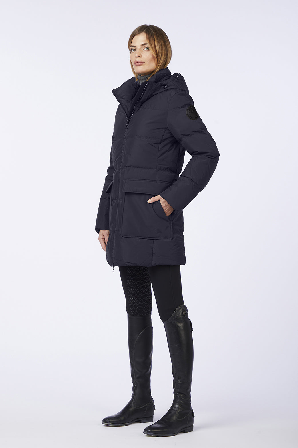 The women's padded windbreaker Piana, is made in a long model with waterproof fabric, front zip closure, contrasting Vestrum logo on the left sleeve. Side pockets closed by hidden button. The adjustable and removable hood has printed the words Vestrum in contrasting color.