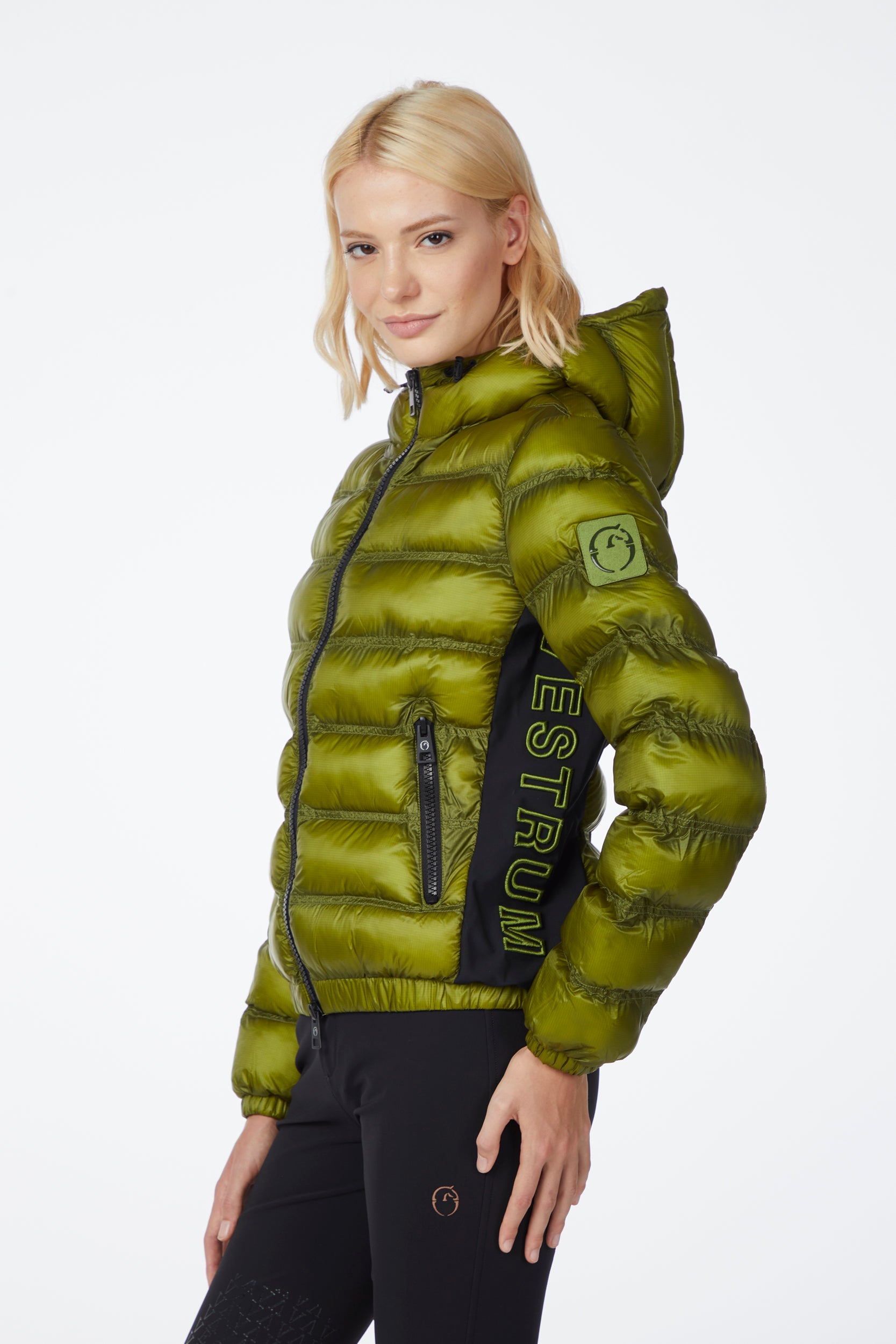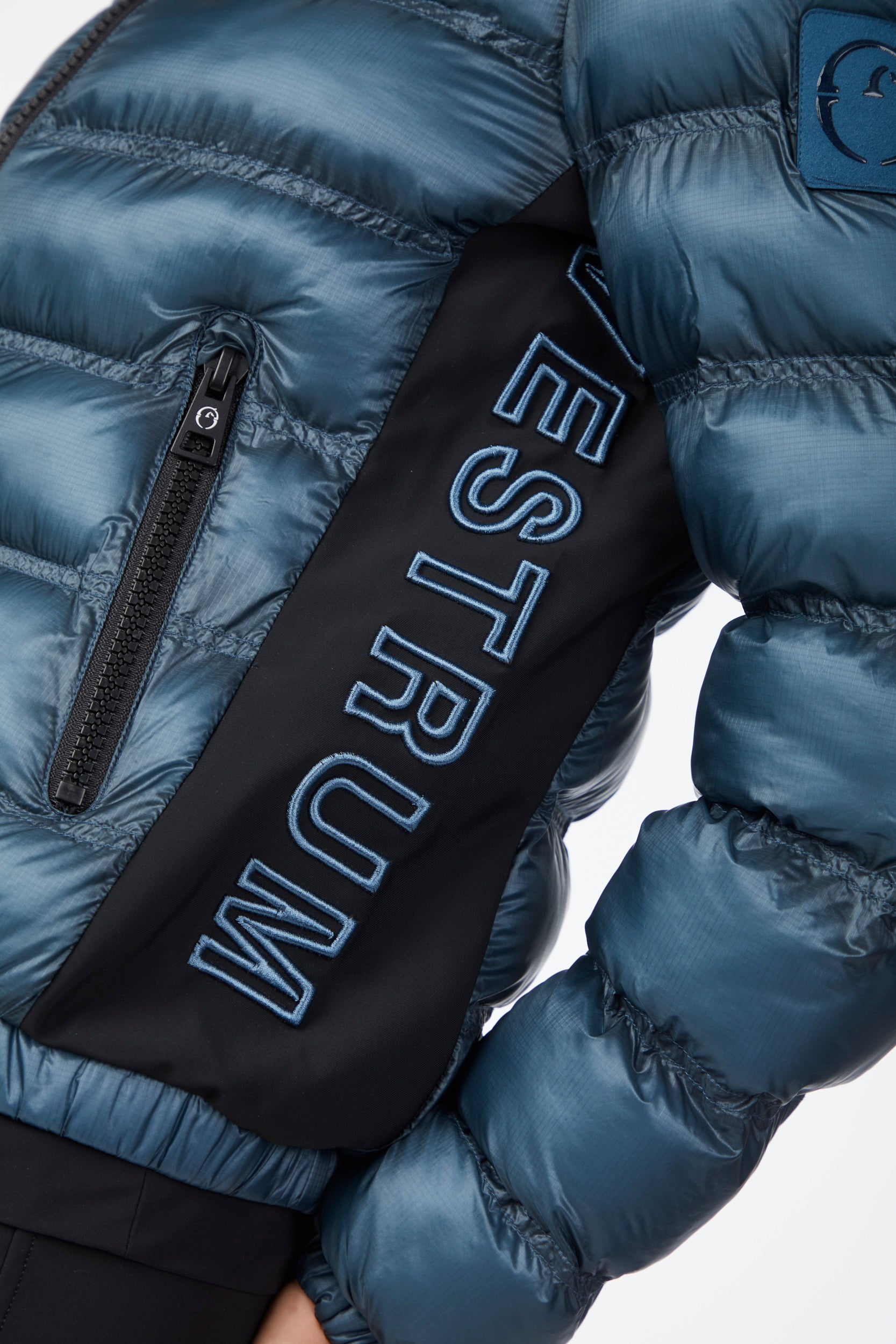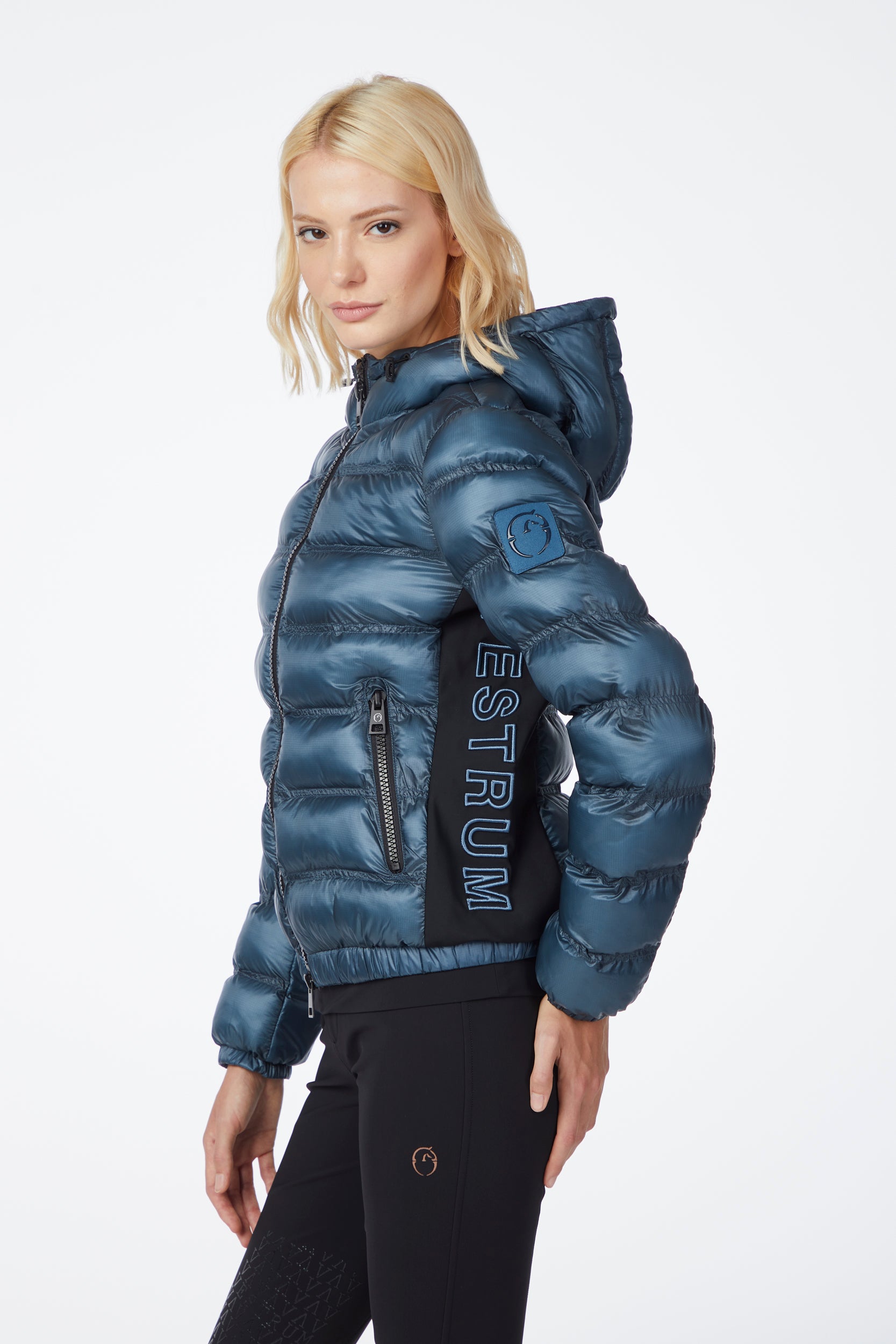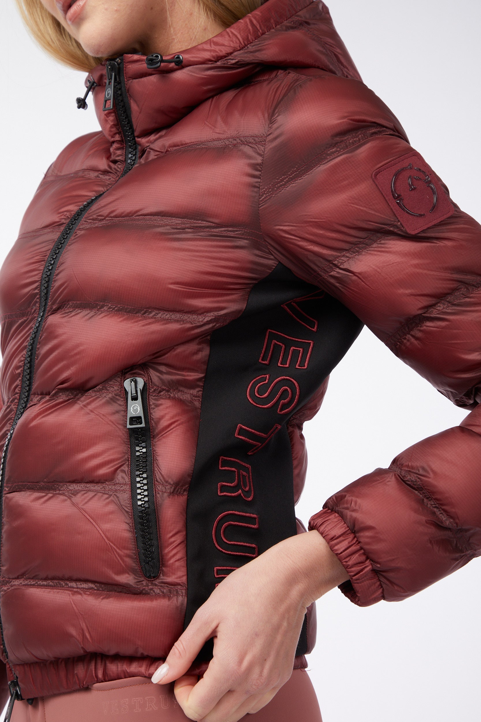 Pusan is a women's jacket made of waterproof and windproof technical nylon, designed to provide protection and comfort on cold days. The contrasting side panels, also in nylon, add a dynamic touch to the design. On the left side there is an embroidery with Vestrum lettering. Padding ecodown.
