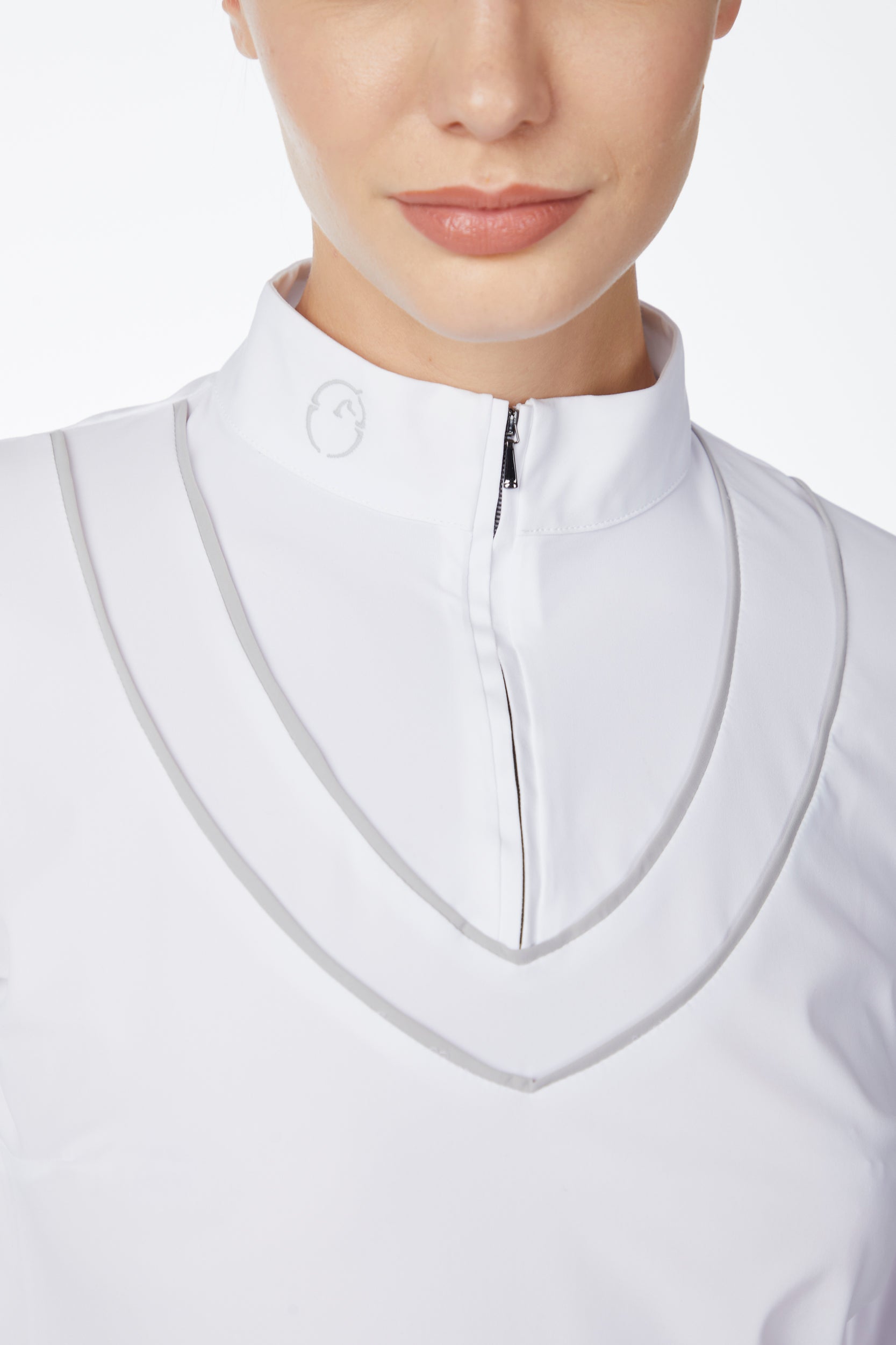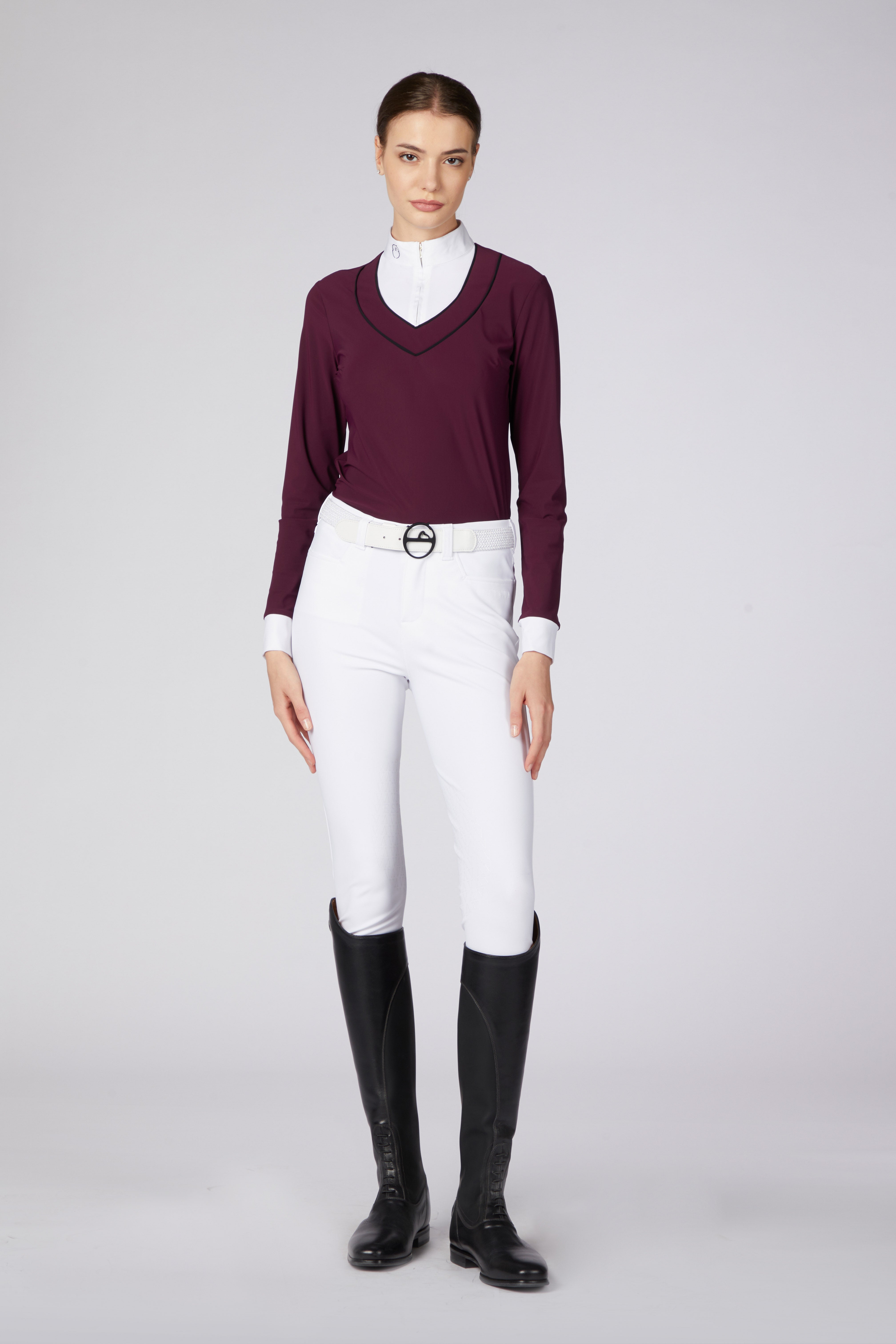 The long-sleeved Reims show shirt offers a comfortable fit and maximum freedom of movement. Its design is distinguished by the contrasting bib with a refined geometric pattern and the collar embellished with the logo. Designed for amazons who want to express elegance and femininity even in competition.