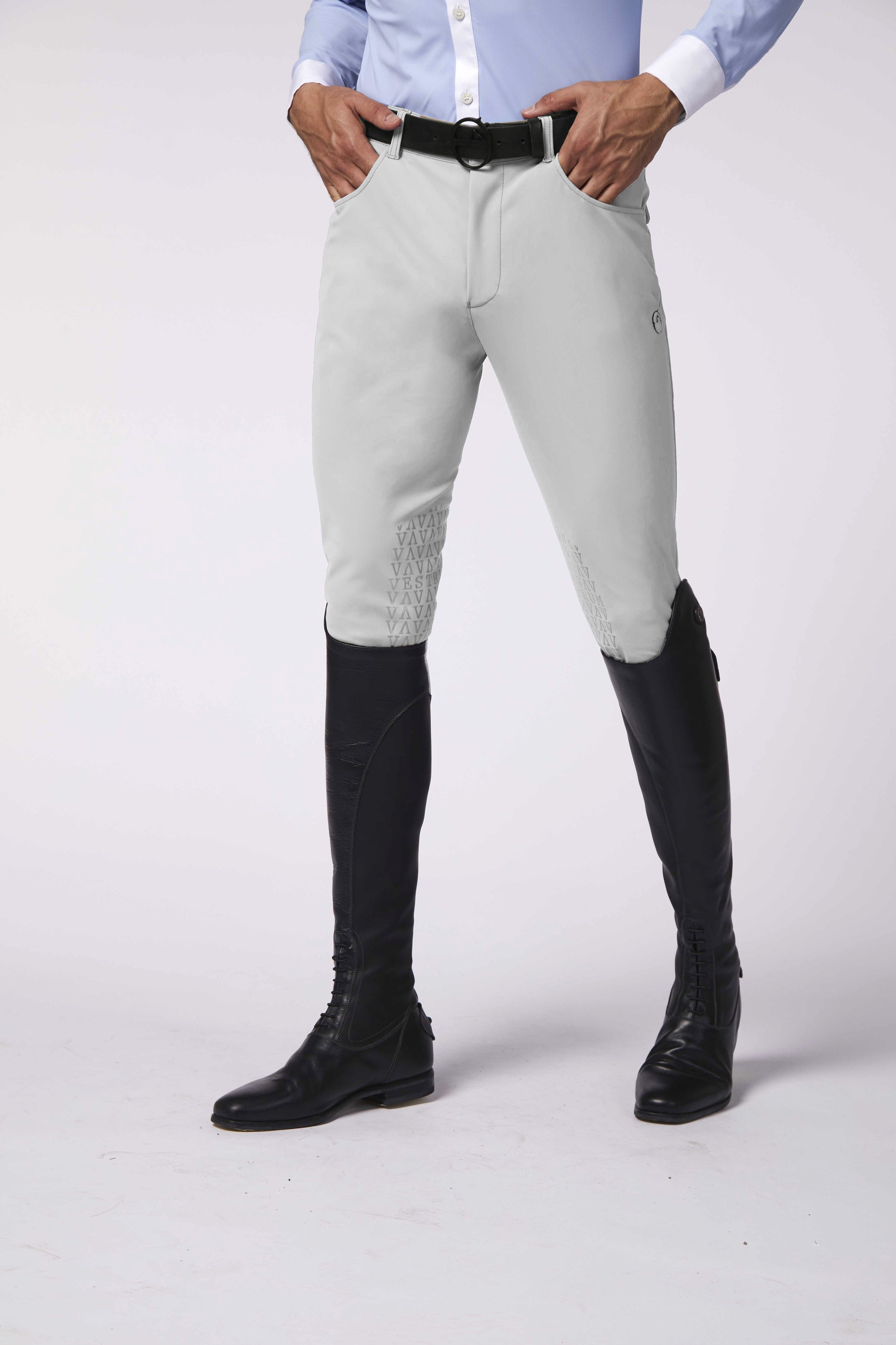 The Trieste men's riding breeches have a regular fit. The TK fabric used for these breeches is bi-elastic, very light and ensures greater comfort in movement. Silicone grip inserts on the knee ensure a firm grip. There are two pockets with rounded flaps on the back closed with a personalised snap fastener.