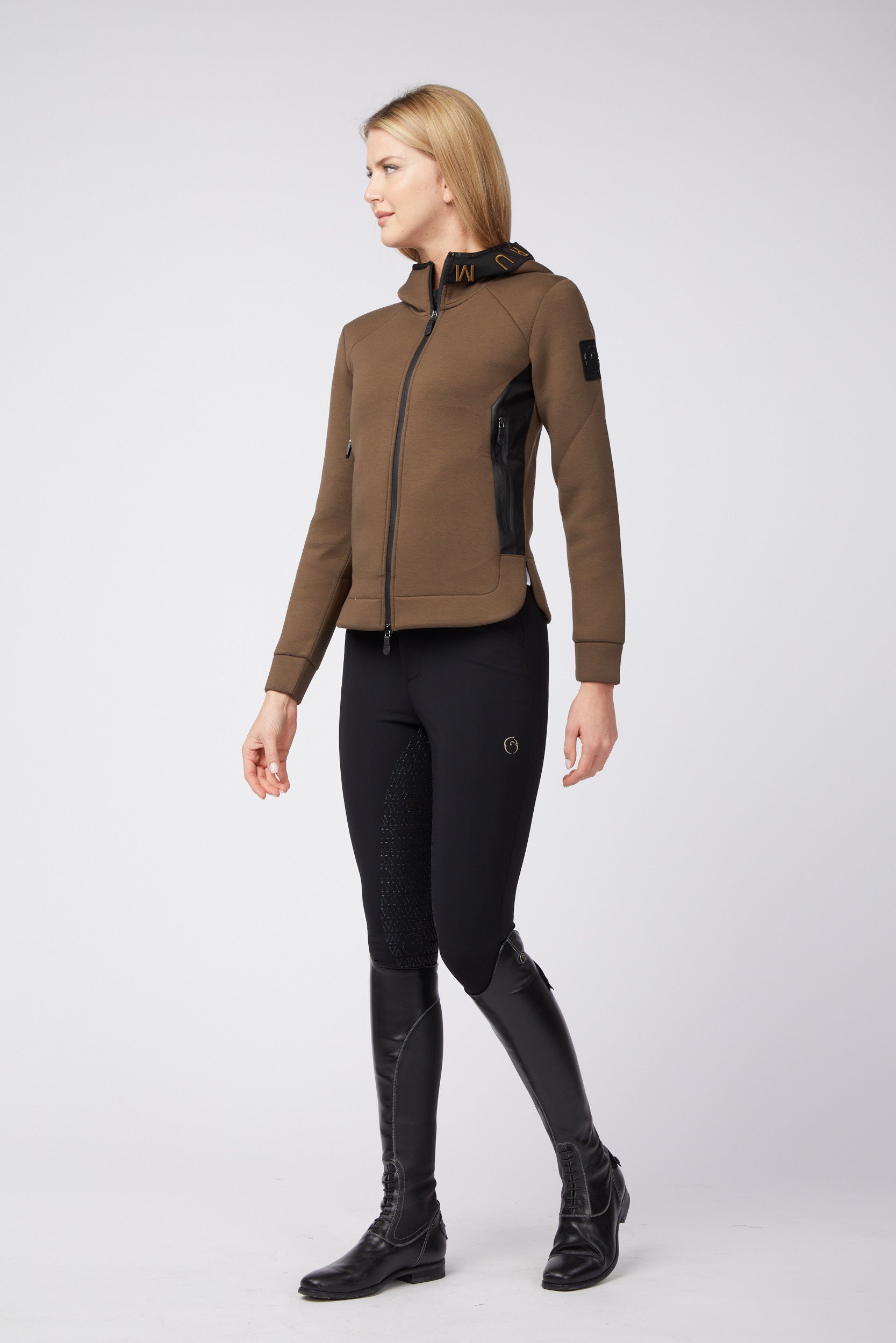 Women's softshell jacket made of technical fabric. The softshell allows you to gently accompany each movement and ensures proper breathability. Born as a training jacket, it is also suitable for daily activities. The contrasting hood is embellished with an embroidery with tone on tone lettering.