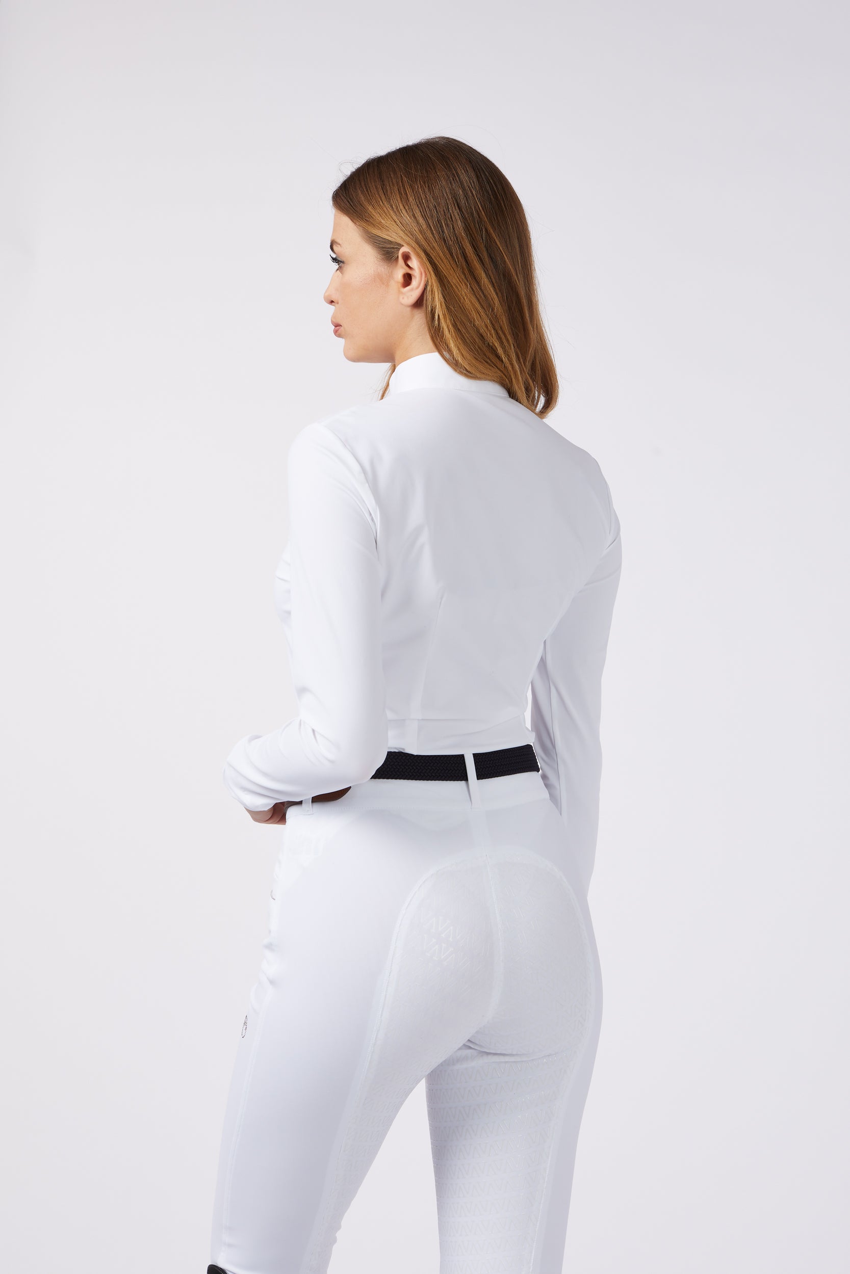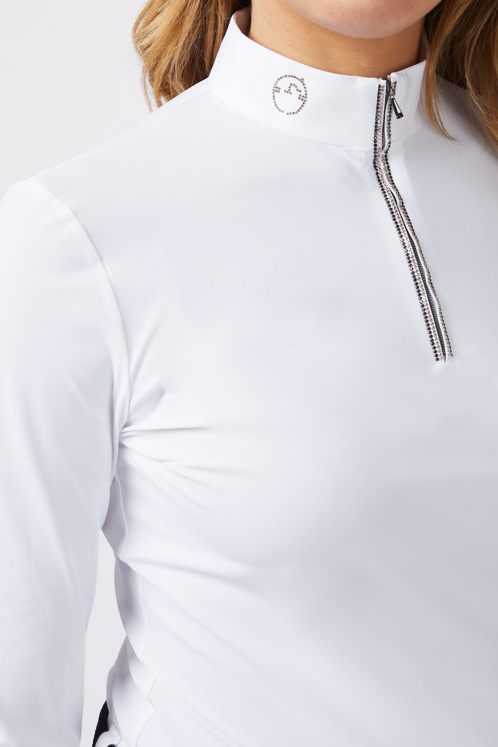 The Villanova women's show shirt is designed for all-weather competition with the best comfort. Long sleeve, poplin collar with embroidered logo. Small front zipper with mini studs.